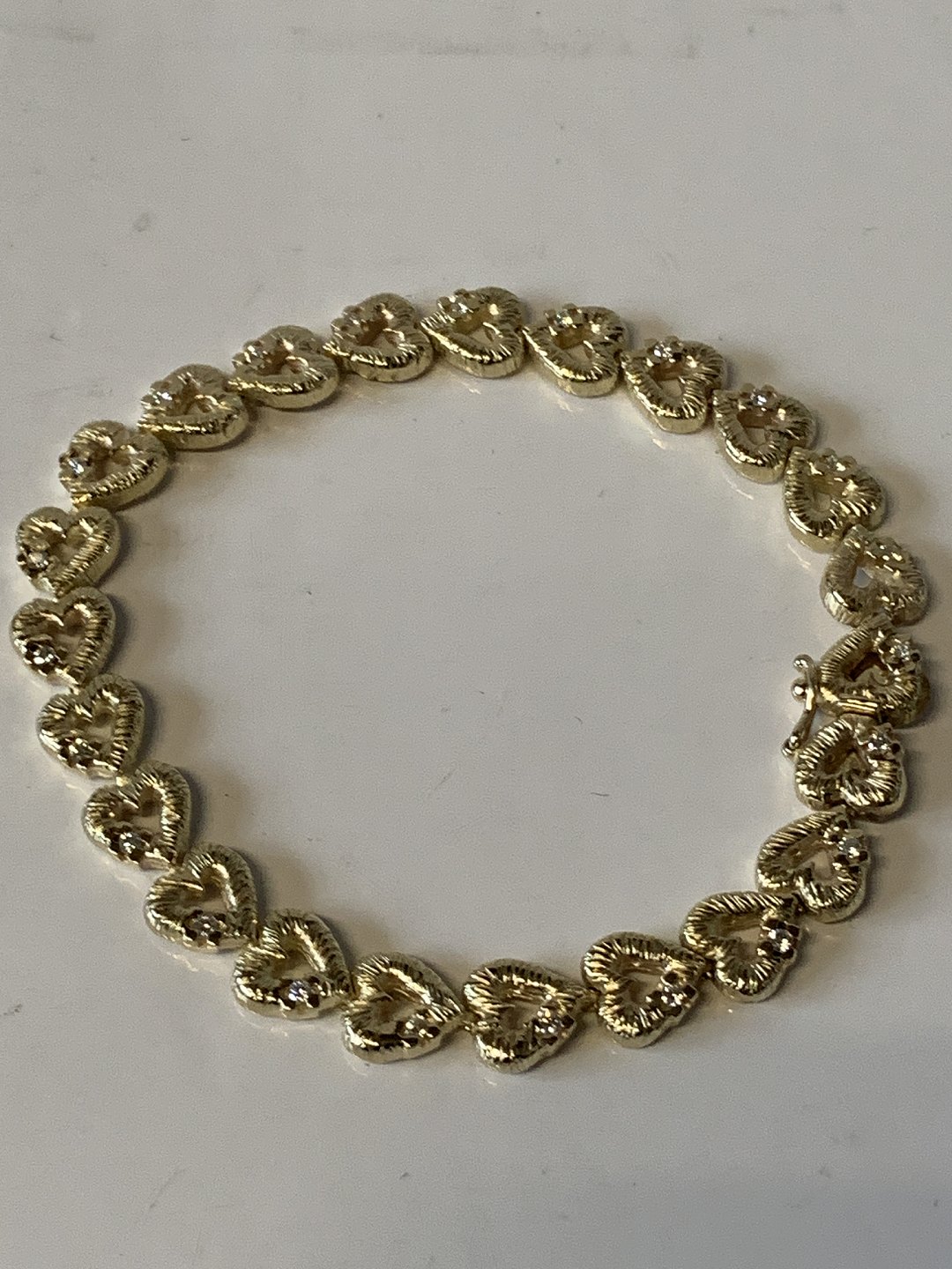 Unikt guldarmbånd med hjerteformet led, hvori der ligger en diamant. Leddene er dekoreret med ciseleringer, der giver armbåndet et blødt fløjlsagtigt udtryk. Derfor er dette guldarmbånd noget helt særligt, man ikke finder særlig tit. Et utrolig smuk og feminint guldarmbånd, der især kan bruges ved festlige lejligheder.