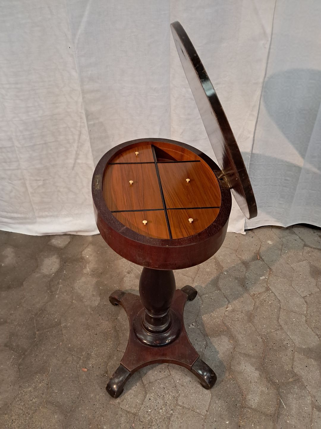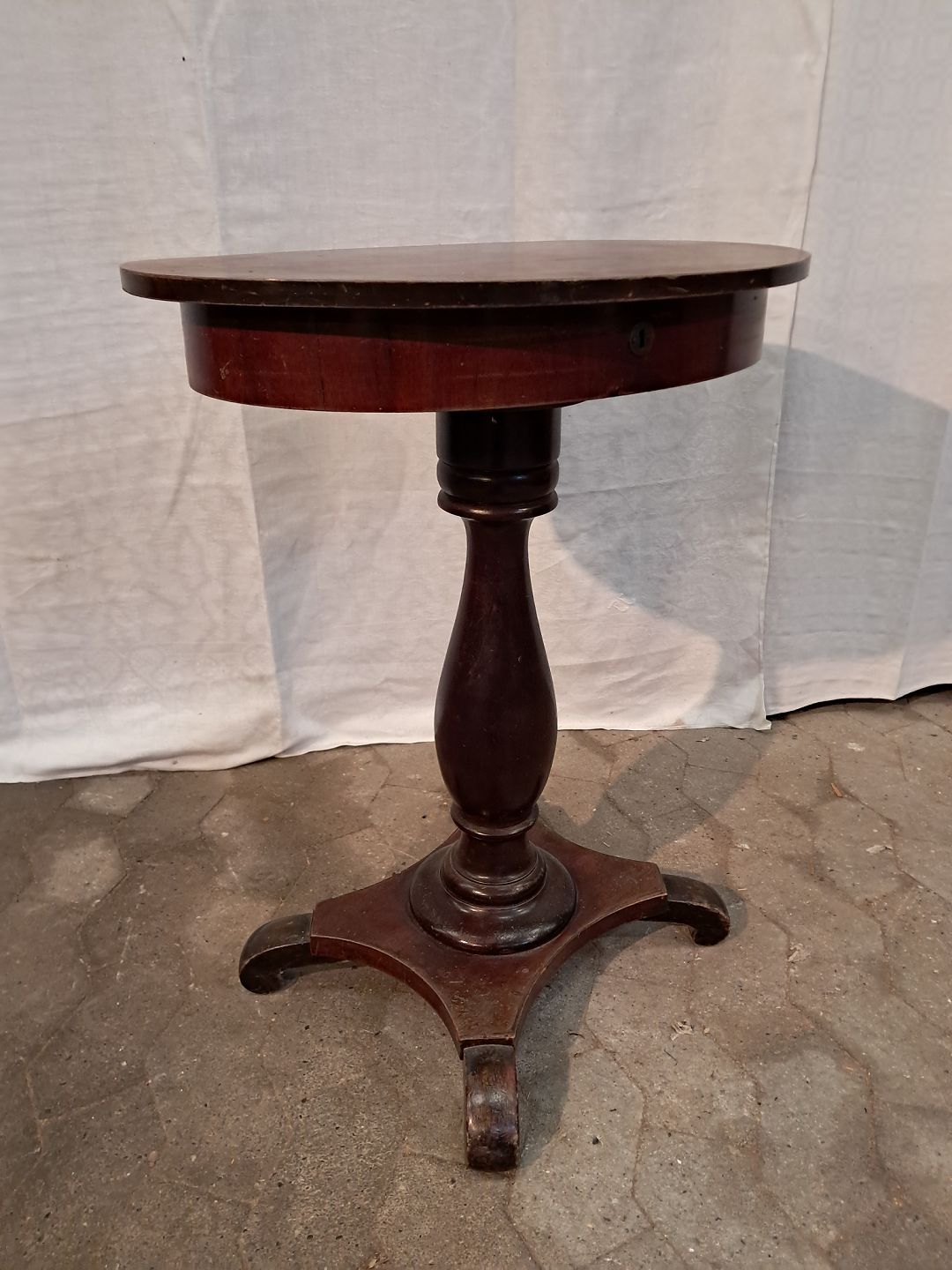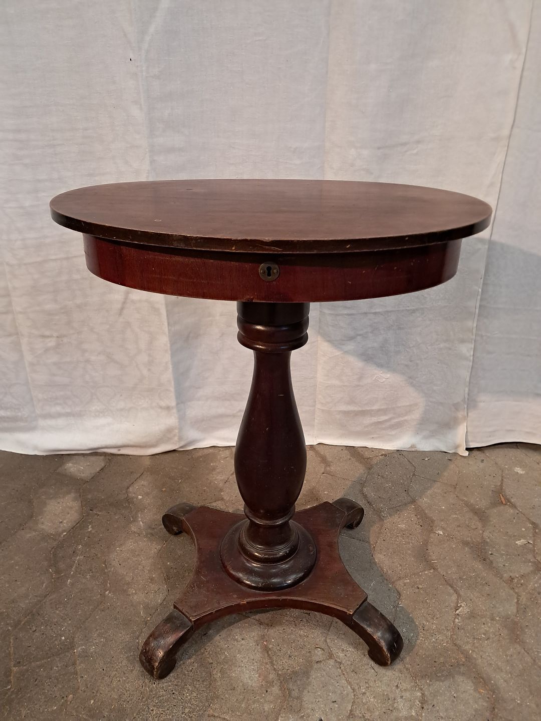 Gammelt søjlebord i fineret mahogni og massivt bøgetræ, fra 1900erne.
