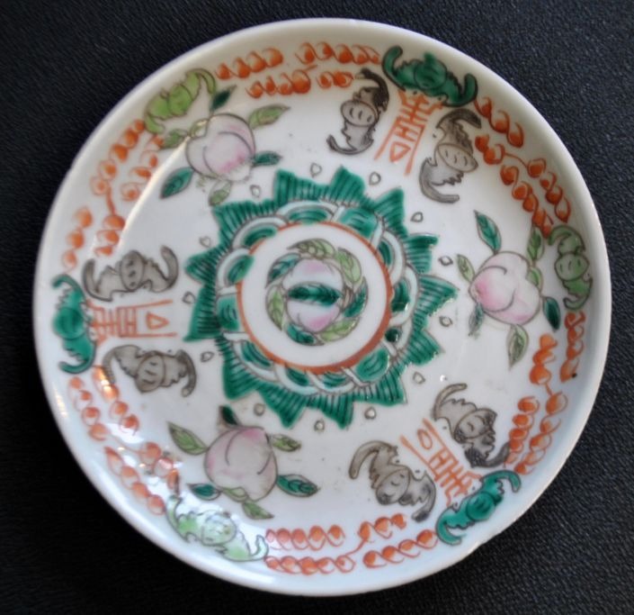 Kinesisk porcelains tallerken, polykron dekoreret, 19. årh. Motiv med ferskner og flagermus. Signeret. Dia: 16,5 cm.