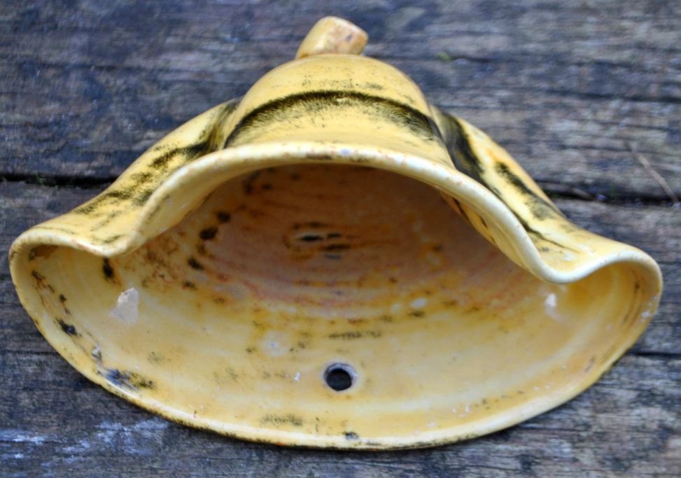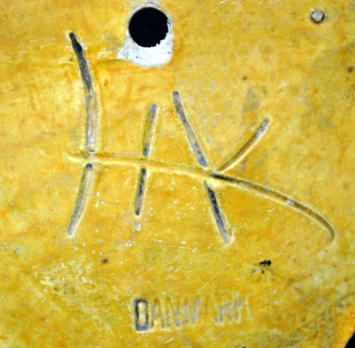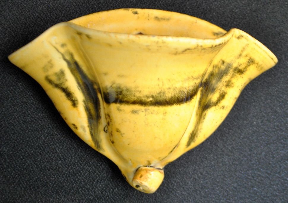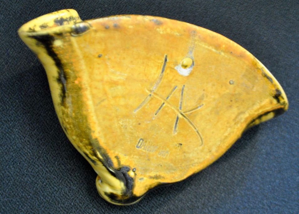 Herman A. Kähler wall vase uranium yellow glaze, c. 1930. Næstved, Denmark. Height.: 12 cm. W.: 17.5 cm. Signed.: HAK and DENMARK.
