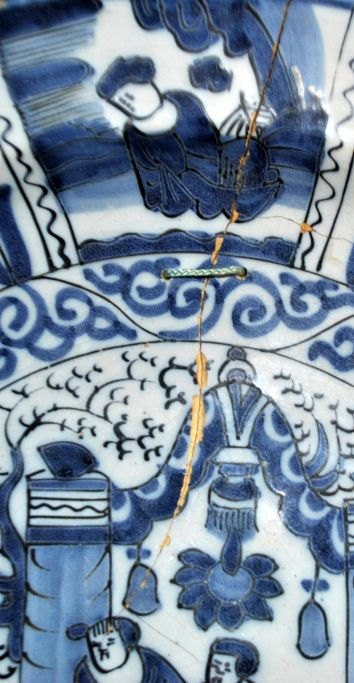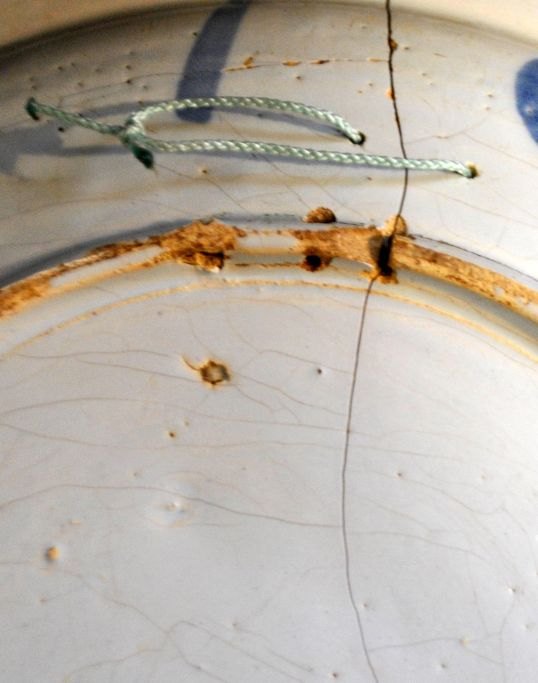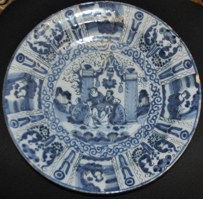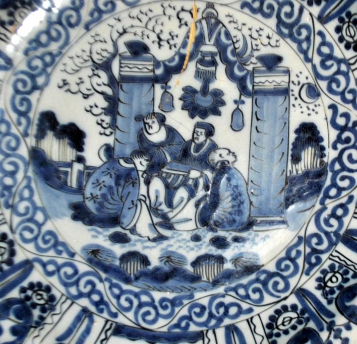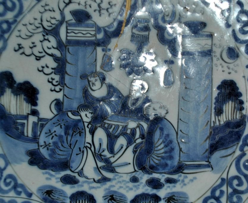 Stort hollandsk fajancefad, 1680 - 1760, Delft. Blå/hvid dekoration med kineserier. Den kinesiske stil - 2. periode. Dia: 34,5 cm. H.: 6 cm.
