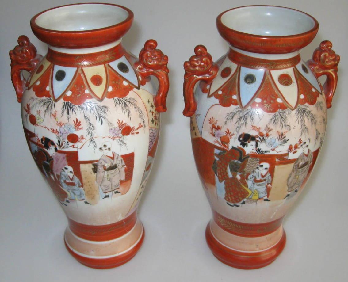 Pair satsuma vases, about 1900 Japan. Polychrome decoration with scenes of birds and woman and two children. With handles. H .: 26 cm. Signed. Flawless!