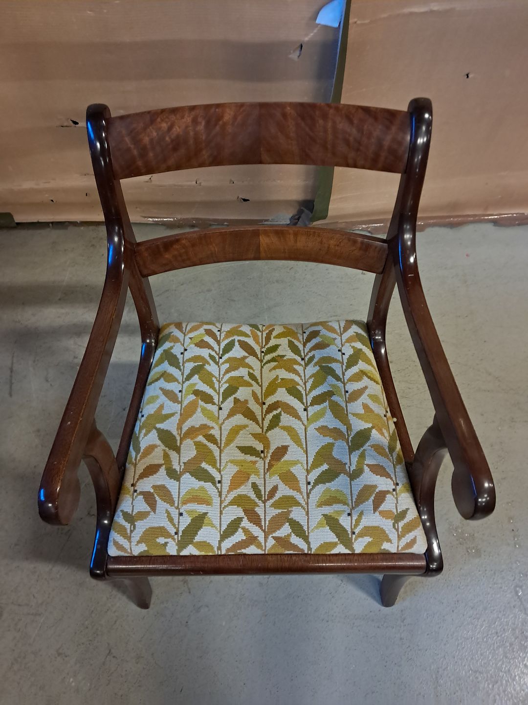 Armstol i mahogni og bøgetræ med broderet betræk, fra 1910erne.