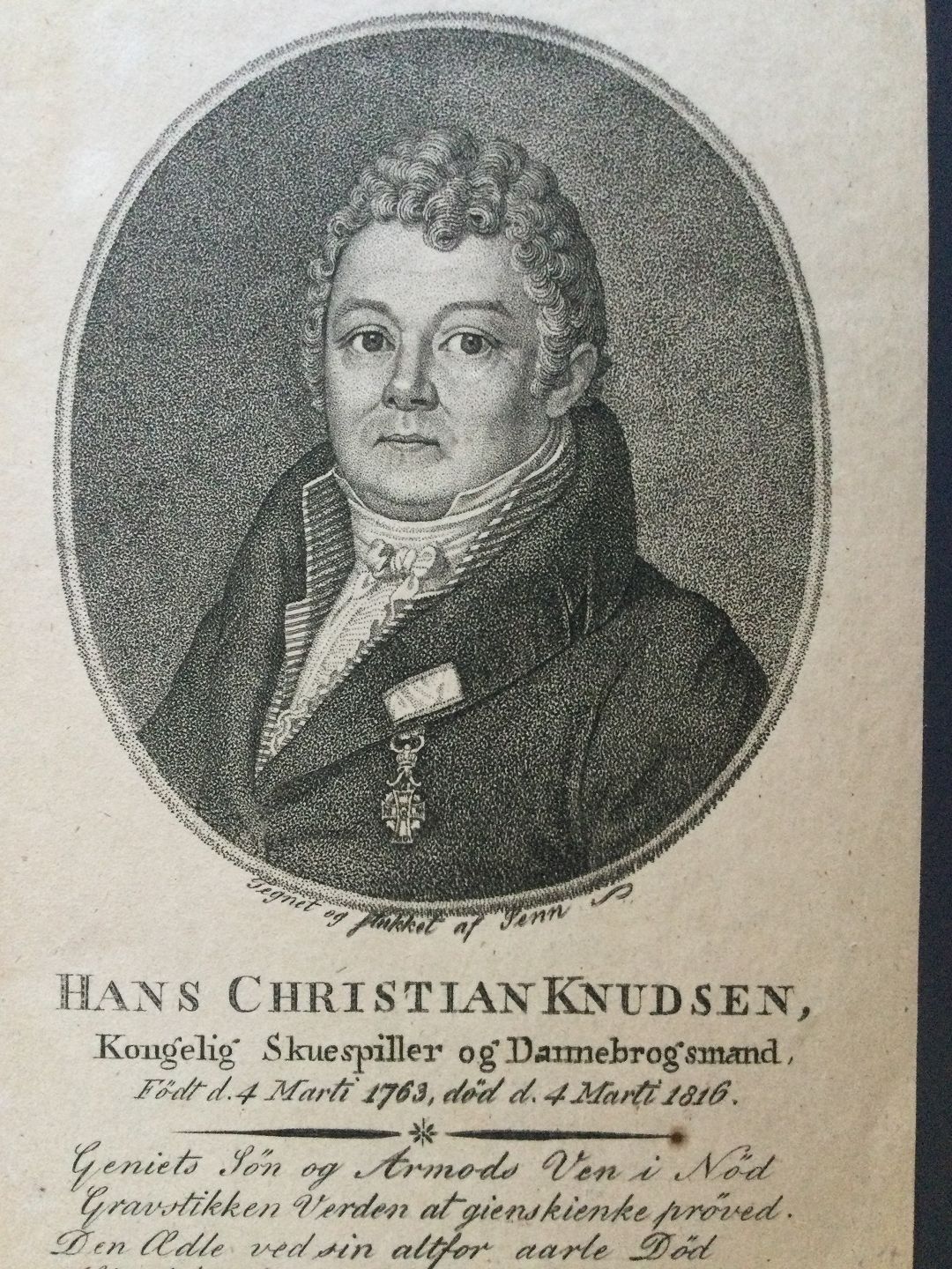 Kobberstik af Johannes Senn - Portræt af Kongelig Skuespiller Christian Knudsen.
