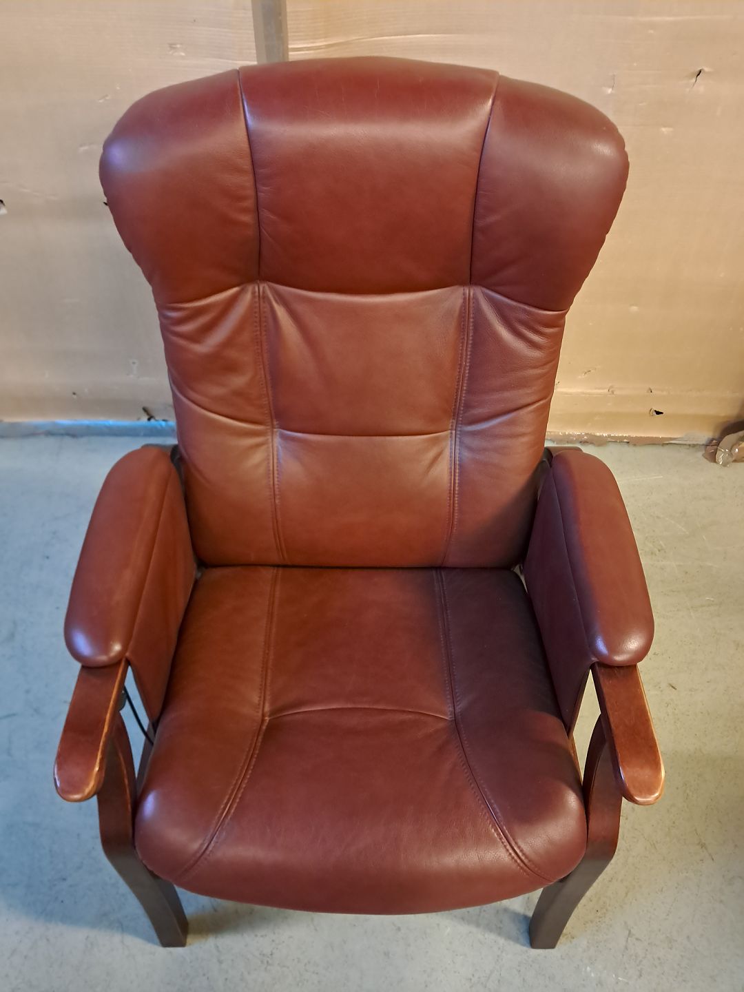 Lænestol i bøgetræ og kunstlæder, fra 1990erne.