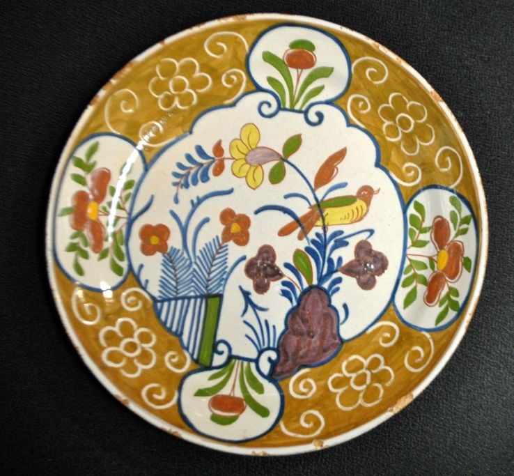 Delft tallerken, ca. 1750, Holland. Polycromt dekoreret fad i gult, grønt, blåt og rødt. Dekoreret med fugl i en busk. Dia.: 23 cm. Den Japanske Stil.  NB: Med små kanthak!