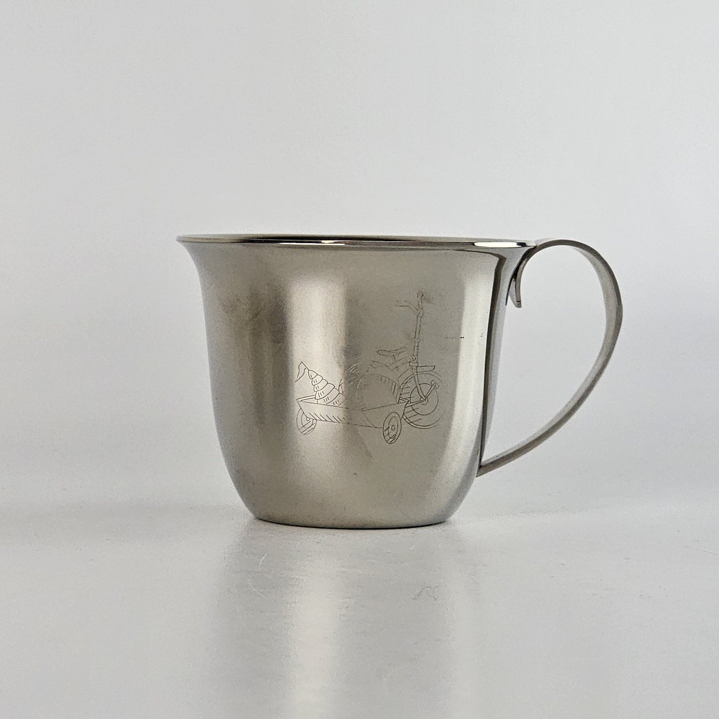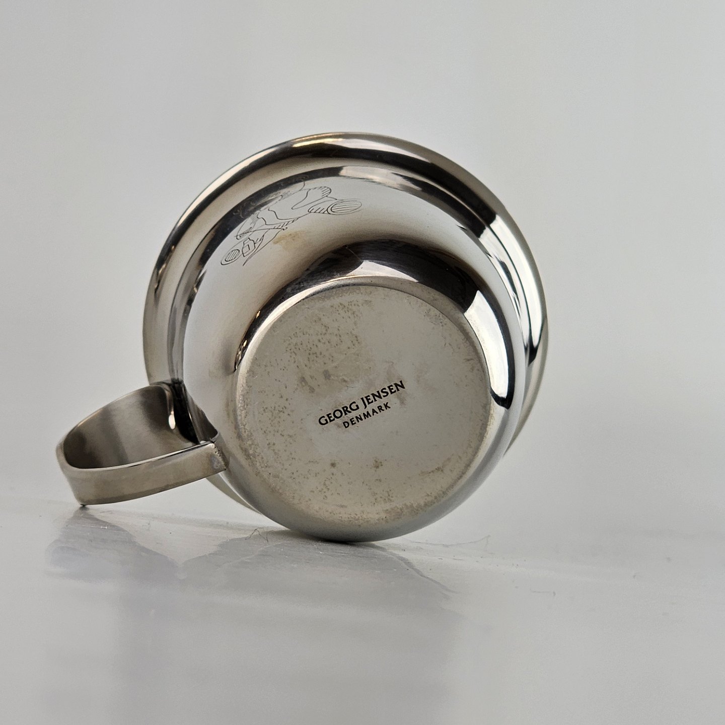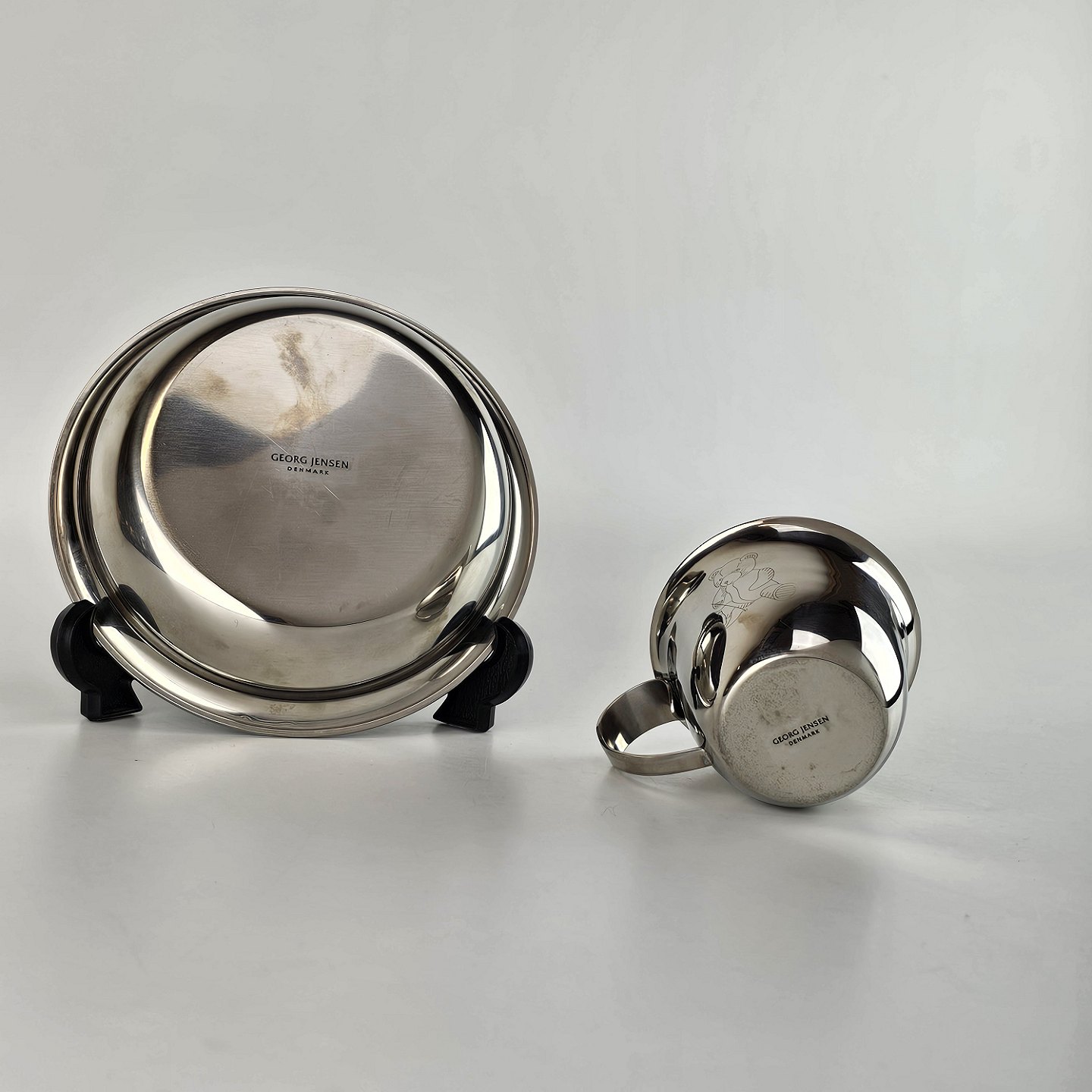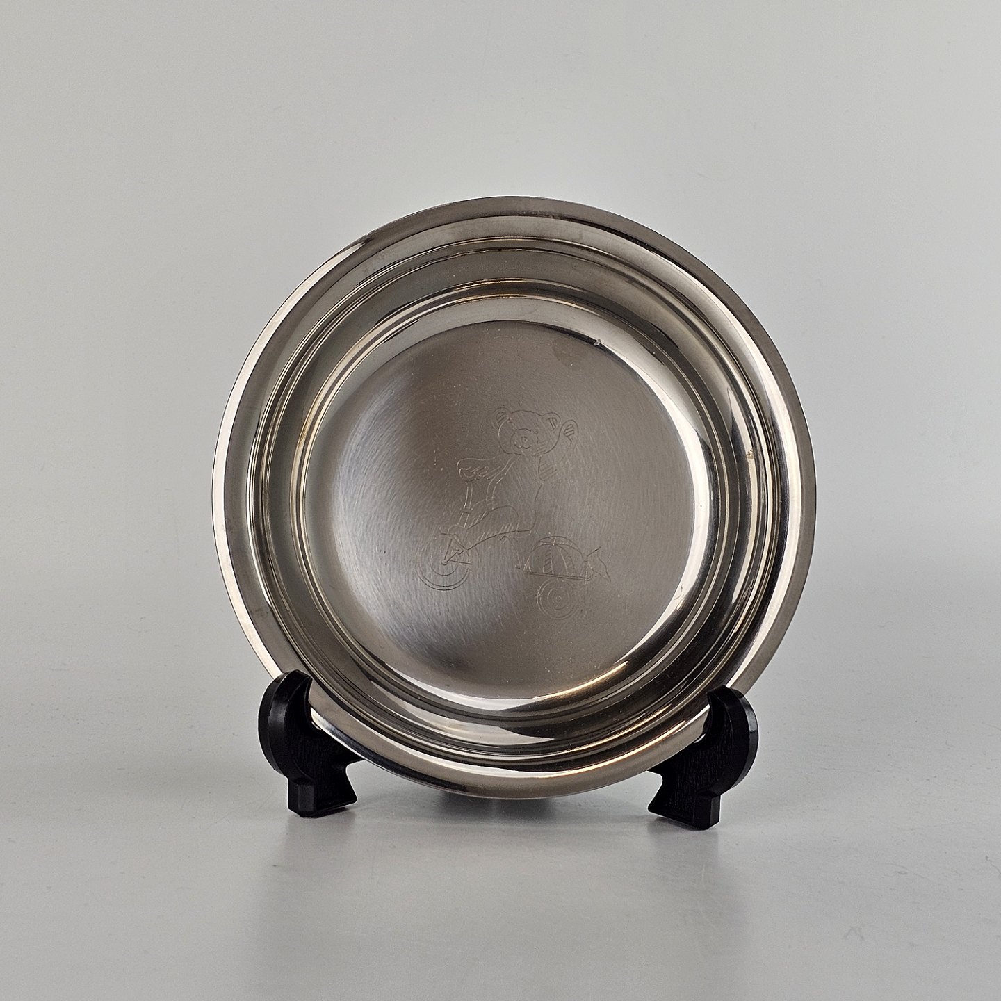 Tallerken og kop i rustfrit stål med motiv af bamser. Julius.