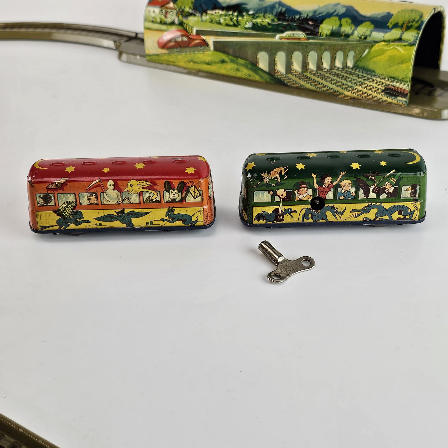 Togbane i blik, med to optrækkelige togvogne og tunnel med sjove motiver. Nøgle medfølger.