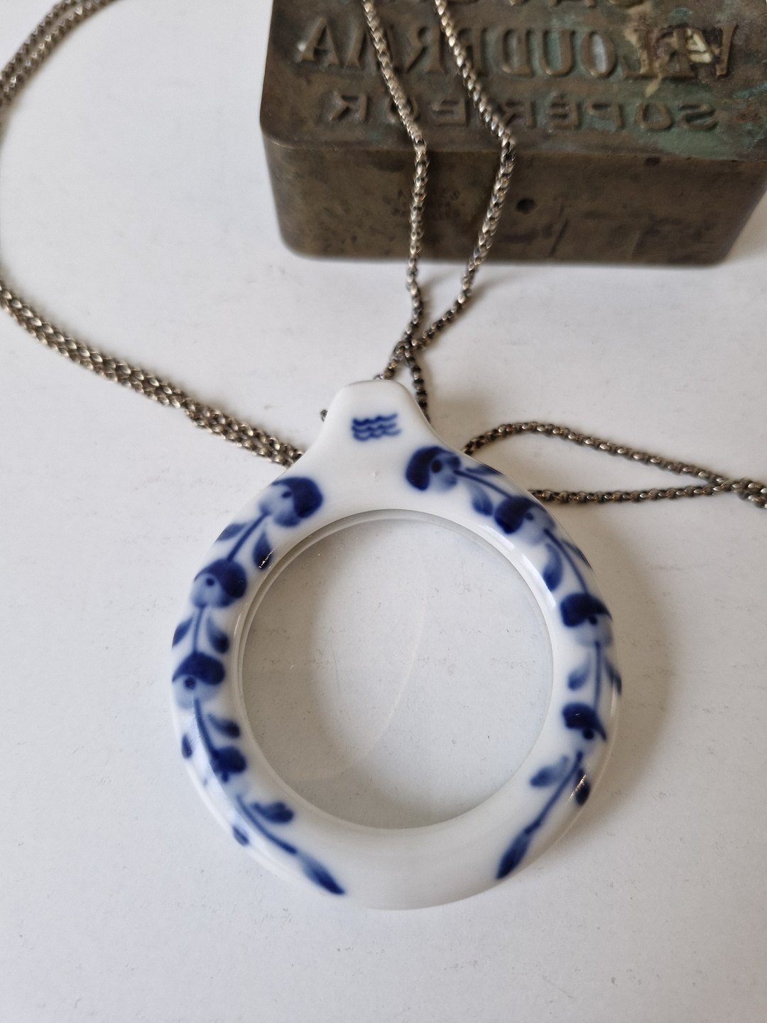 Royal Copenhagen forstørrelsesglas i porcelænsramme dekoreret med blå blomster i lang kæde