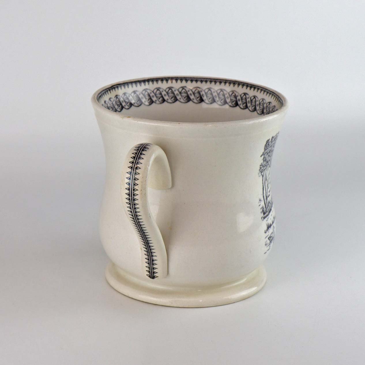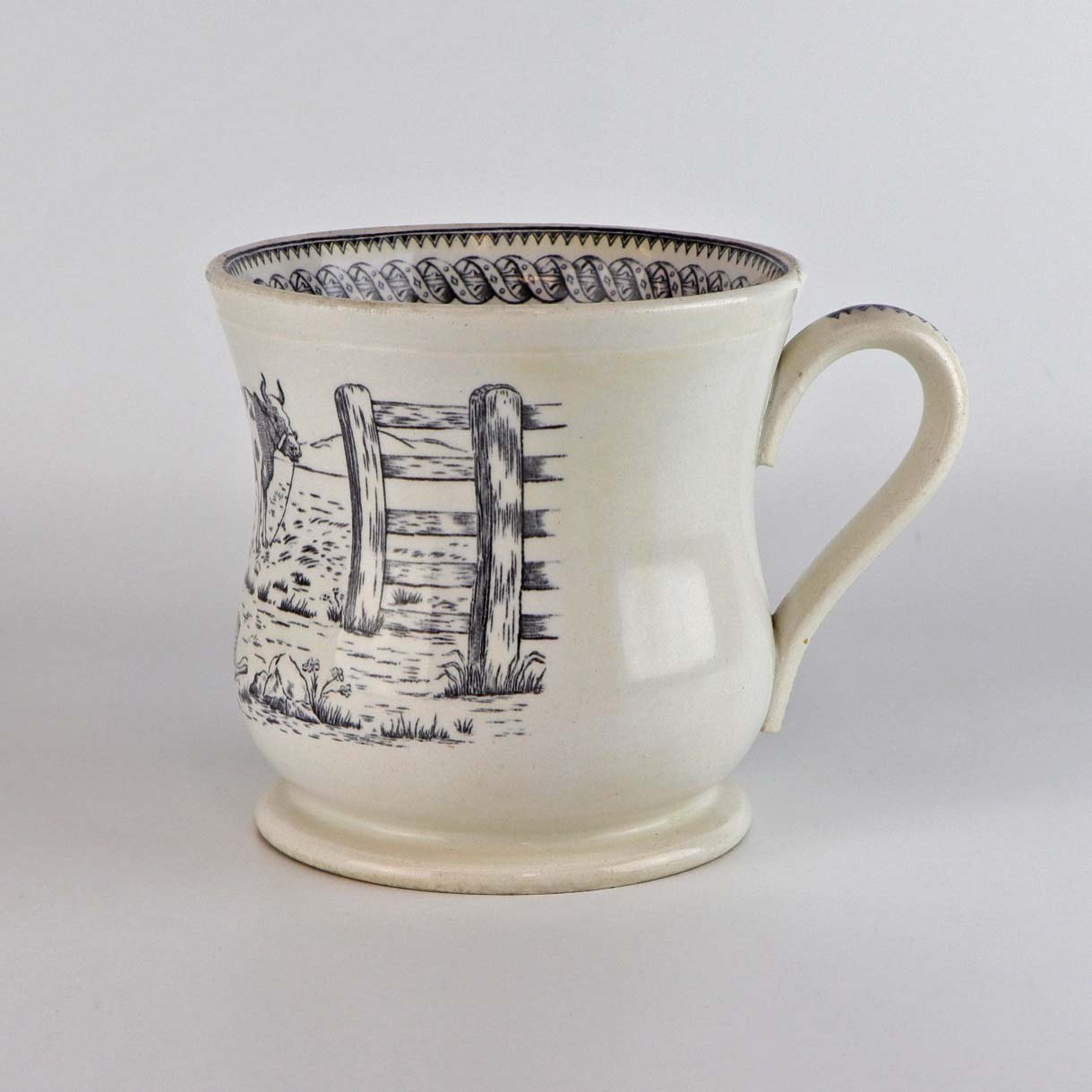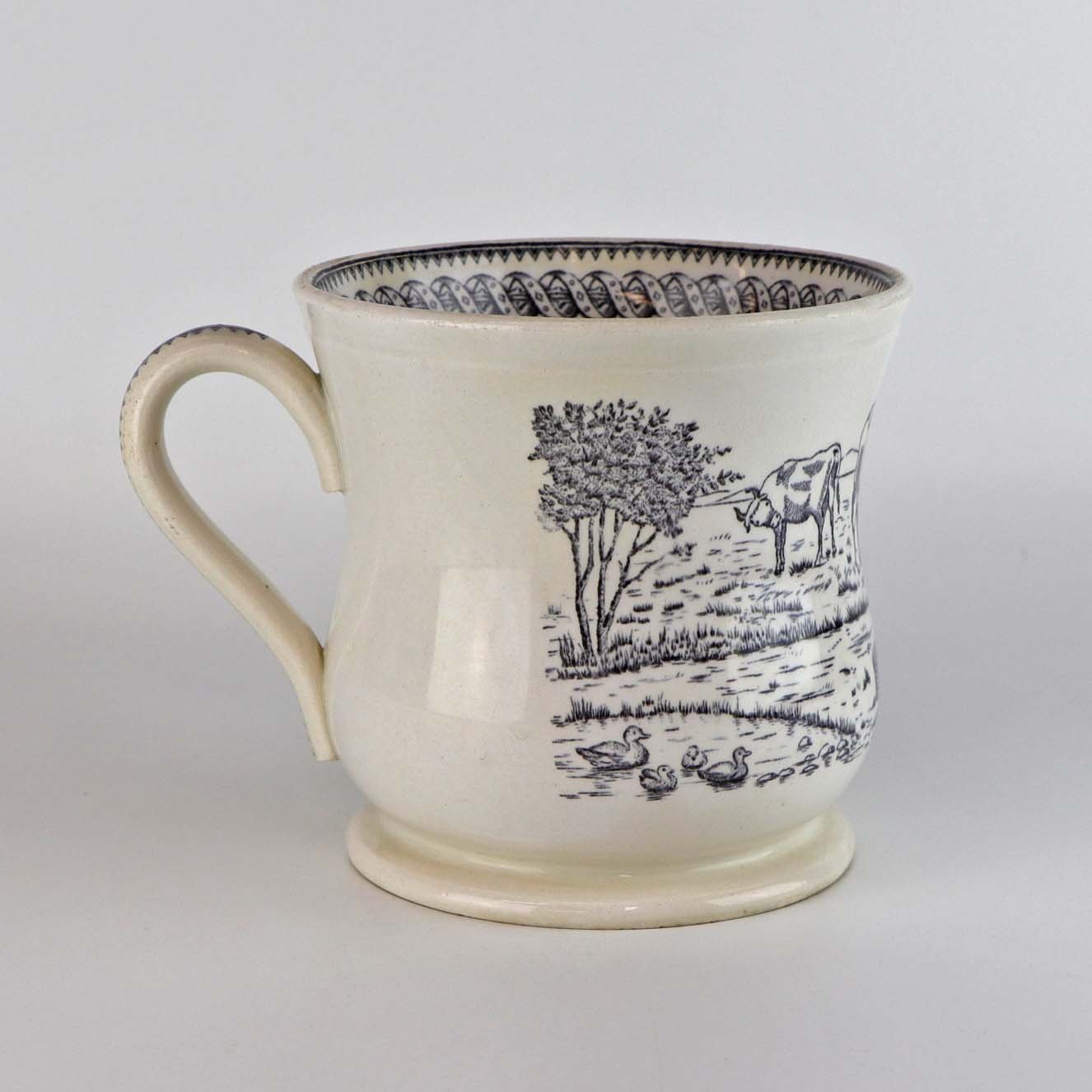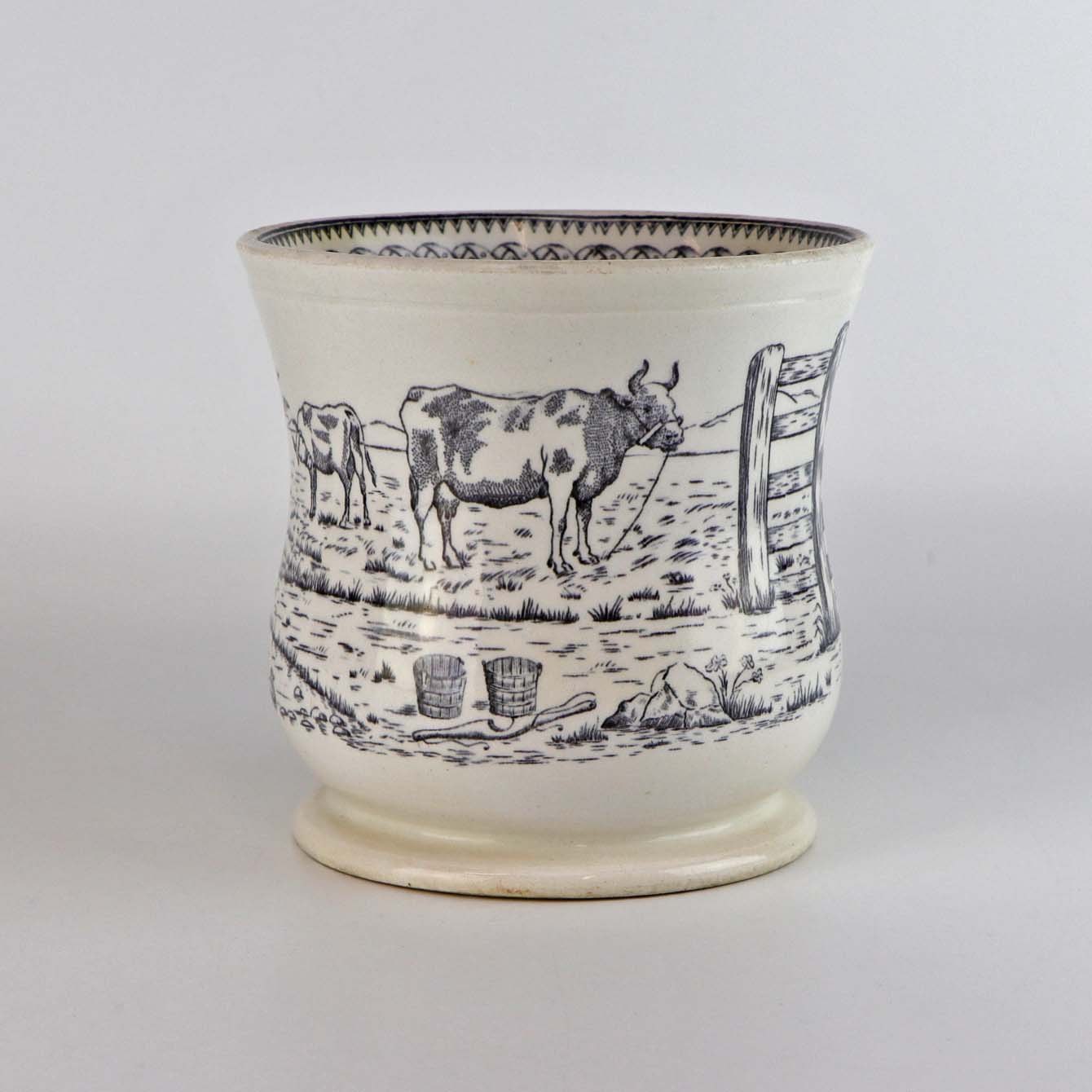 Antik ølkrus i fajance, som også er kendt under navnet Portlands krus. Dette krus er fremstillet i perioden år 1870-1923 og er dekoreret med kobbertryk i blå og sort farve med motiv af køer på mark og ved hegn