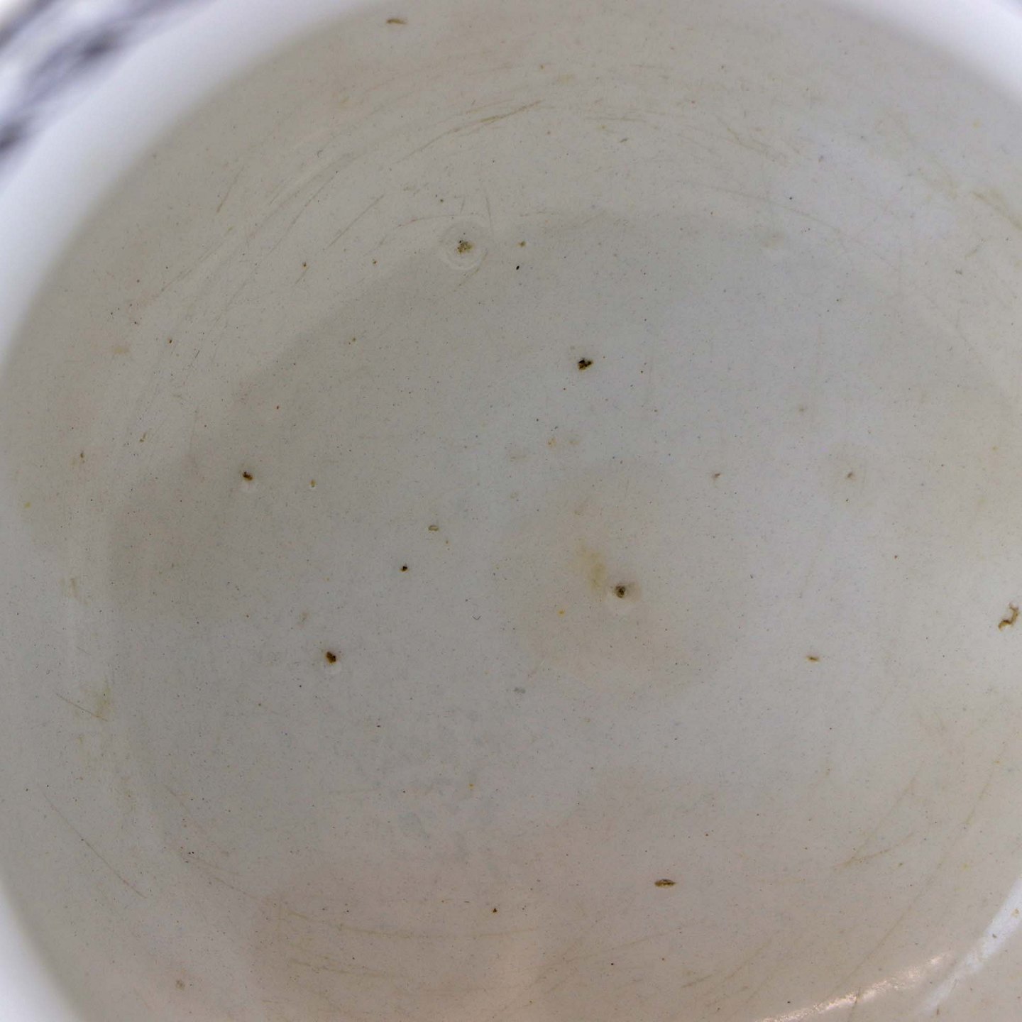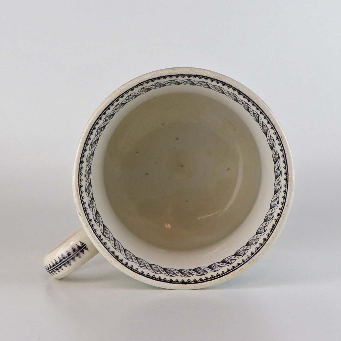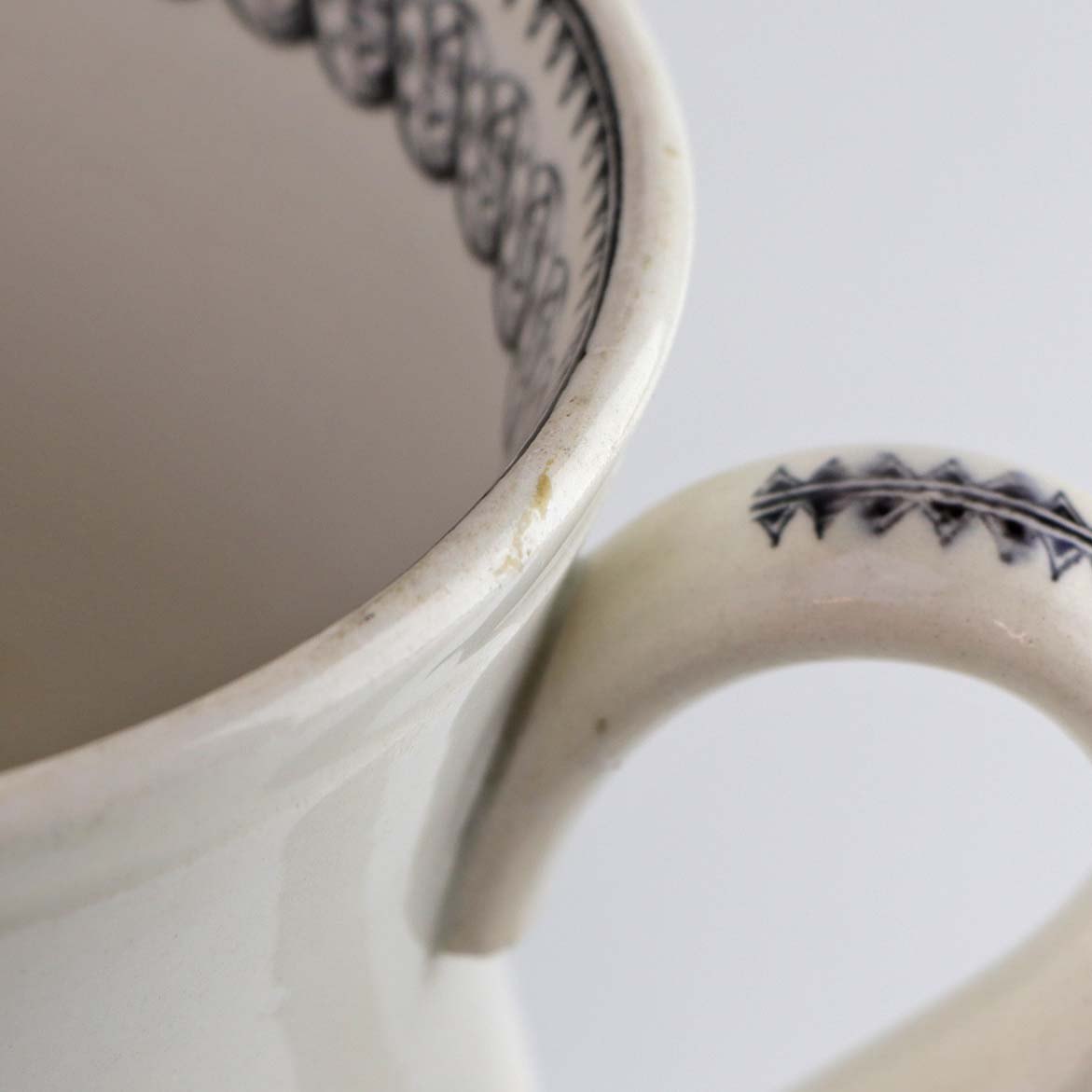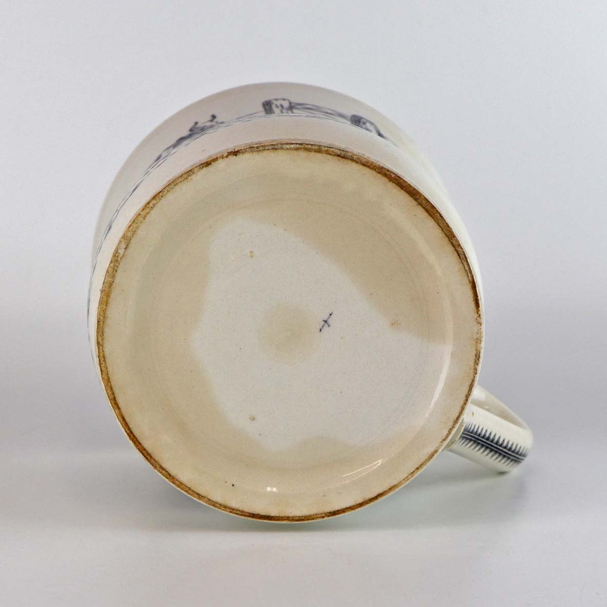 Antik ølkrus i fajance, som også er kendt under navnet Portlands krus. Dette krus er fremstillet i perioden år 1870-1923 og er dekoreret med kobbertryk i blå og sort farve med motiv af køer på mark og ved hegn