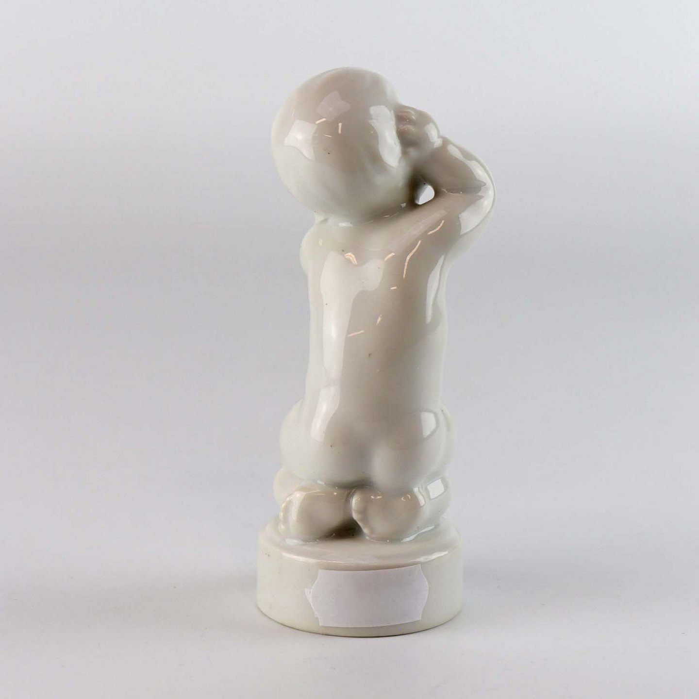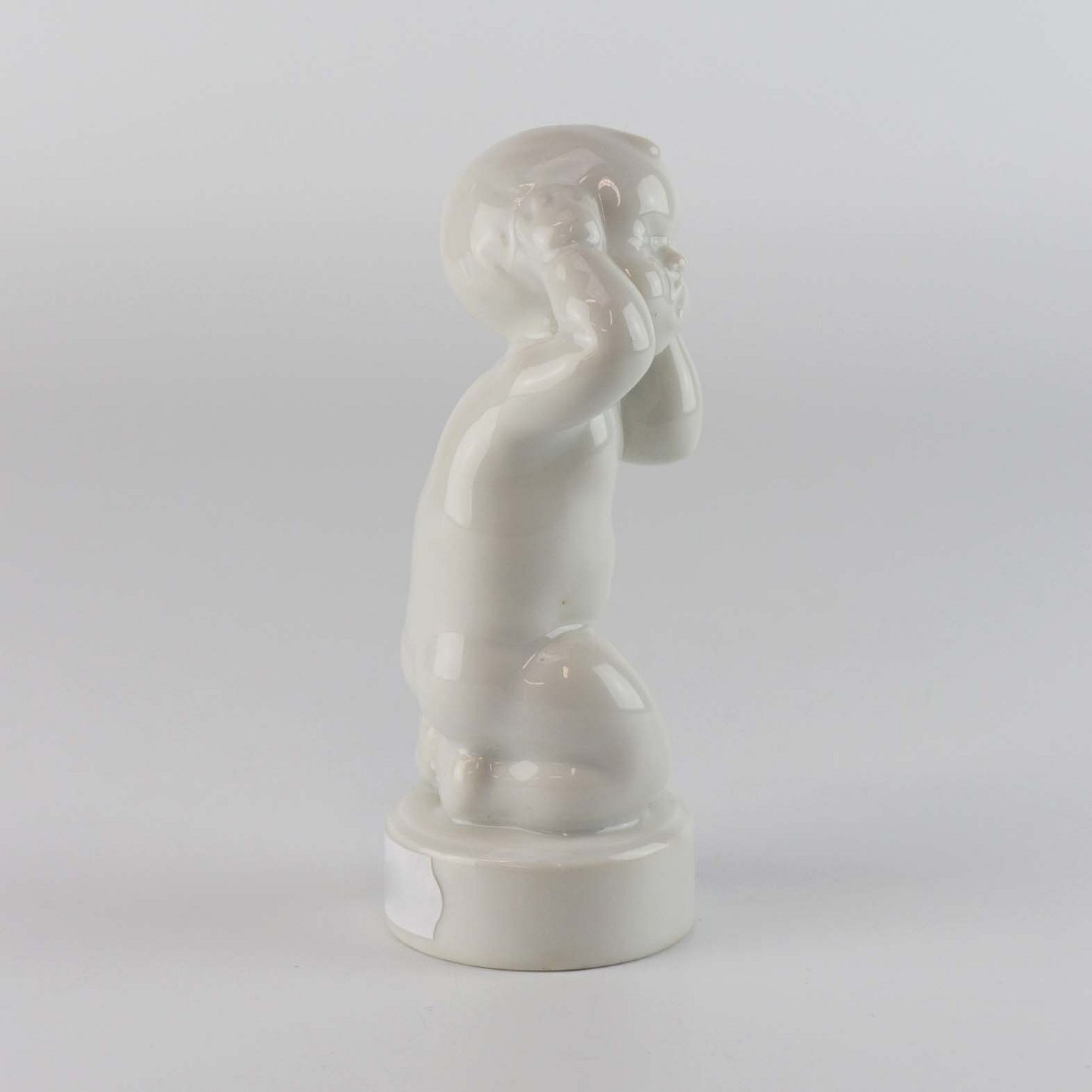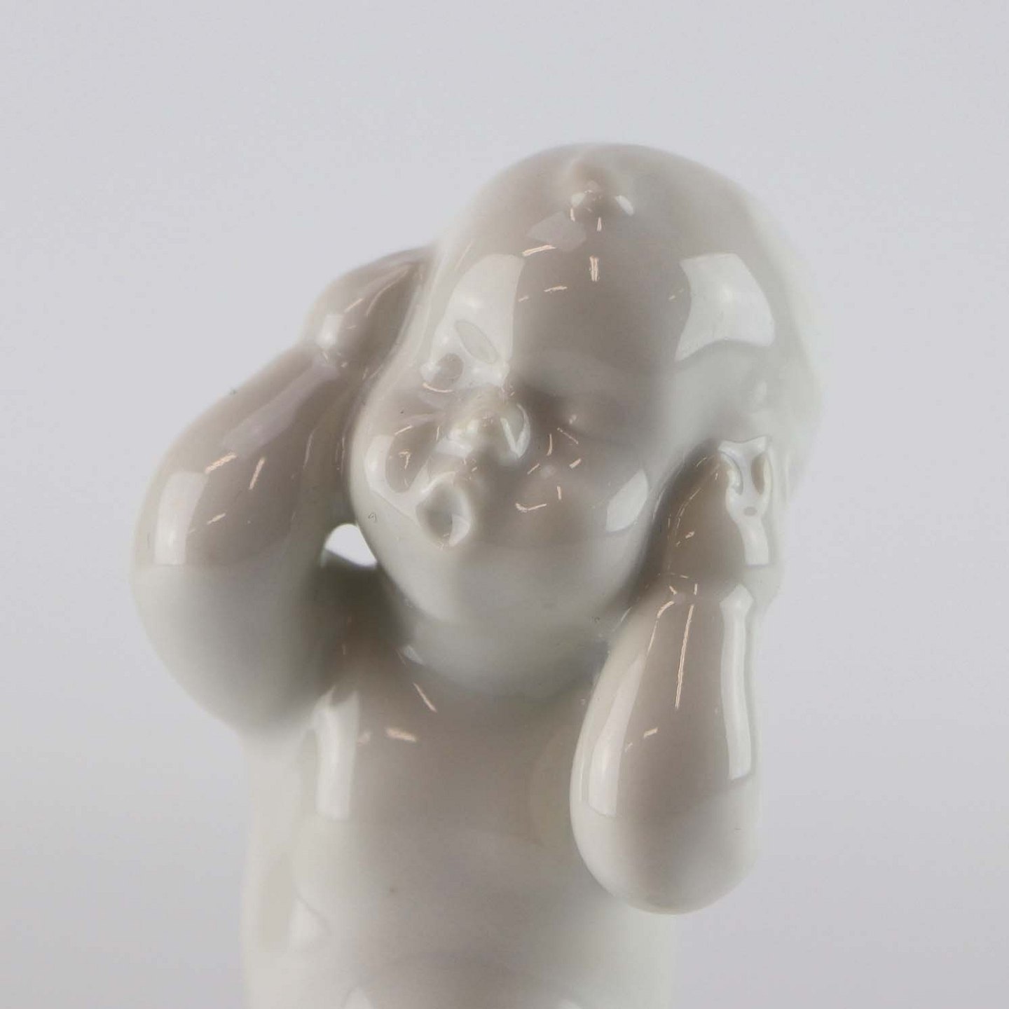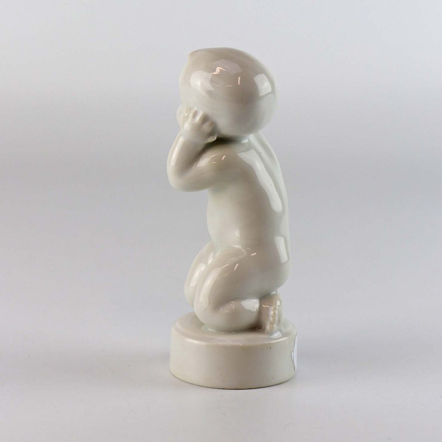 Figur i hvid porcelæn fra børnefigur serien, som illustrerer de fire pinsler. Figuren viser et barn med ørepine.