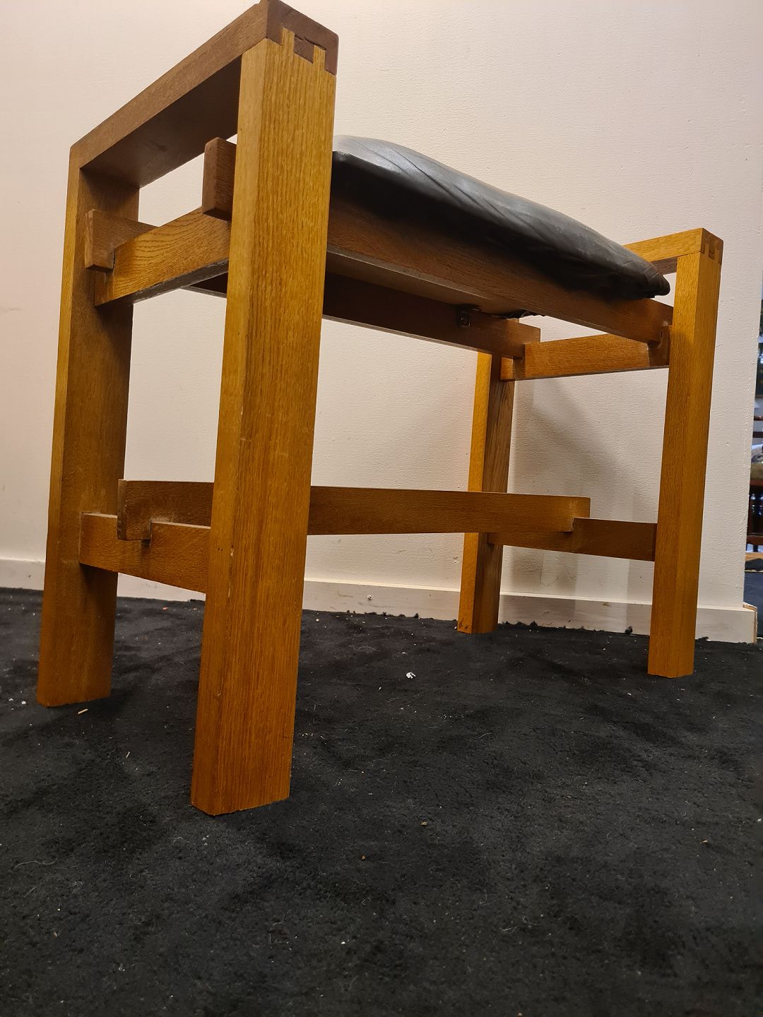 Dansk møbeldesign bænk i massiv lakeret eg med sæde i sort patineret skind.