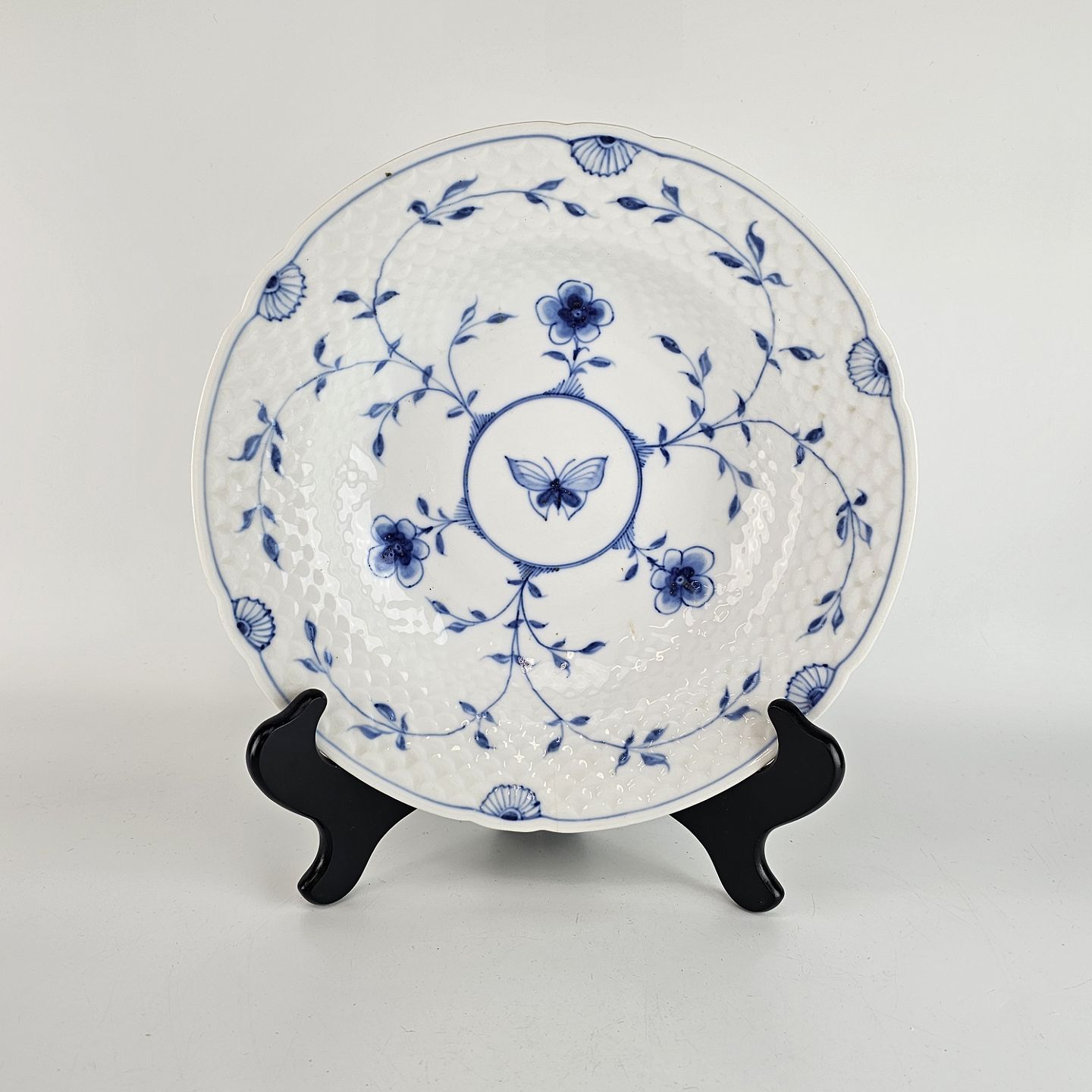 Tallerken i hvidt skælformet porcelæn med blå motiver af blomster og sommerfugle.