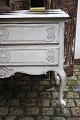 Dekorativ , gammel kommode med fine detaljer i gustaviansk grå farve med sorte og grå tern på toppen...