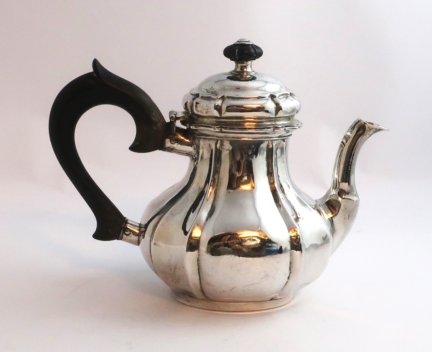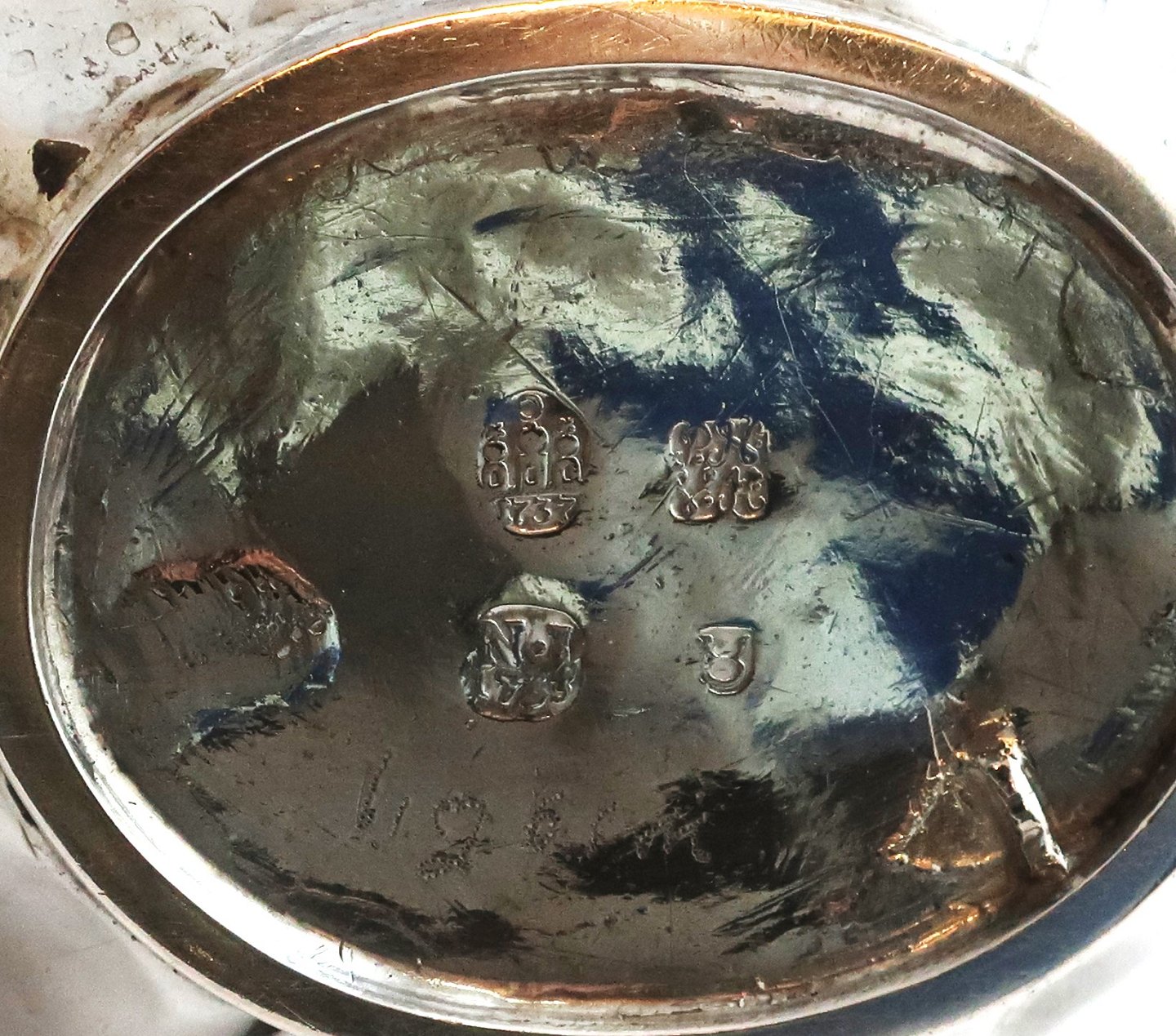Niels Johnsen, København (1705-1734). Ligeknækket sølv tekande (830). Højde 14 cm. Produceret 1733. Har desuden København stempel fra 1737.