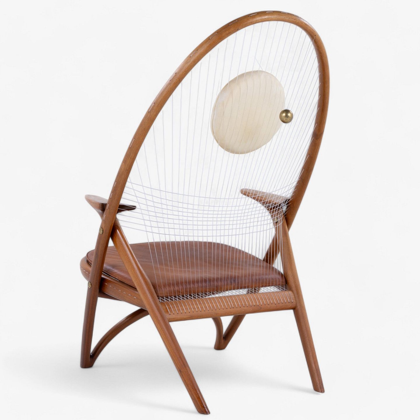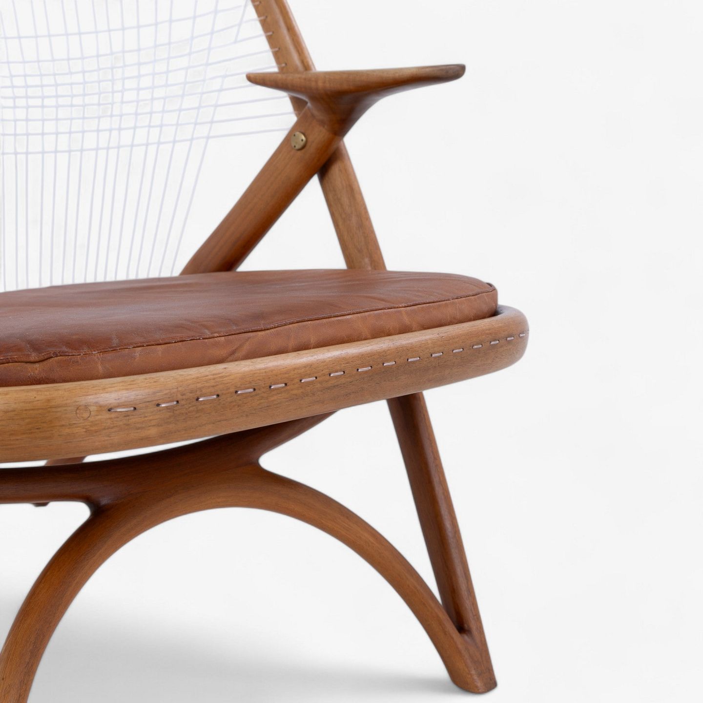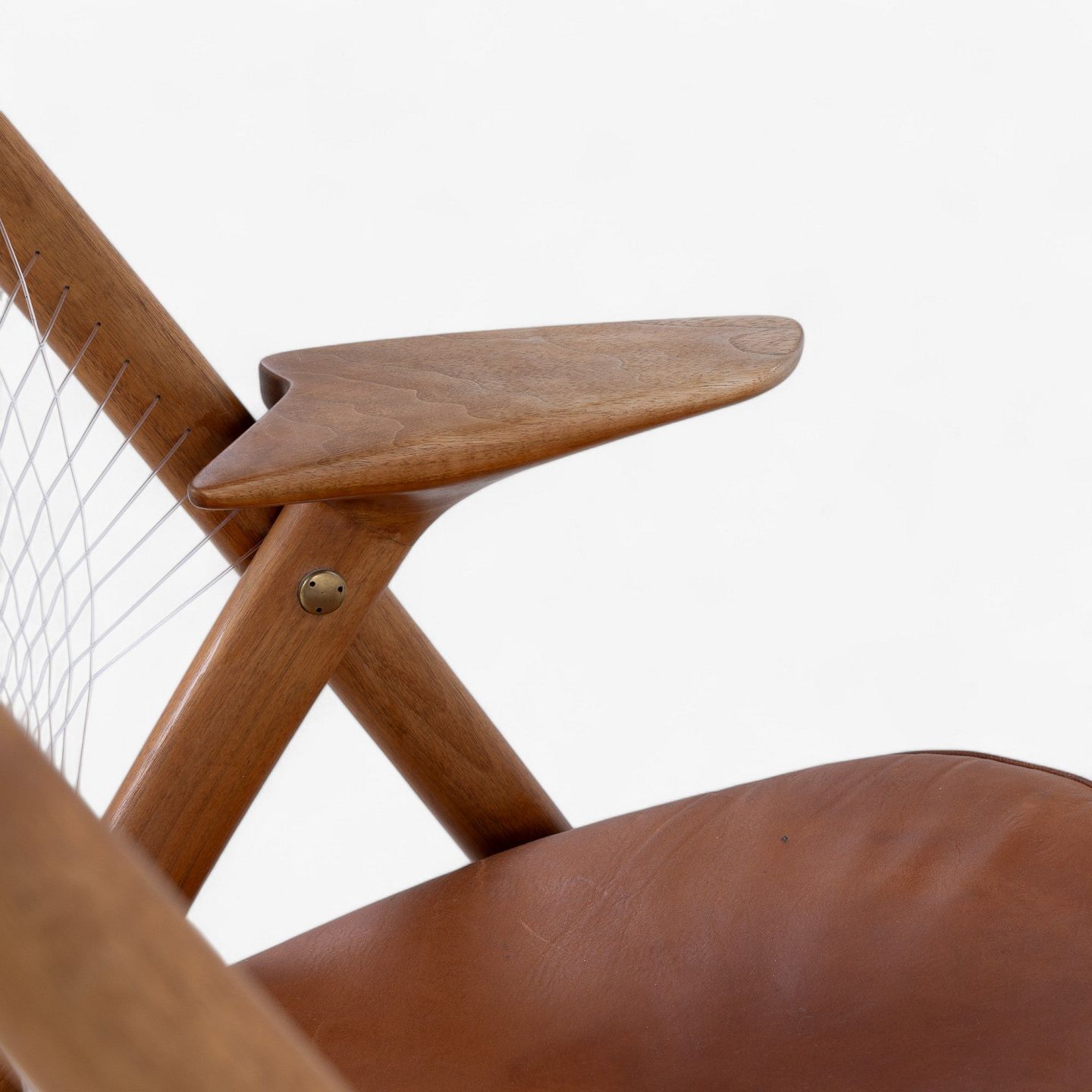 Sjælden lænestol i nøddetræ, nylon, originalt lædersæde og patineret pergament nakkehynde. Formgivet i 1955.