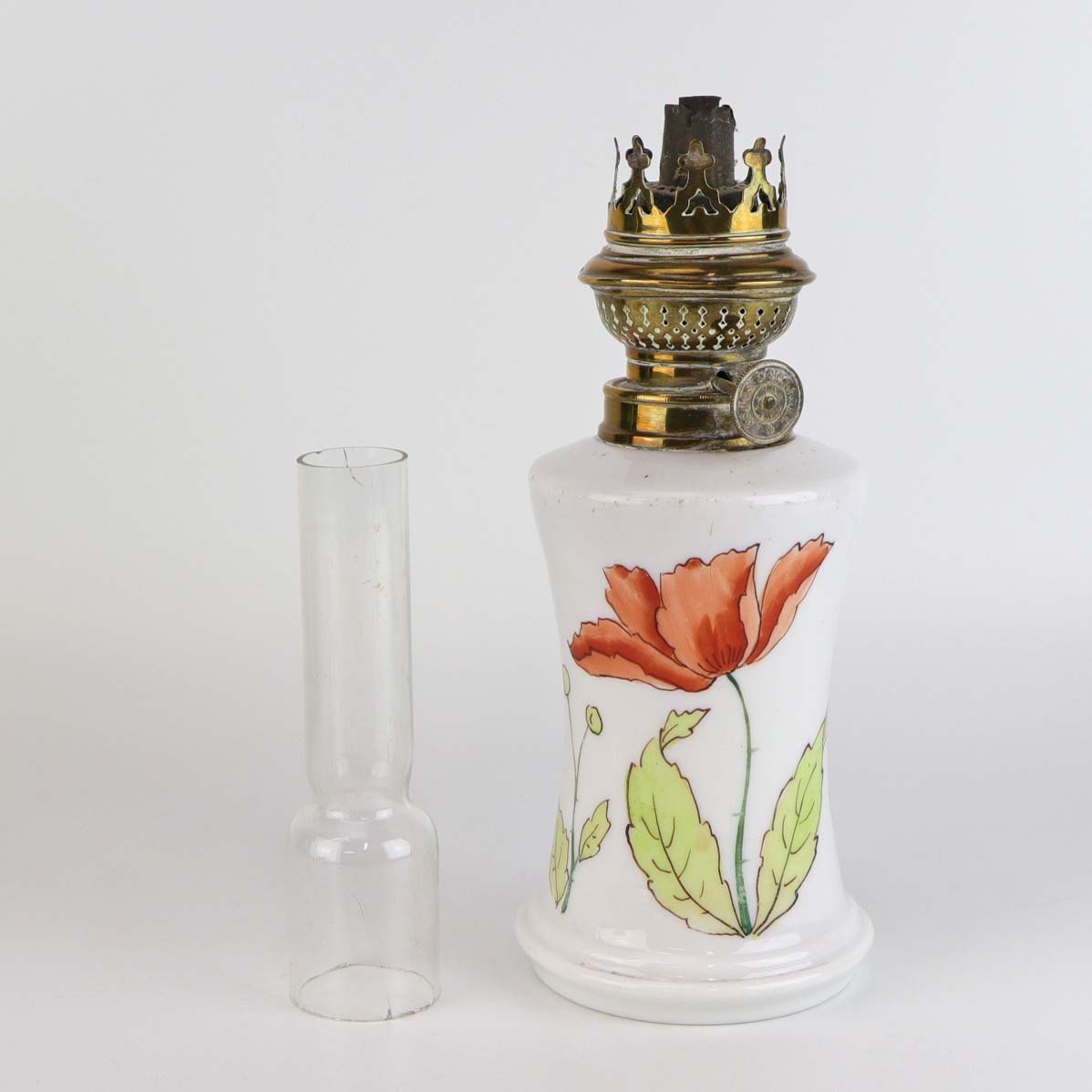 Gammel olielampe med fod i glas og malet motiv af rød valmue. Nr. 1520/174