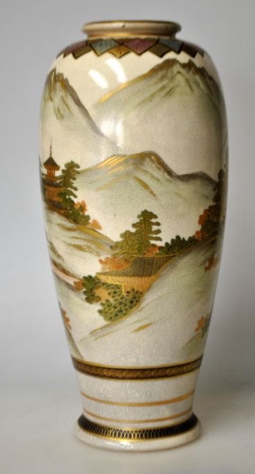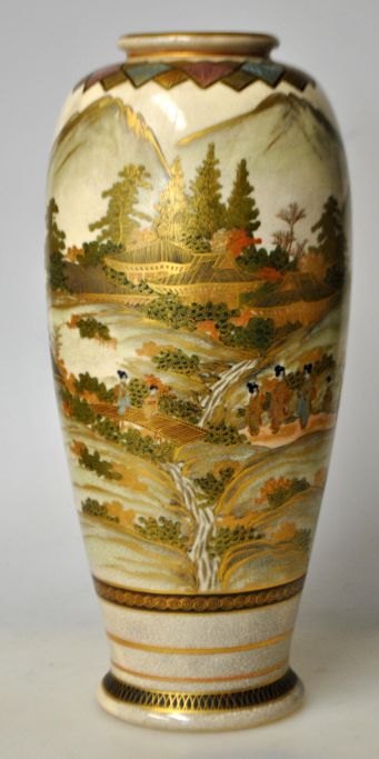 Fantastsk Satsuma vase, 1862 - 1912, Japan. Fajance. Med utrolige hånddekorerede bemalinger af landskaber med gående kvinder. Polykrom dekoreret med forgyldninger. Stemplet. H.: 25 cm.
