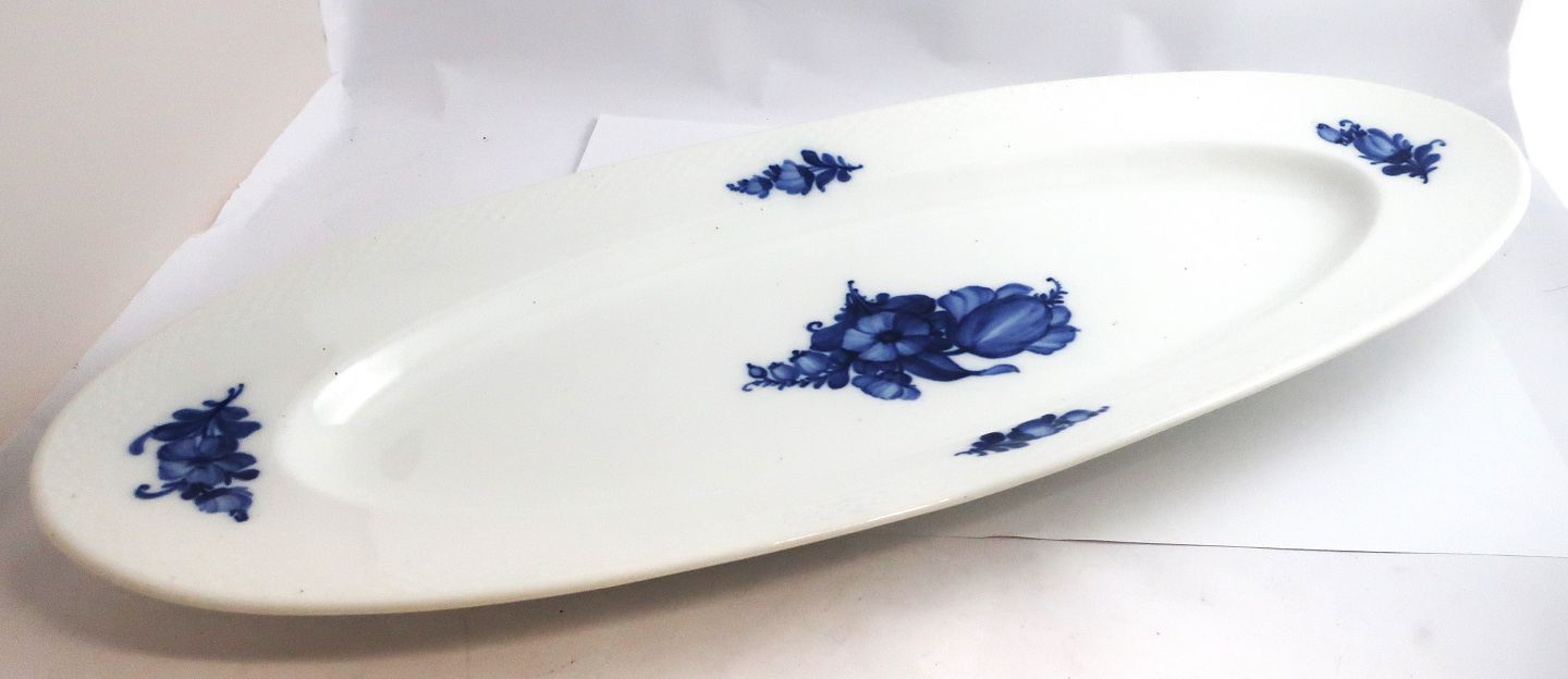Royal Copenhagen. Blå blomst, flettet. Stort aflangt fiskefad. Model 8022. Der er nogle brændpletter fra produktionen. Produceret før 1923. (1 sortering)