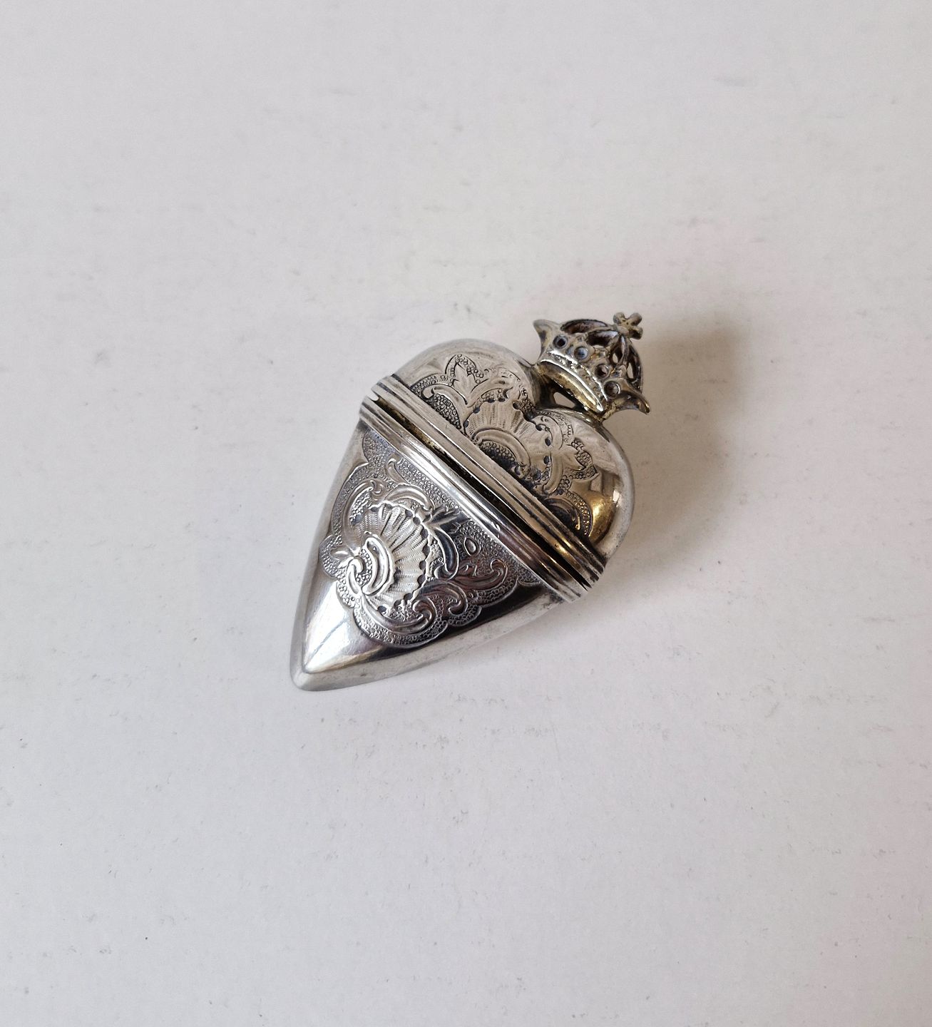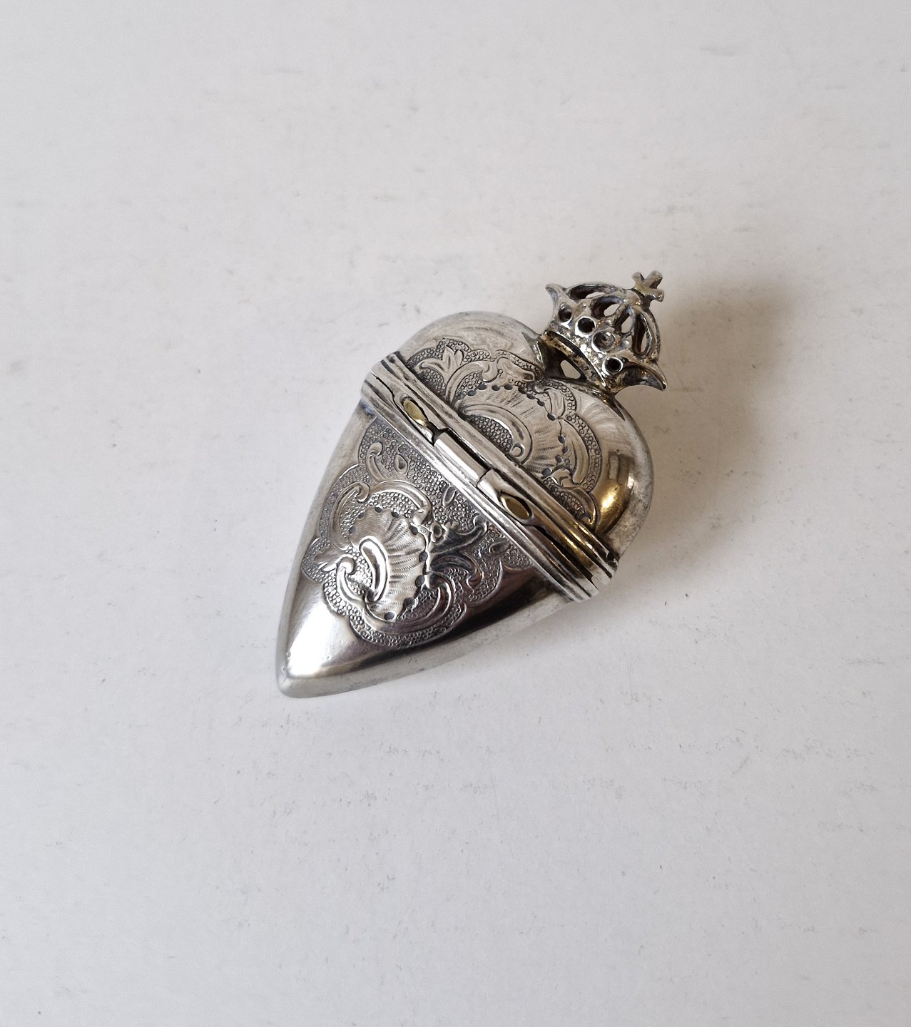 1800tals Hjerteformet hovedvandsæg i sølv, prydet med krone og rokoko dekoration |
