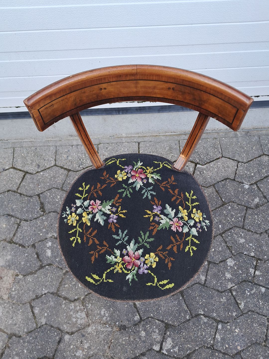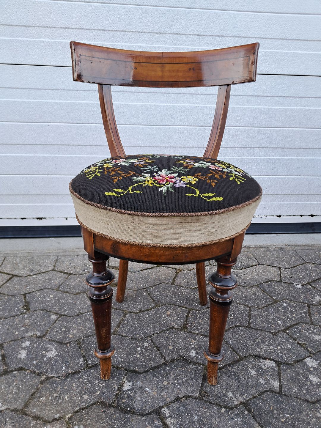 Salonstol i mahogni og bøgetræ med broderet betræk, fra 1910erne.