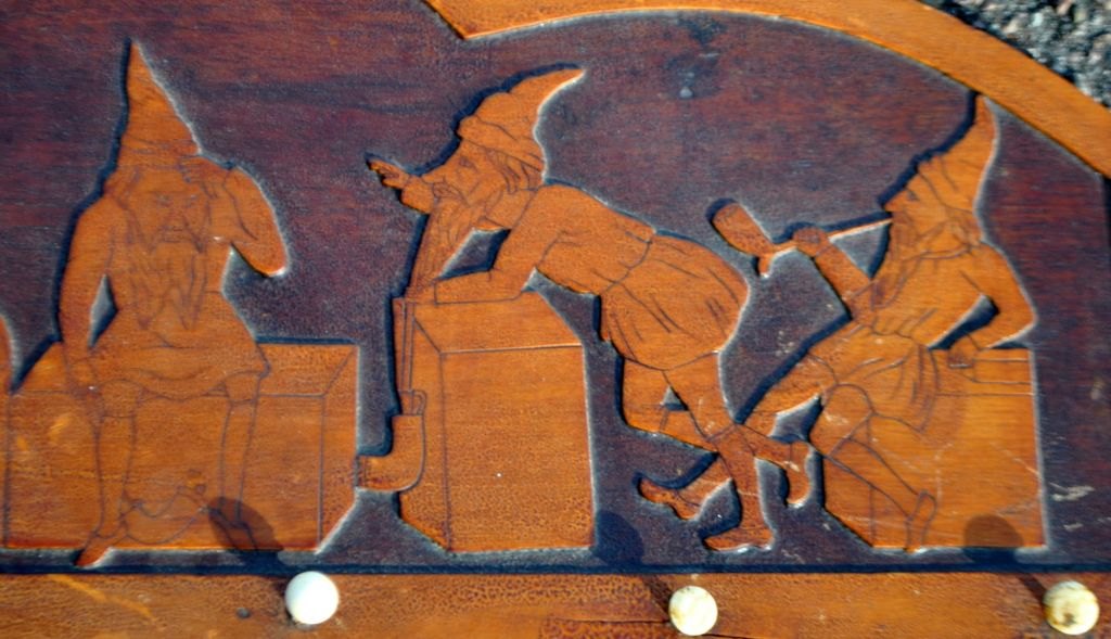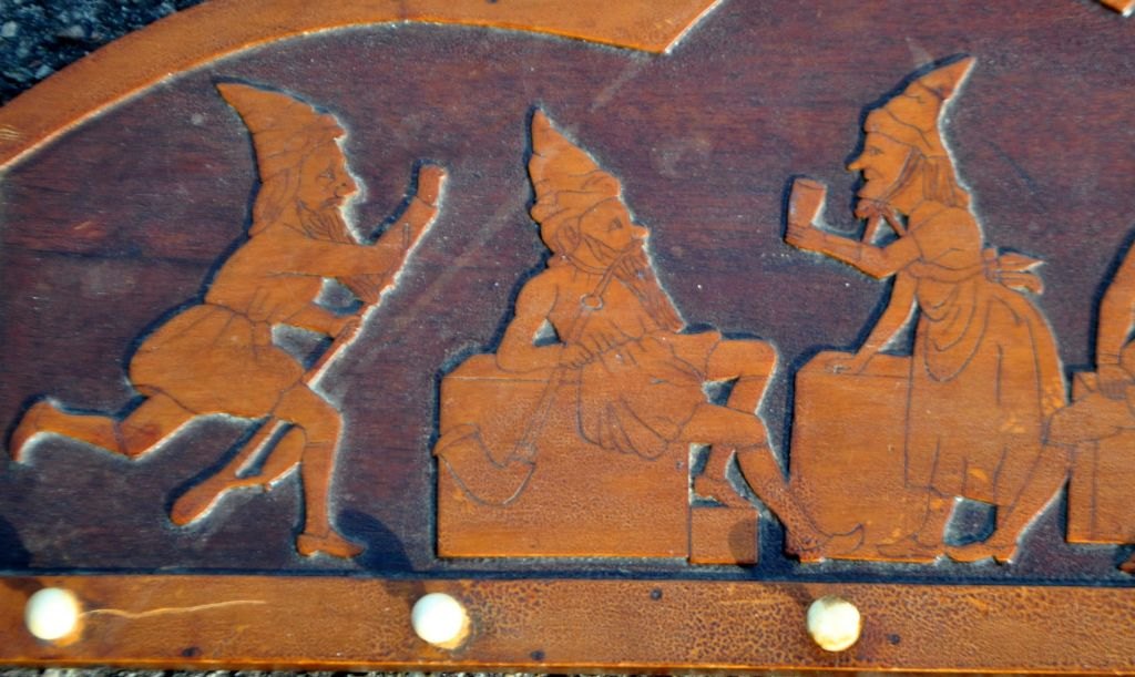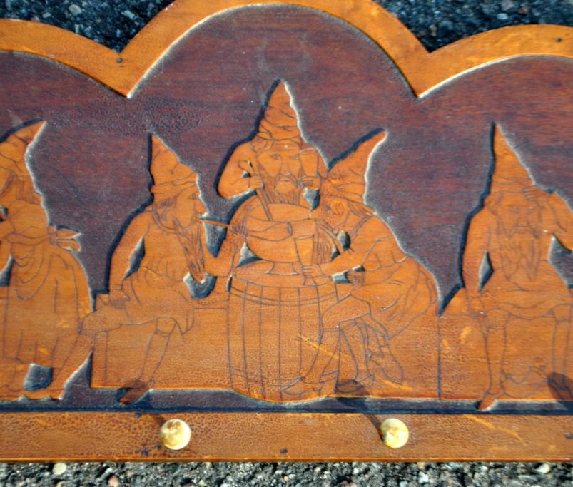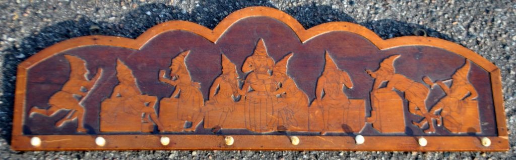 Coat rack with elves, Denmark, 19th century. Wood with carved elves drinking and smoking pipes. 8 hooks in bone. With two hinges for hanging. H: 20 cm. W: 63.5 cm.