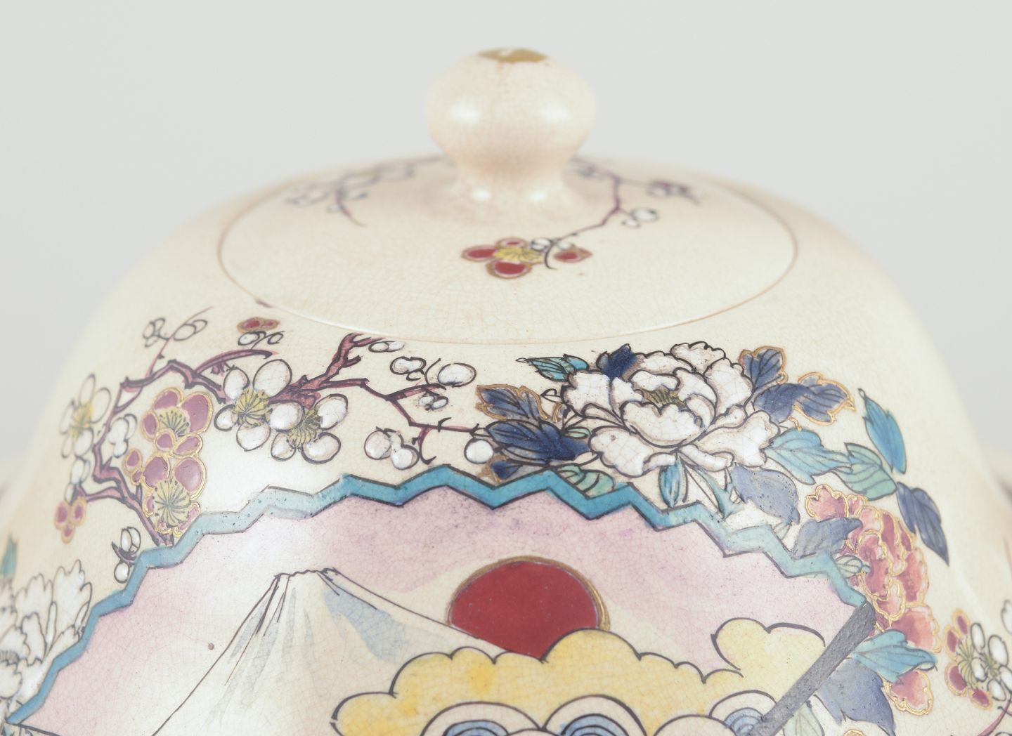 Håndmalet med blomstermotiver og vifte.