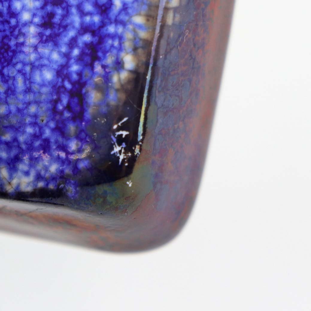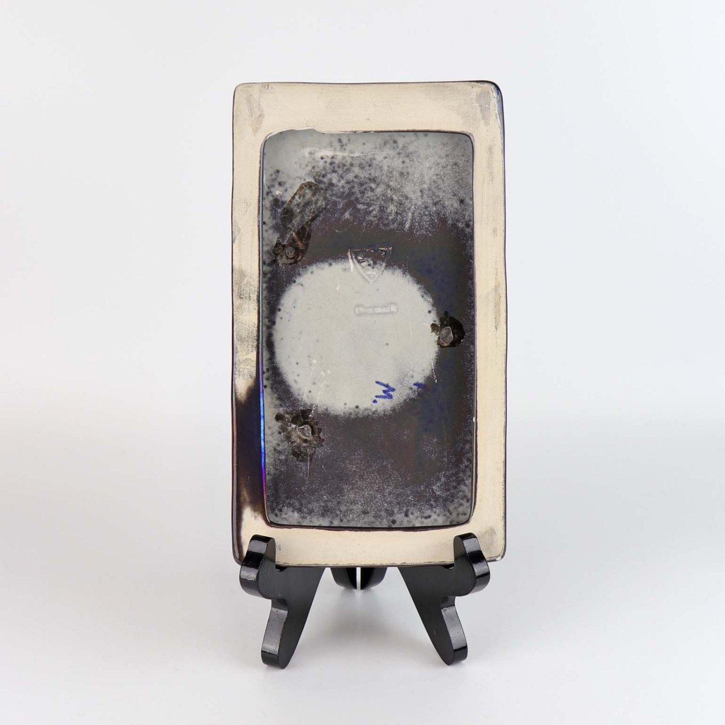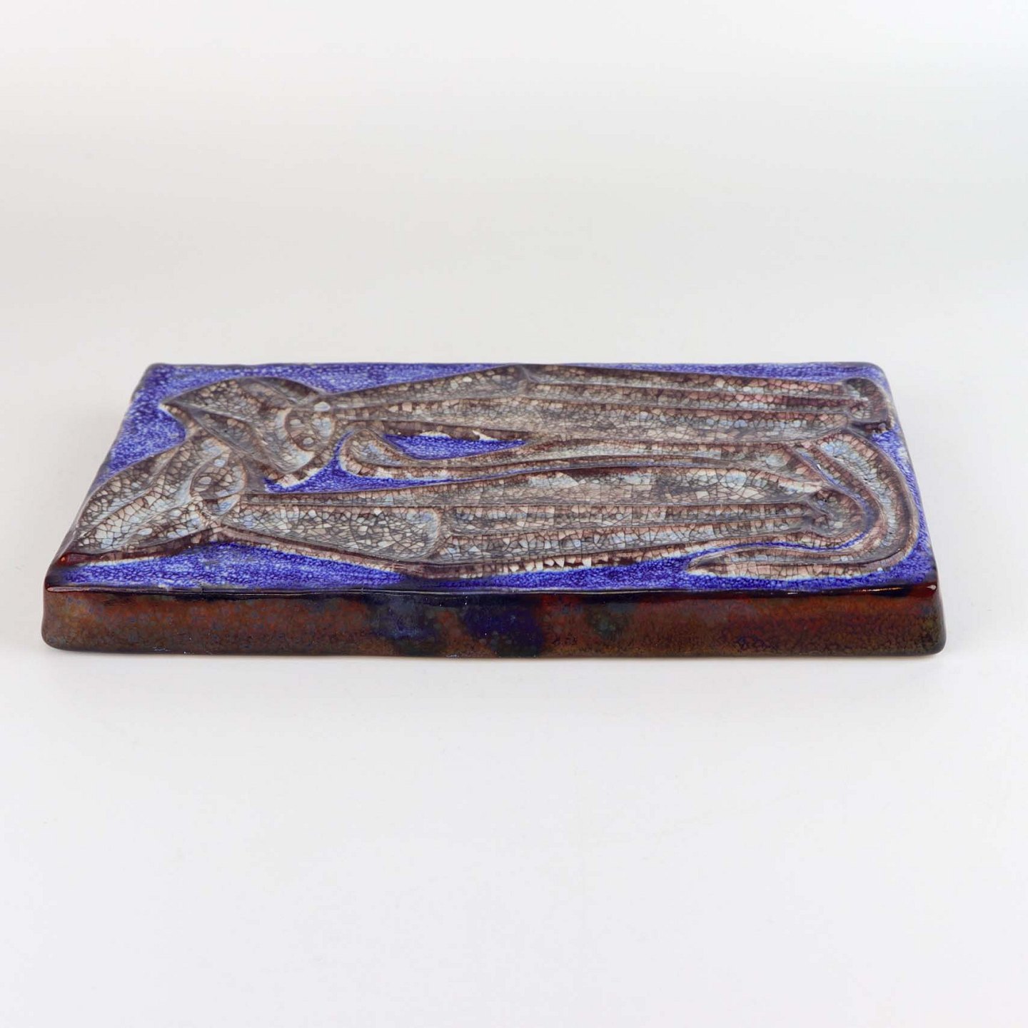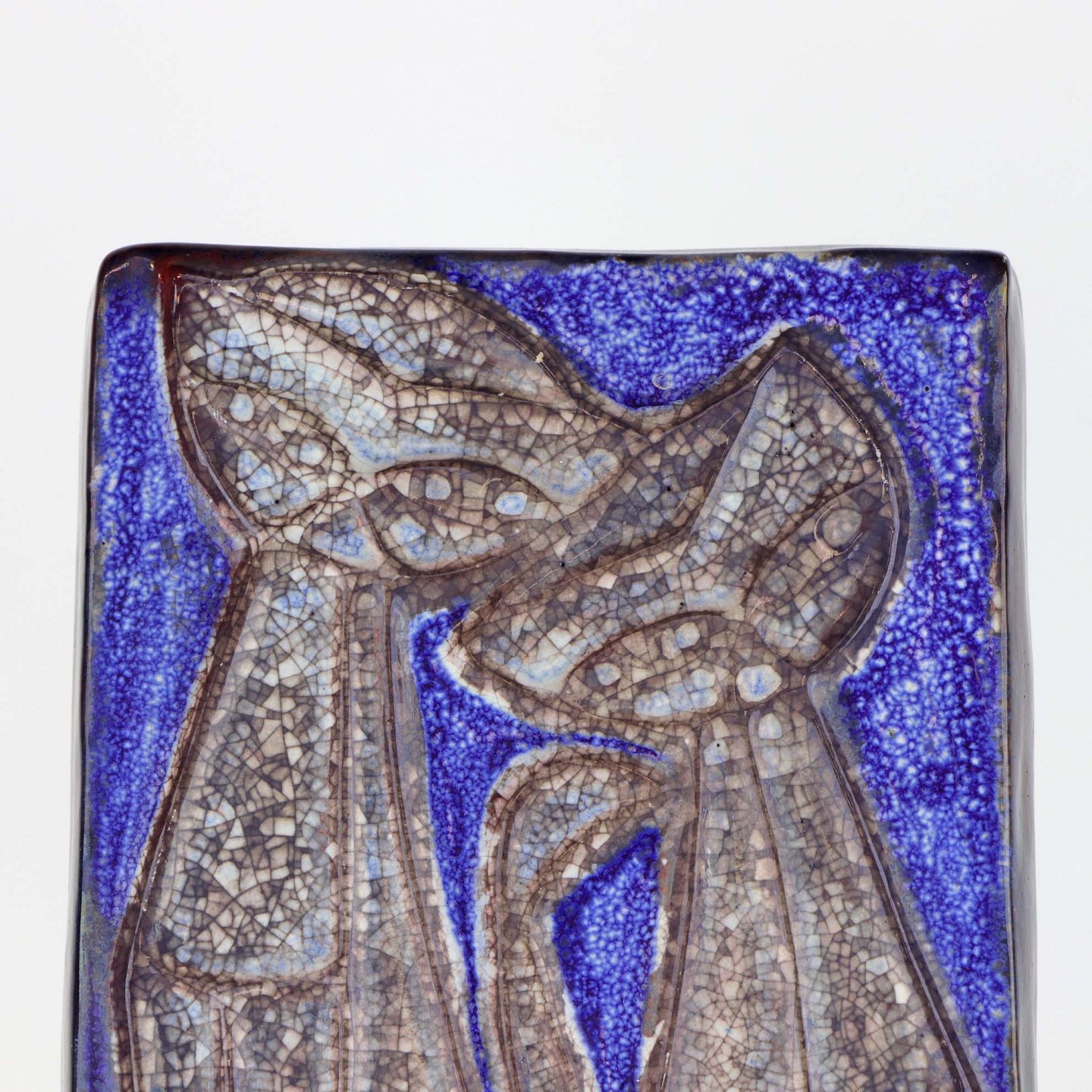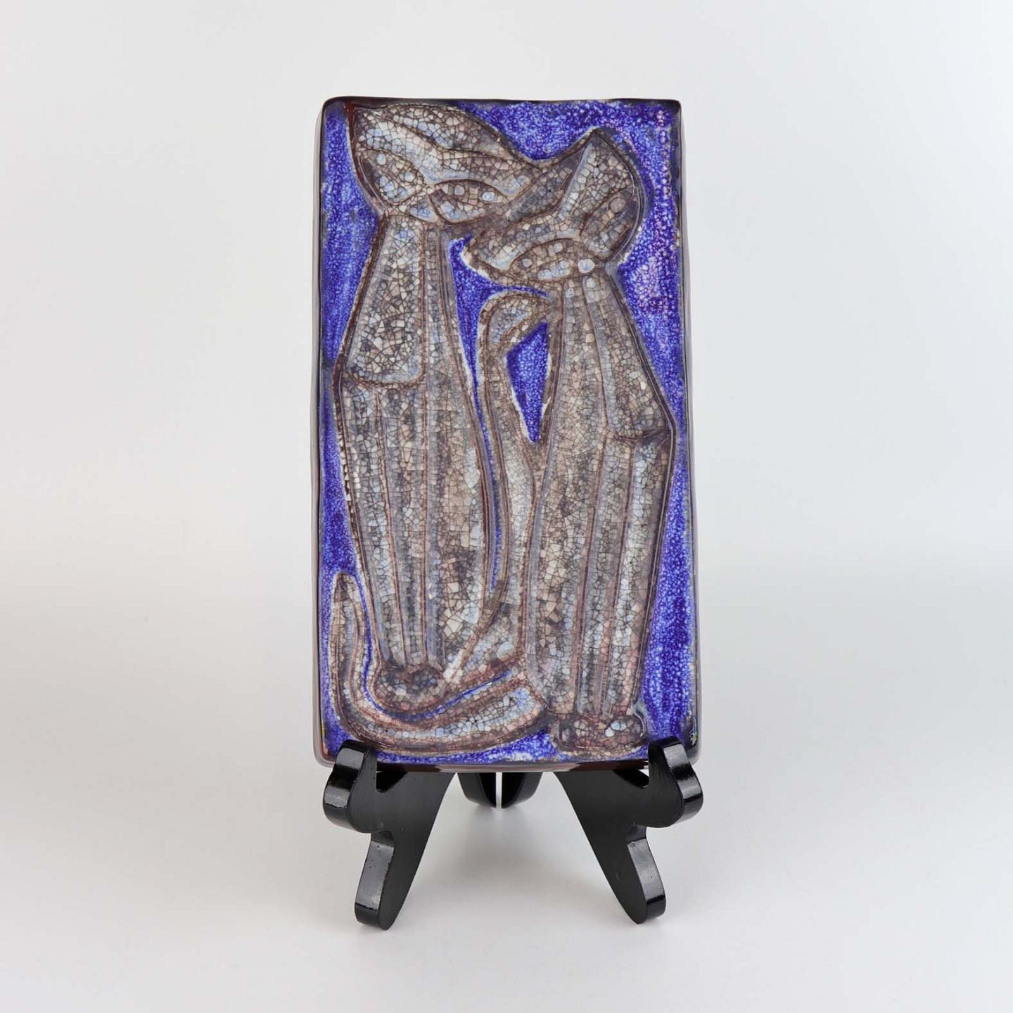 Relief i glaseret keramik med motiv af to siddende katte på blå baggrund. Nr. 5831