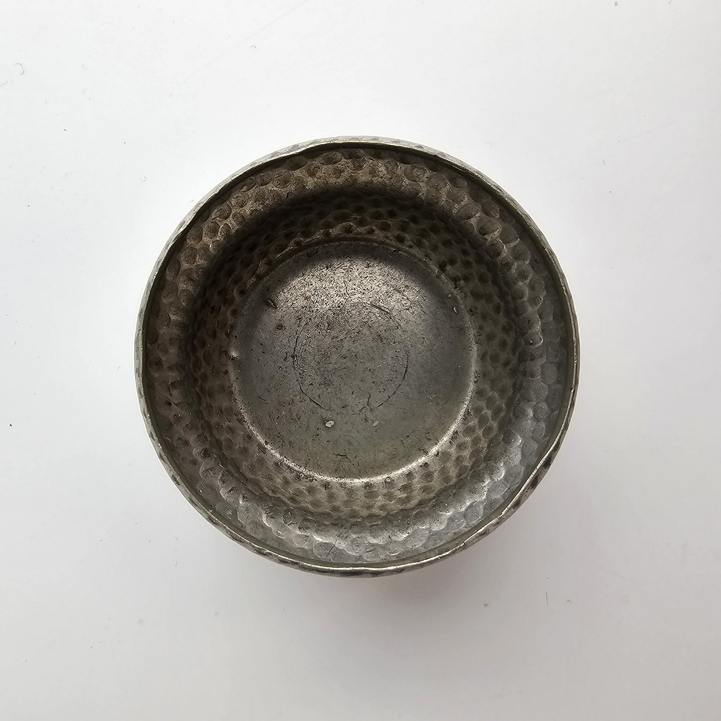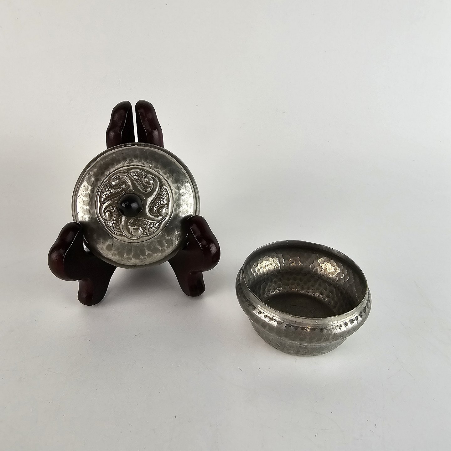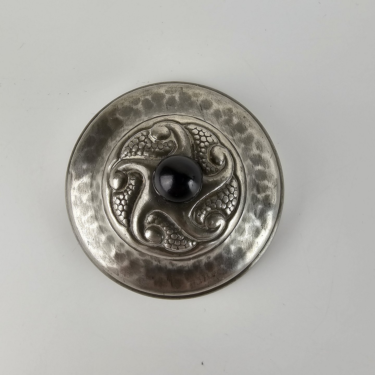 Lille krukke af tin med sort kugle på låget.
