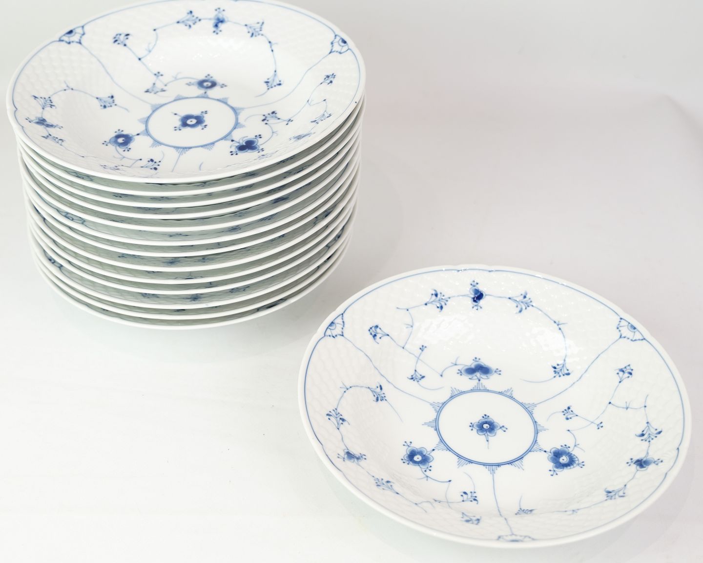 Dyb Tallerken nr. 22 fra Bing & Grøndahl. Fremstillet af porcelæn med klassisk blåmalet musselmalet dekoration.