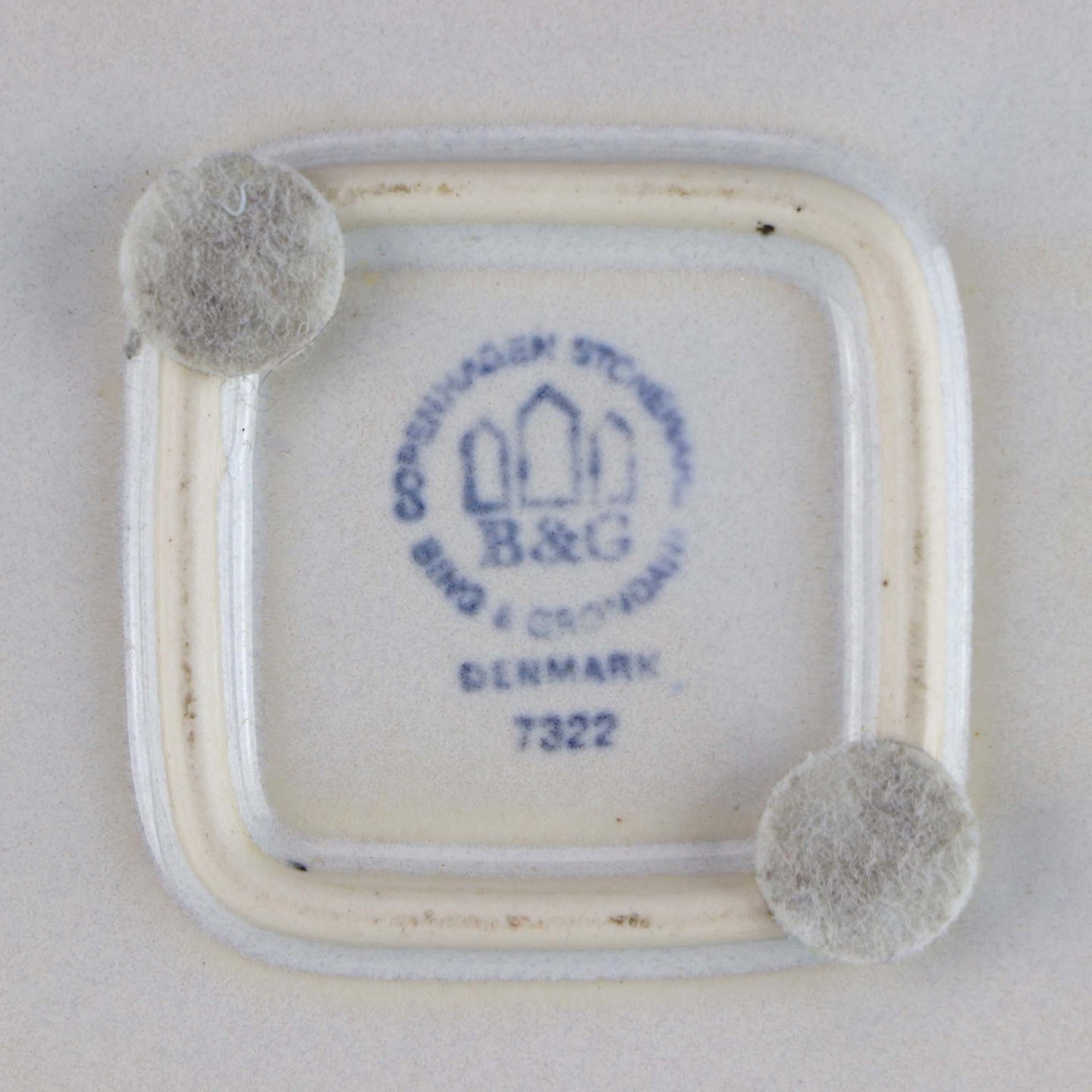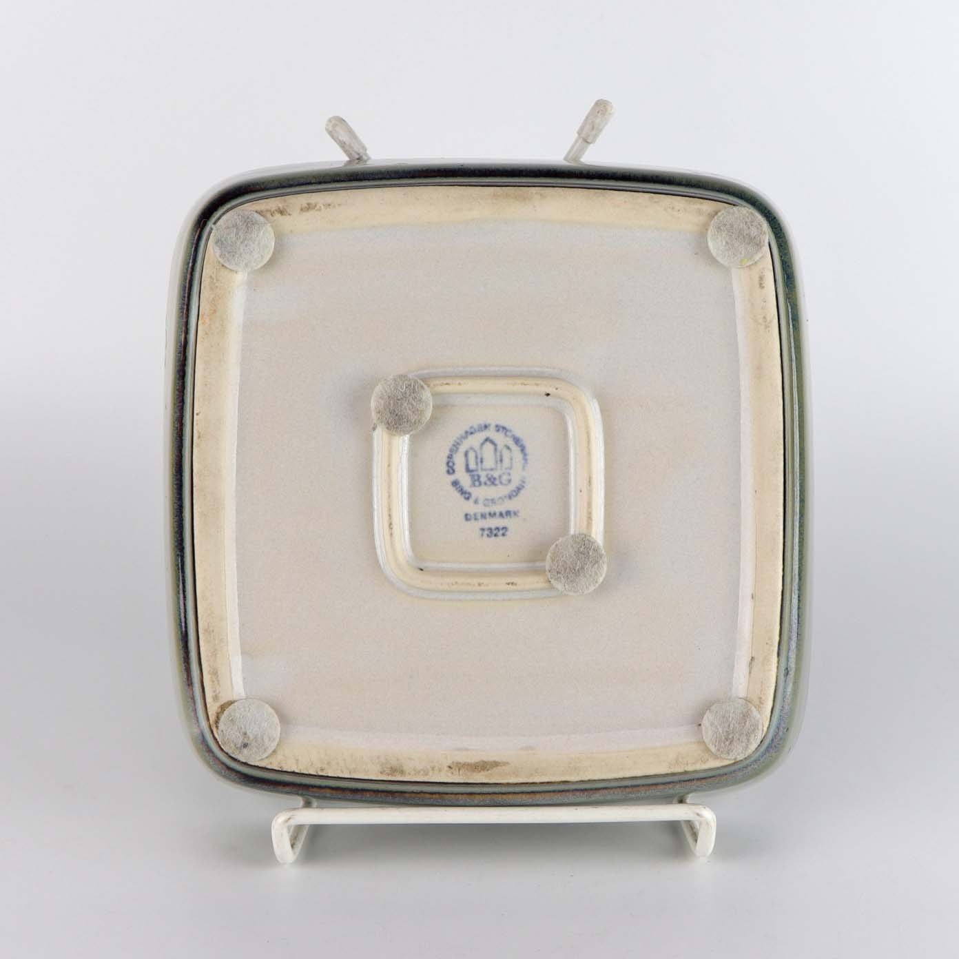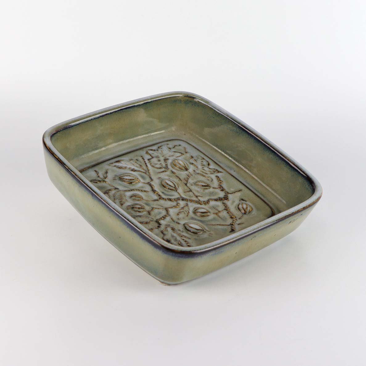Firkantet bordfad i stentøj med grågrøn glasur og motiv af bær på grene med blade. Nr. 7322