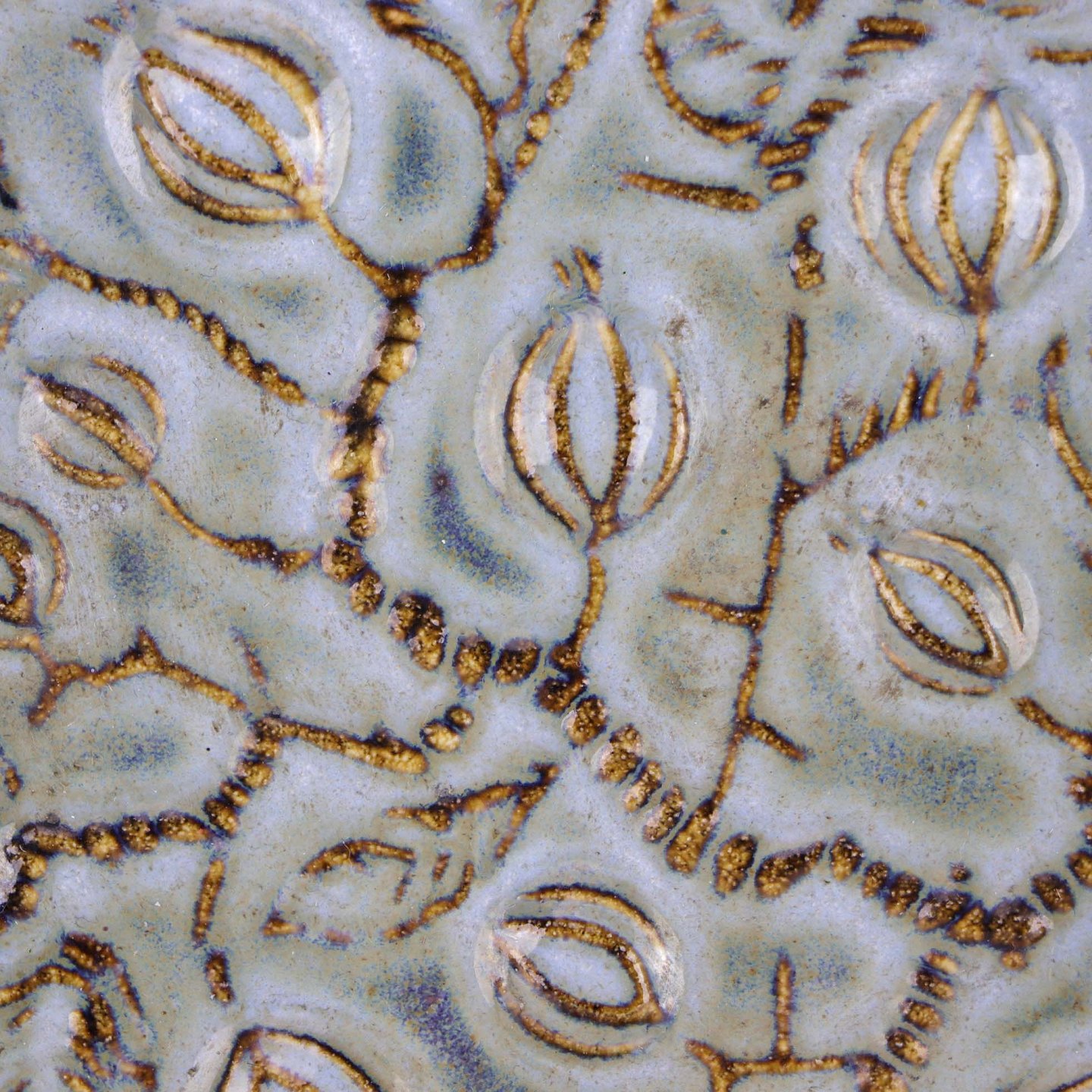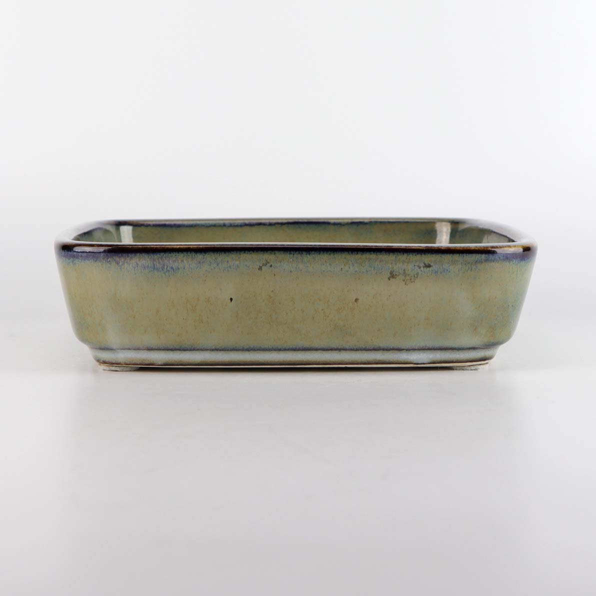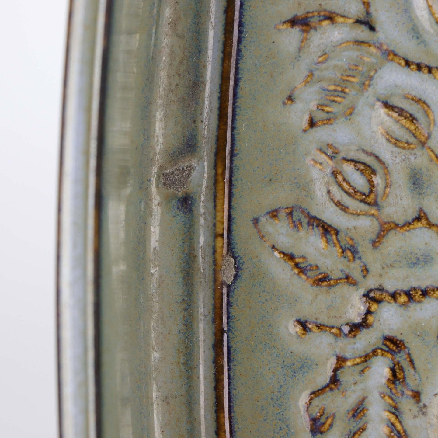 Firkantet bordfad i stentøj med grågrøn glasur og motiv af bær på grene med blade. Nr. 7322