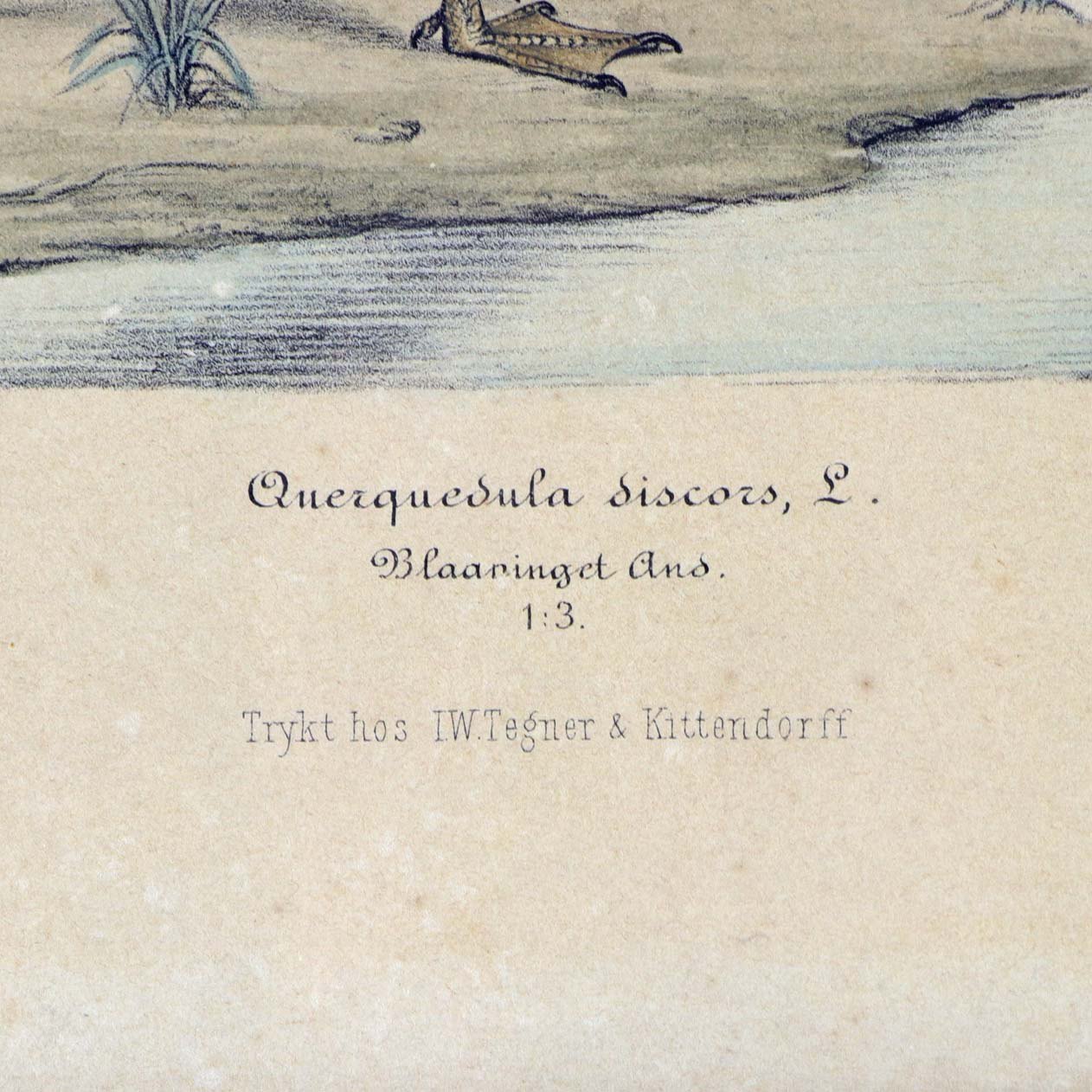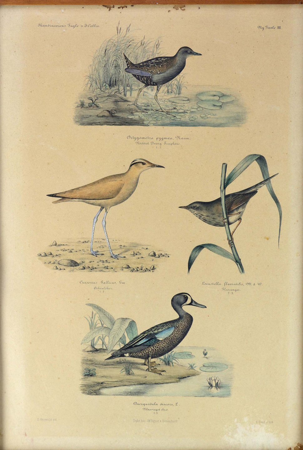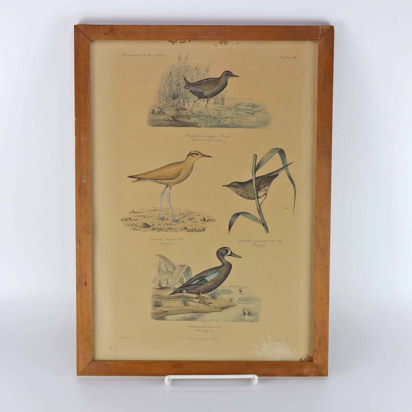Indrammet antikt litografi i træramme med motiv af forskellige fuglearter. Litografiet er fra før år 1893