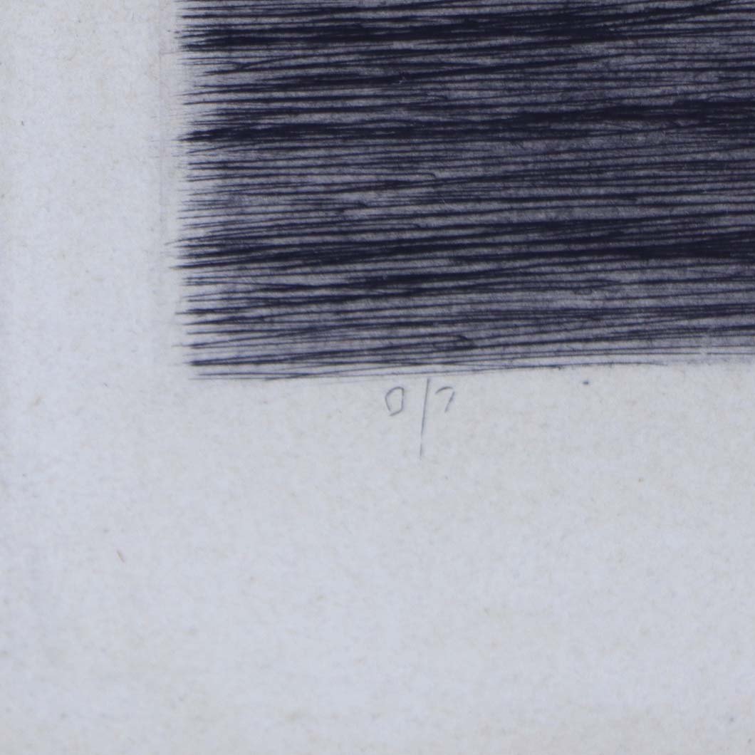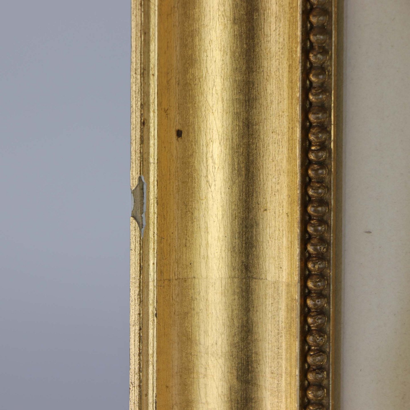 Indrammet radering i guldmalet træramme med landskabsmotiv af seljskib og båd på hav.