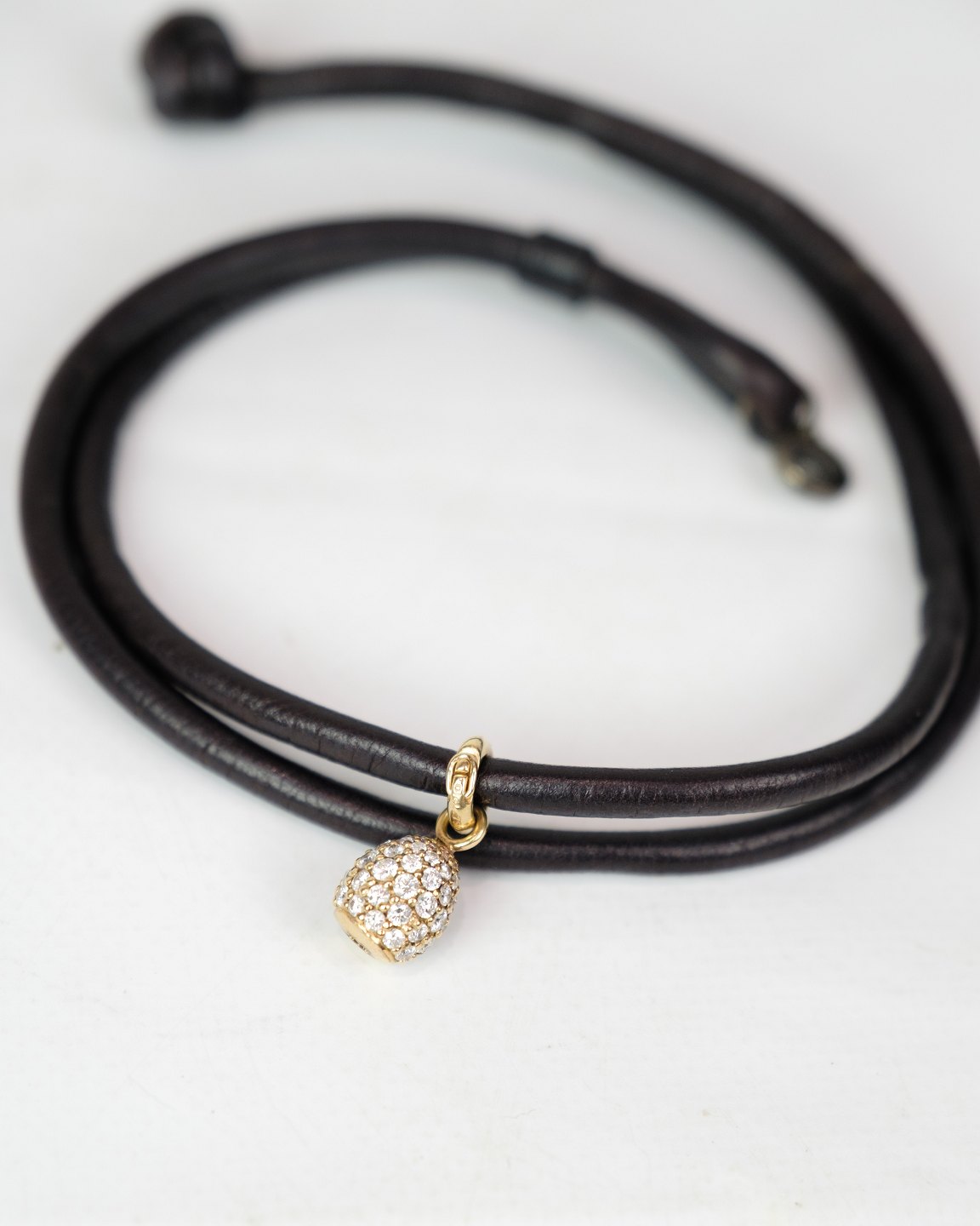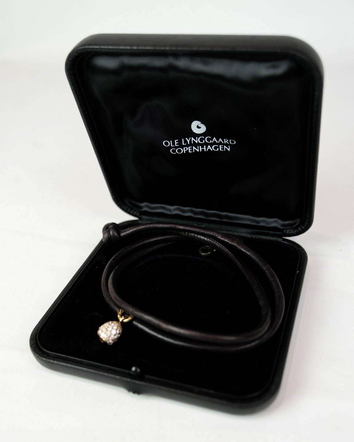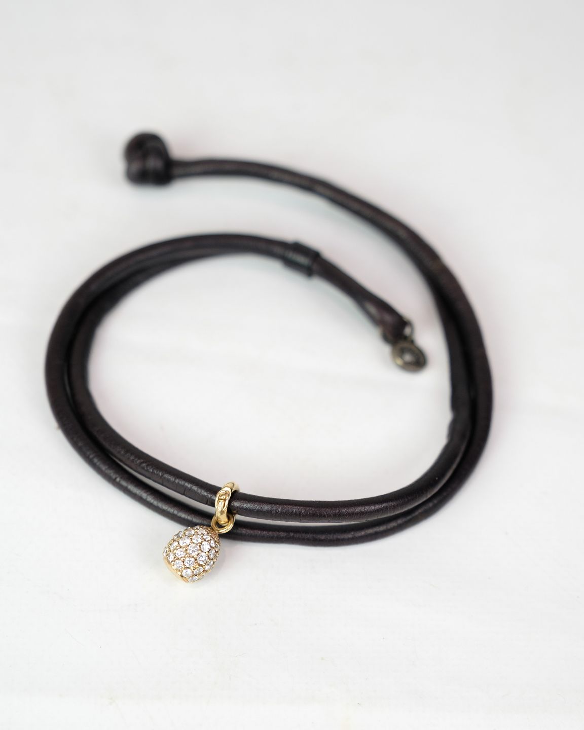 Læderarmbånd fra Ole Lynggaard med fuldt paveret Sweet Drop vedhæng. Det rå læder står i smuk kontrast til det funklende vedhæng og afspejler brandets karakteristiske stil.