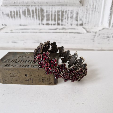 Leddelt armbånd prydet med talrige smukke mørke granater, armbåndet er forsynet med sikkerhedskæder.