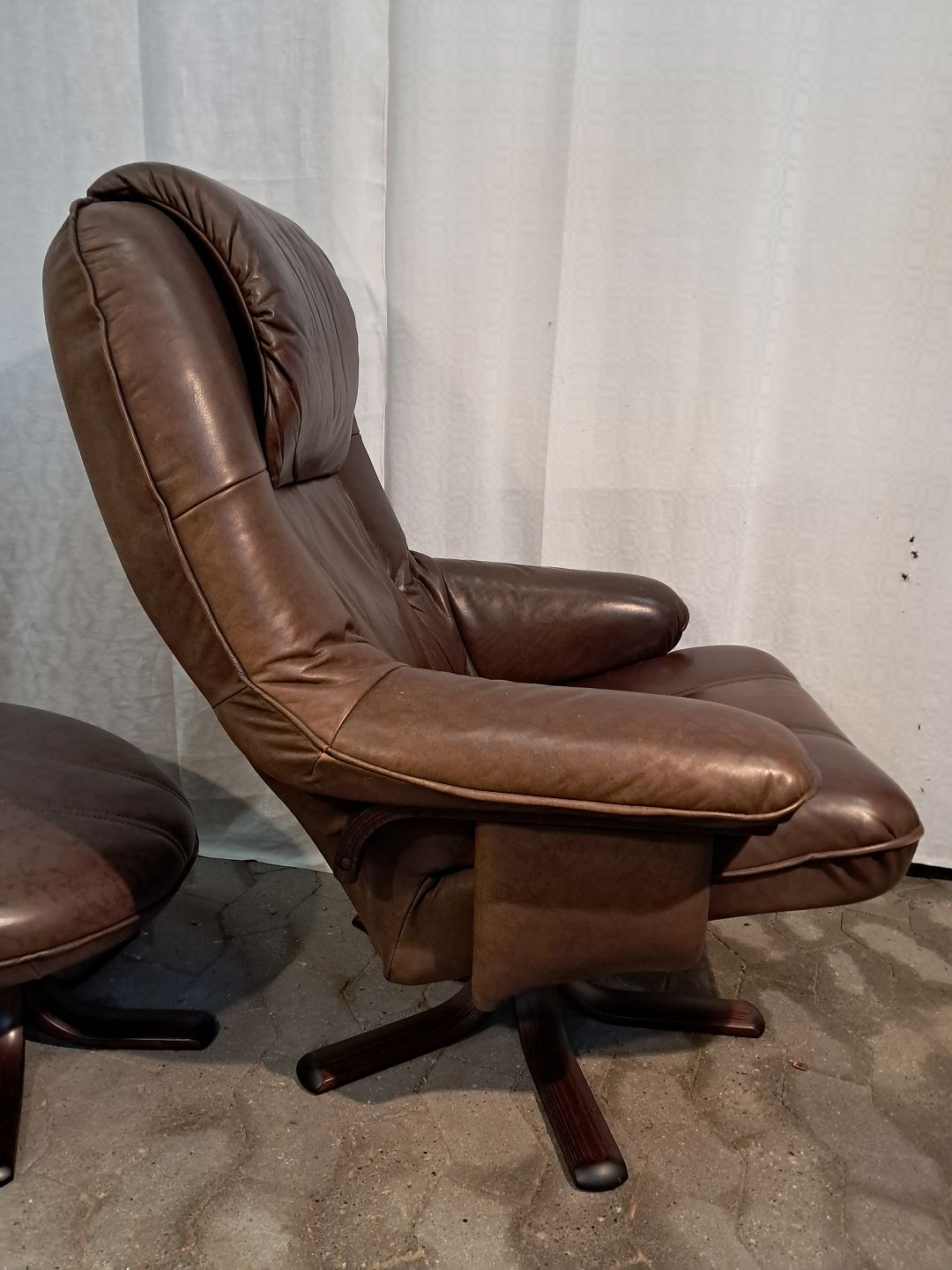 Brun læder lænestol med fodskammel, fra 2010erne.