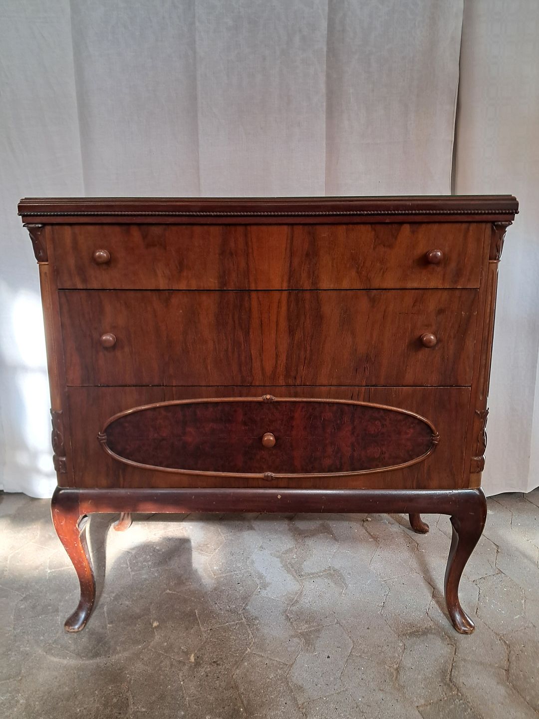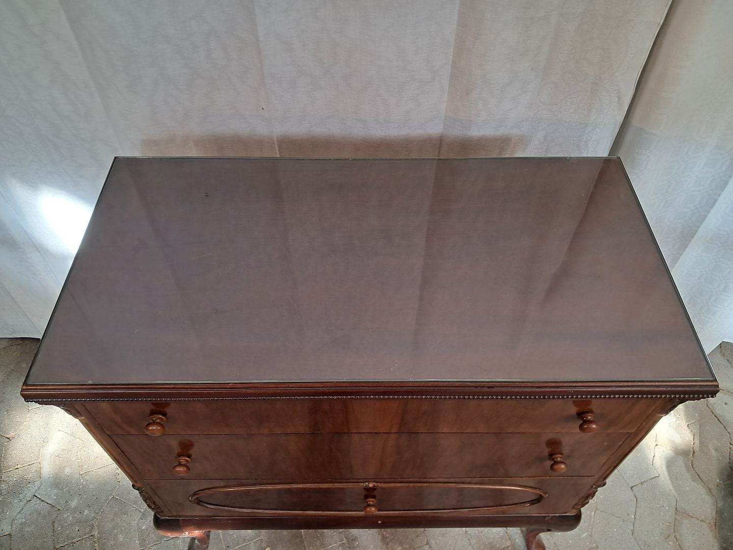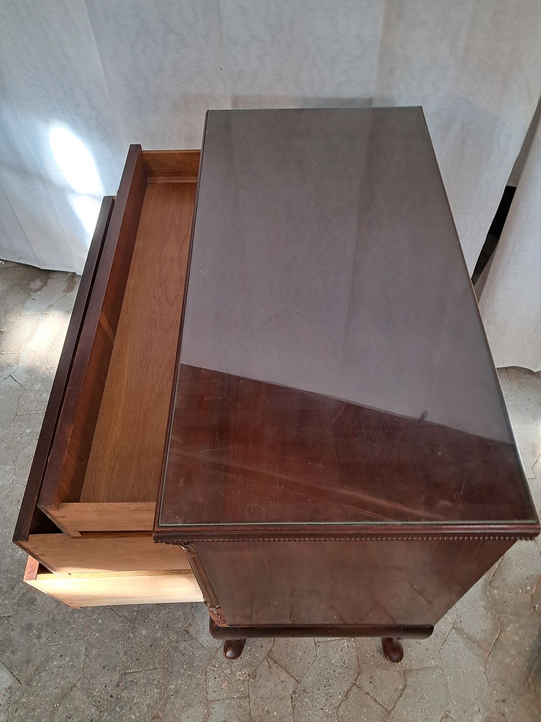 Kommode i fineret mahogni med glasplade, fra 1920erne.
