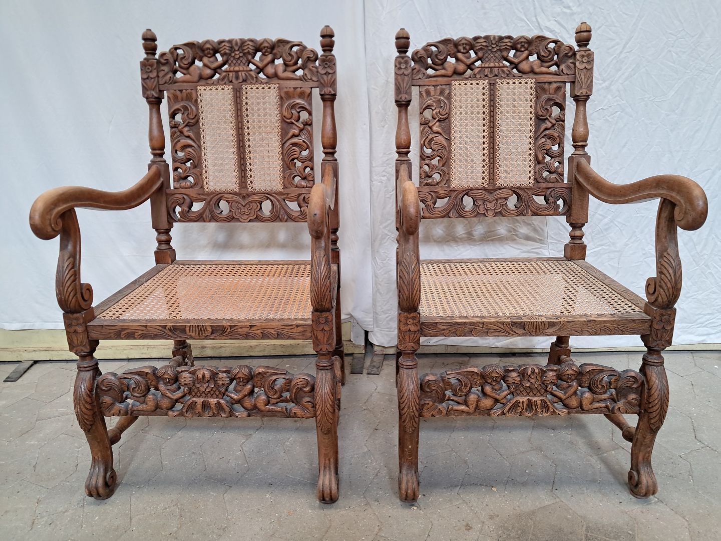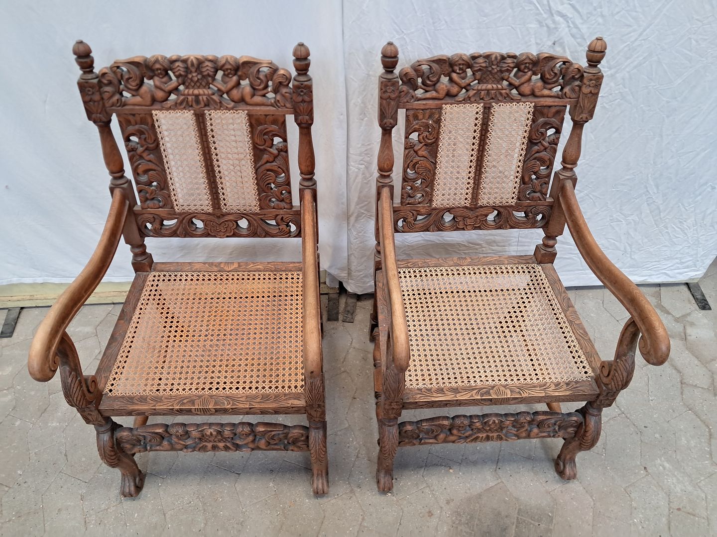 2 Armstole i massivt egetræ med intakt rørflet, fra 1930erne.