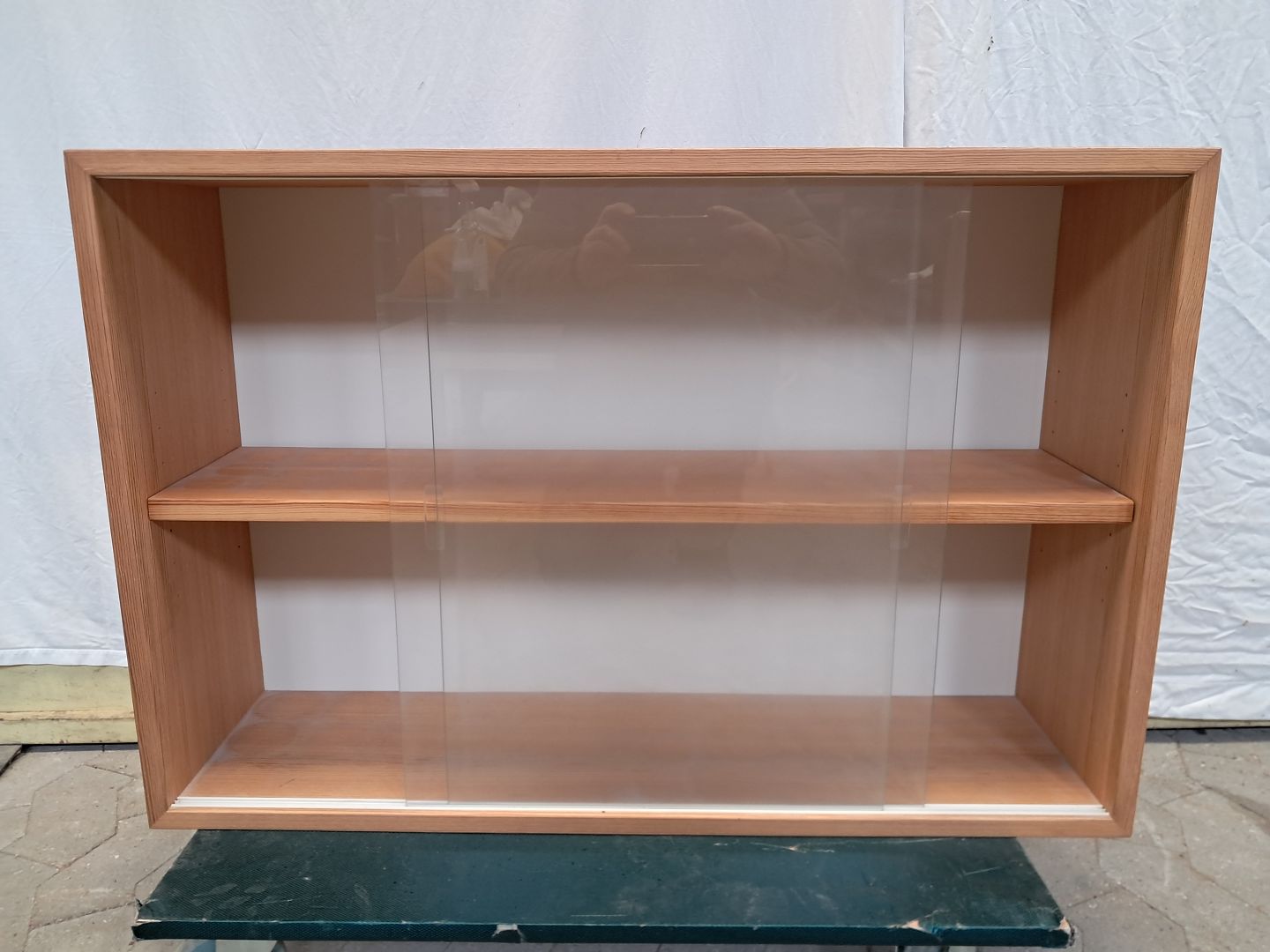 Vitrineskab i fineret fyrretræ, fra 1980erne.