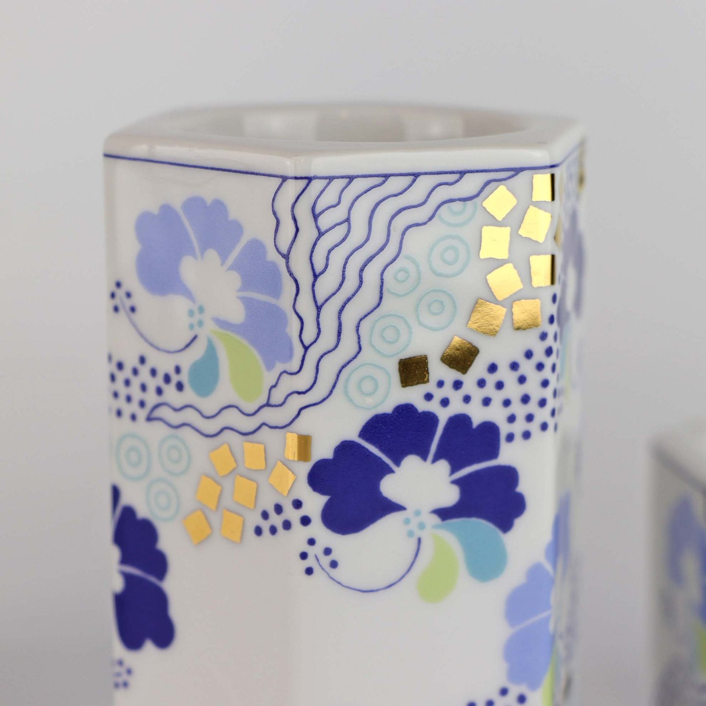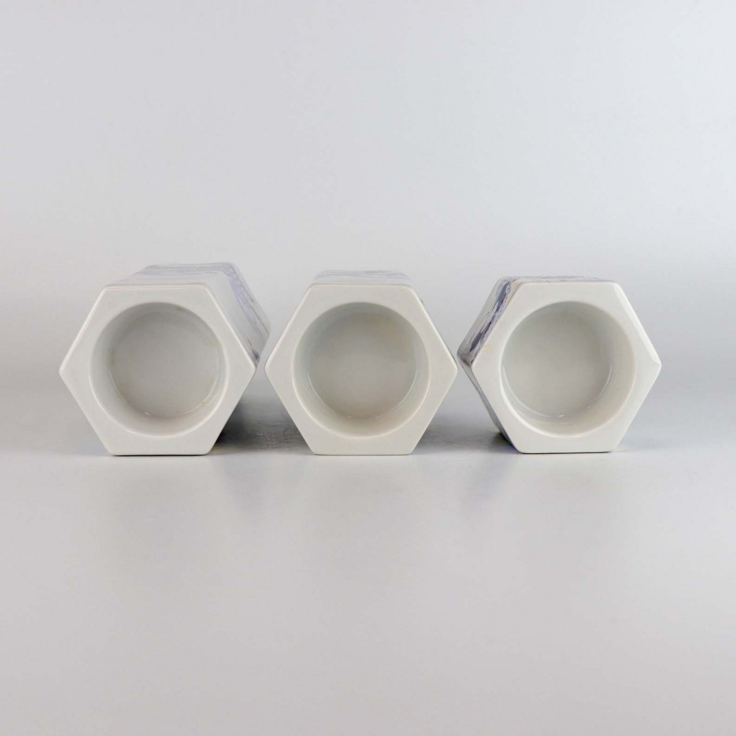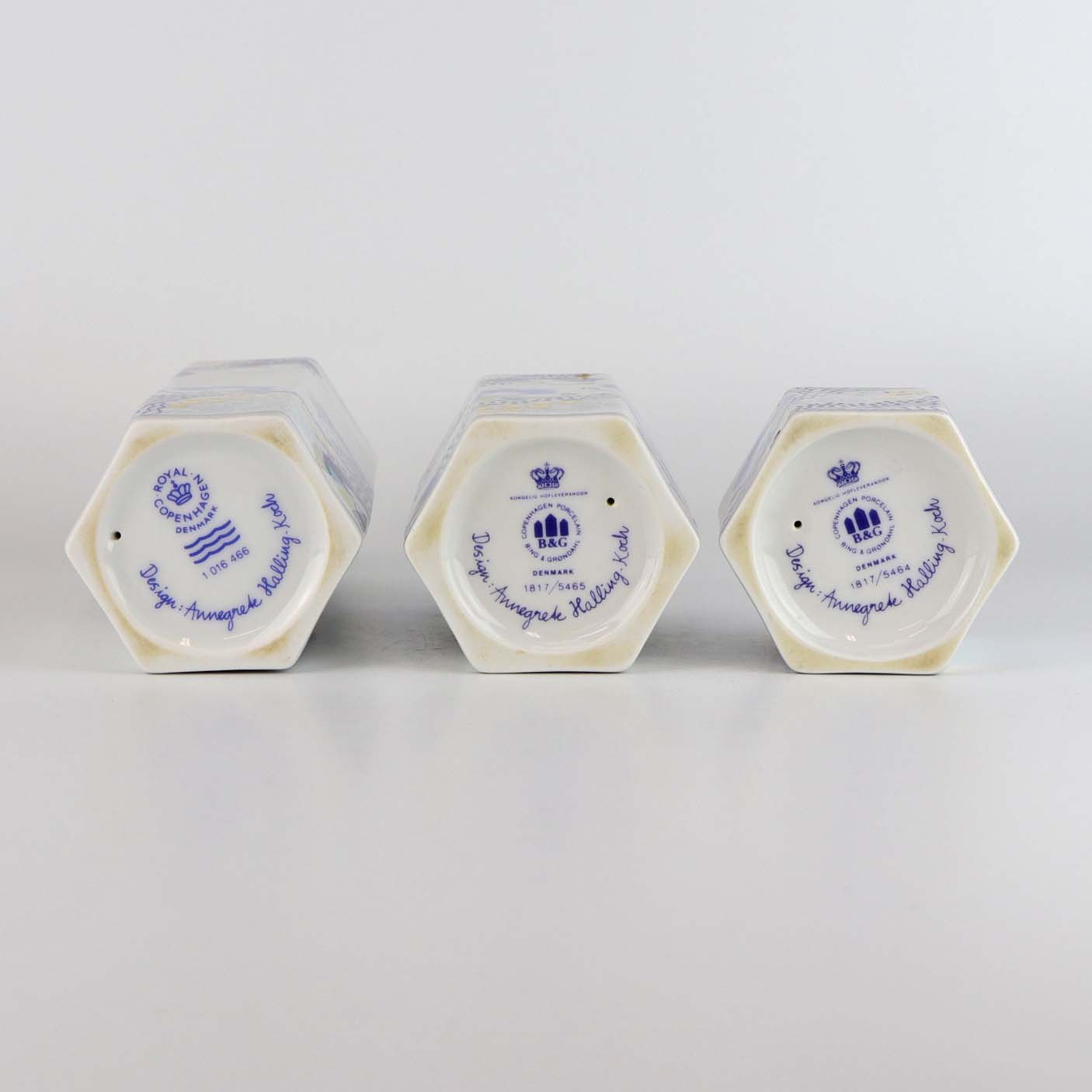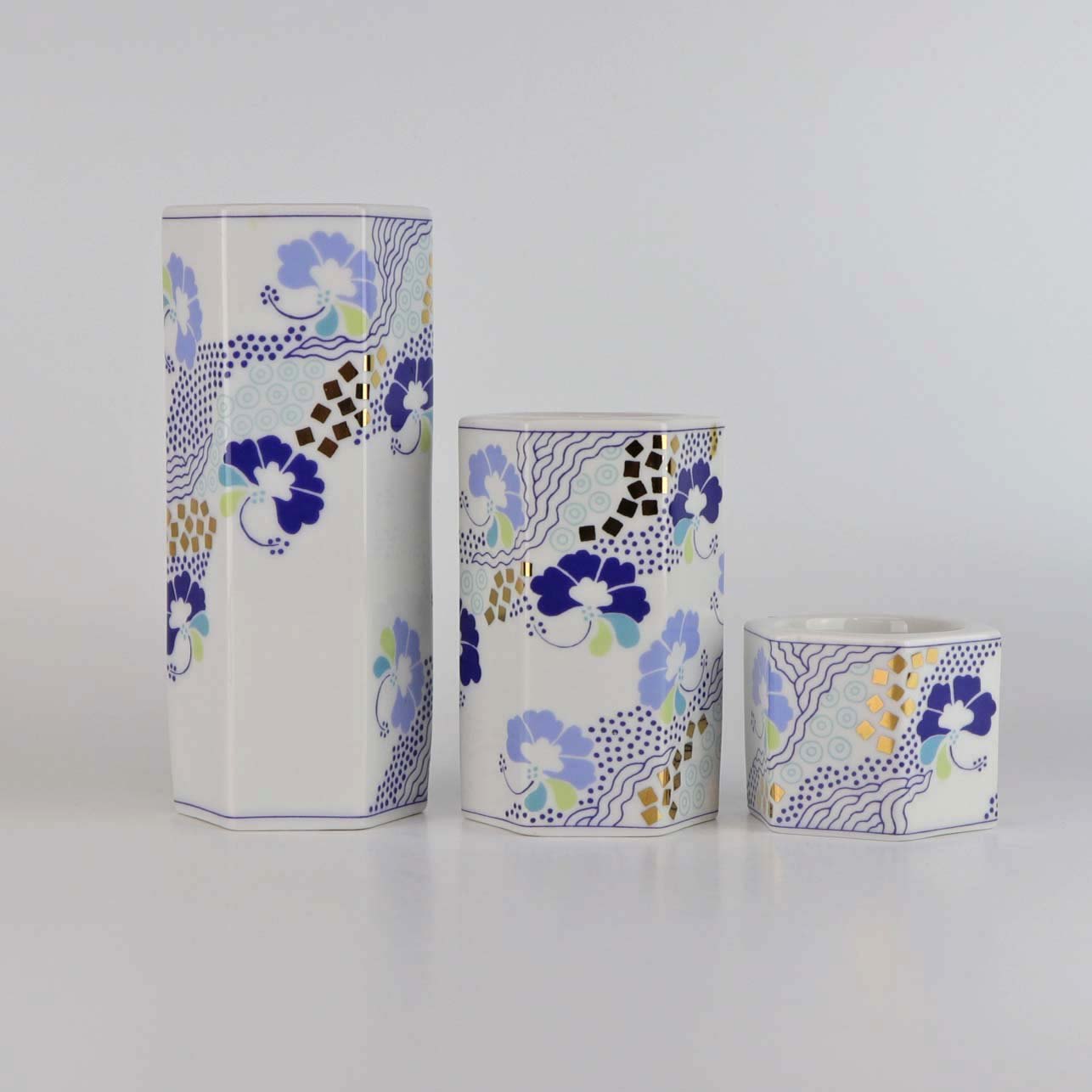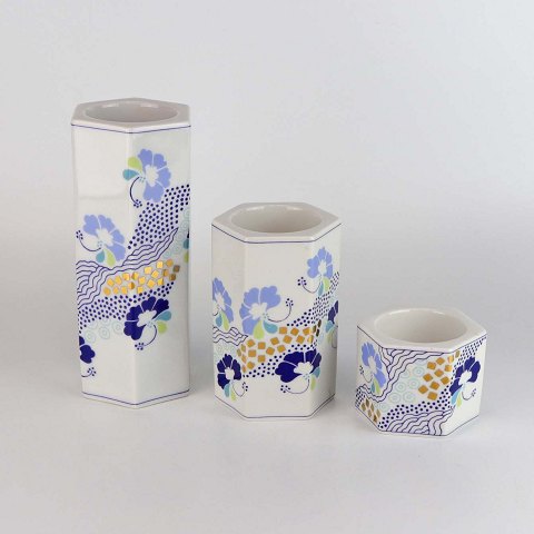 Et sæt i hvidt porcelæn med tre fyrfadsstager i tre forskellige højder. Sættet er i blå og grøn streg dekoreret med blomster og guld motiv. Nr. 1 016 466, 1817/6465 og 1817/5464
