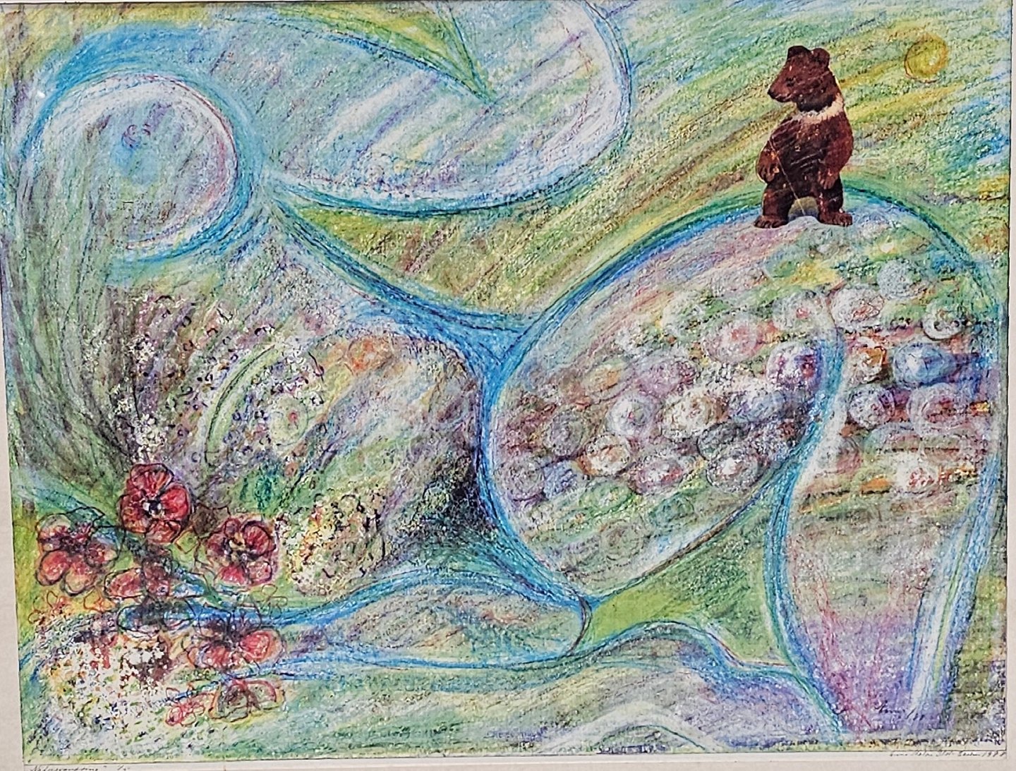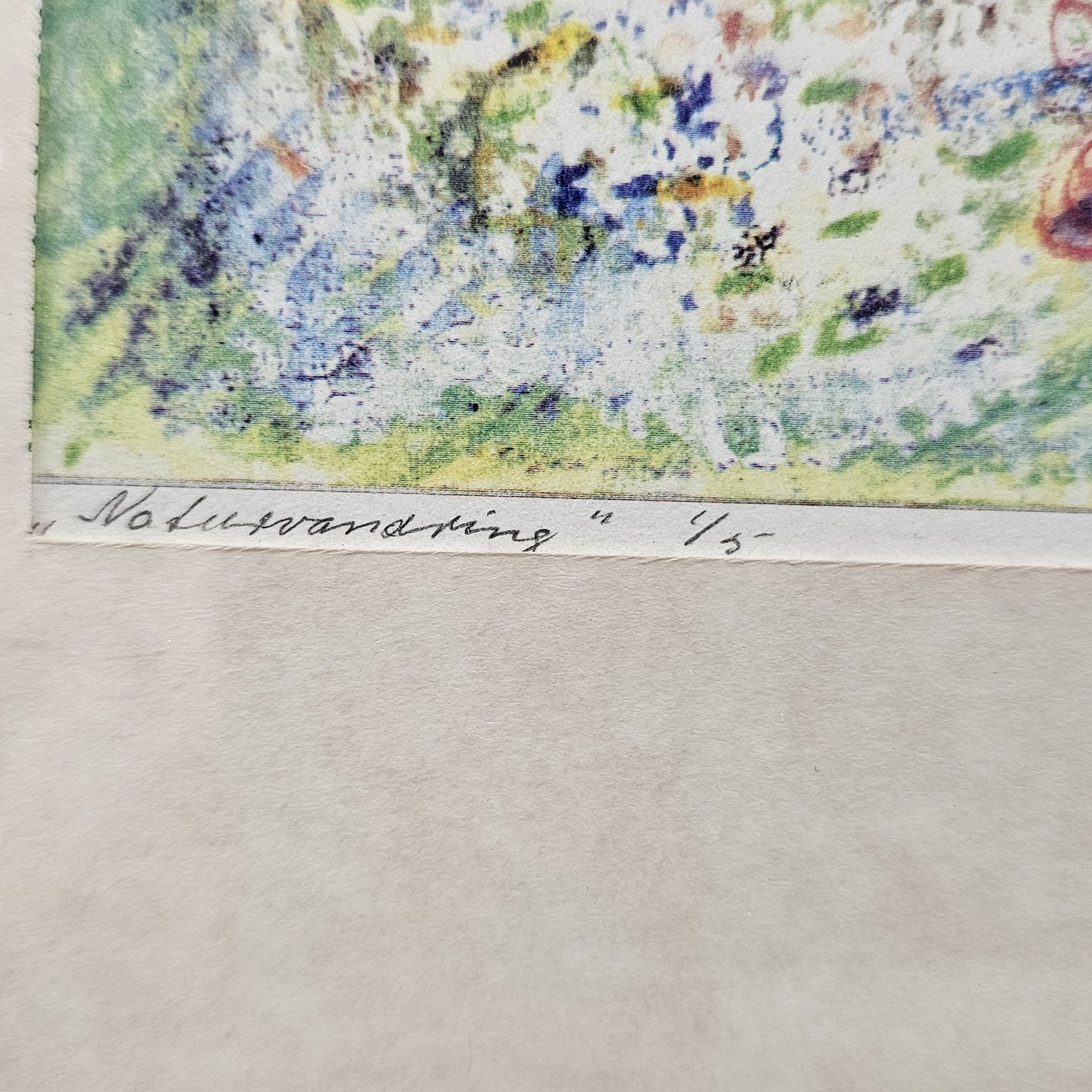 Litografi sat i glas og ramme. Med abstrakt motiv af en nøgen krop og en bjørn.
