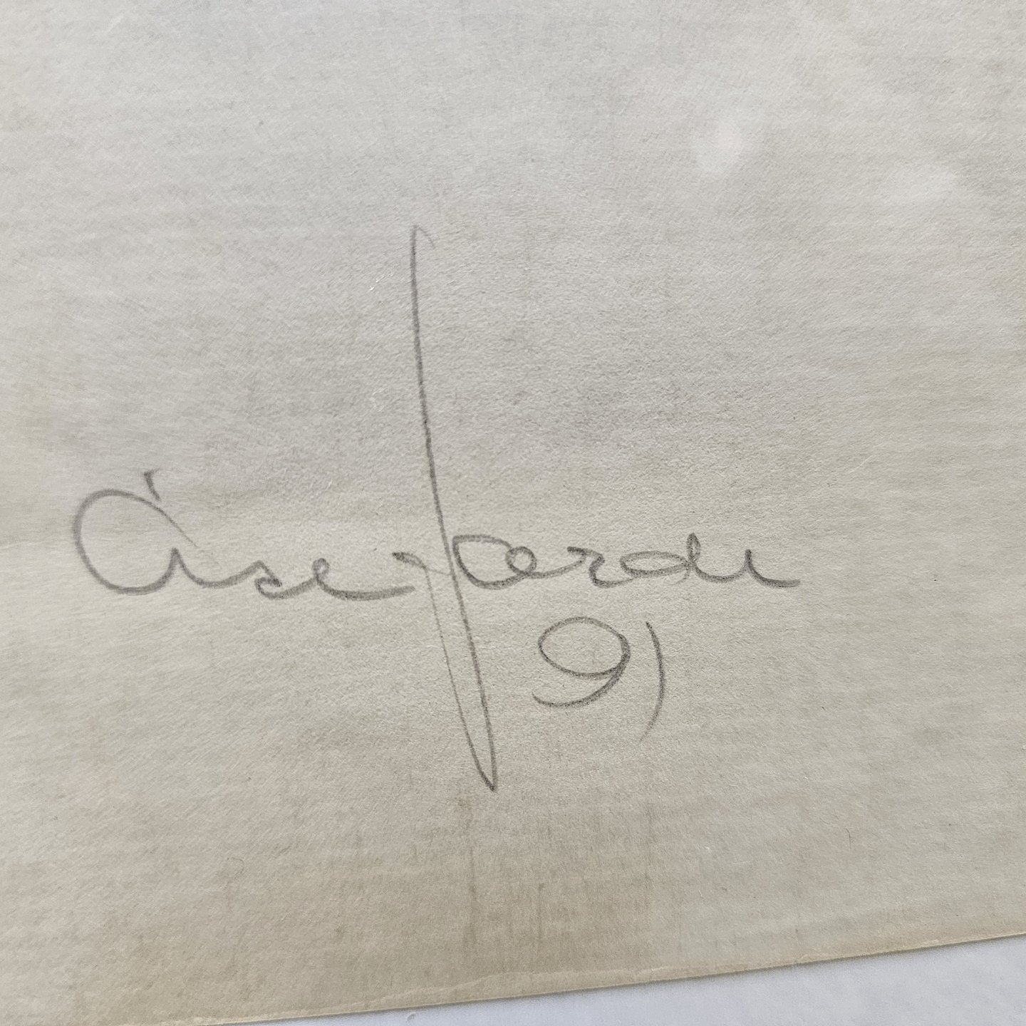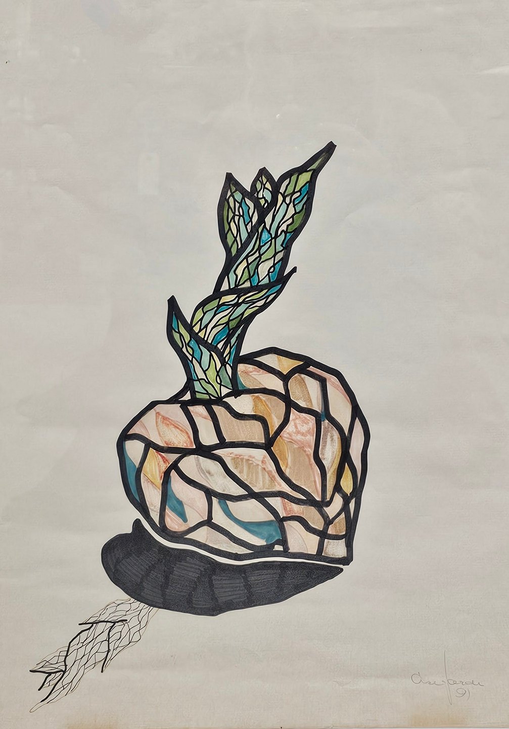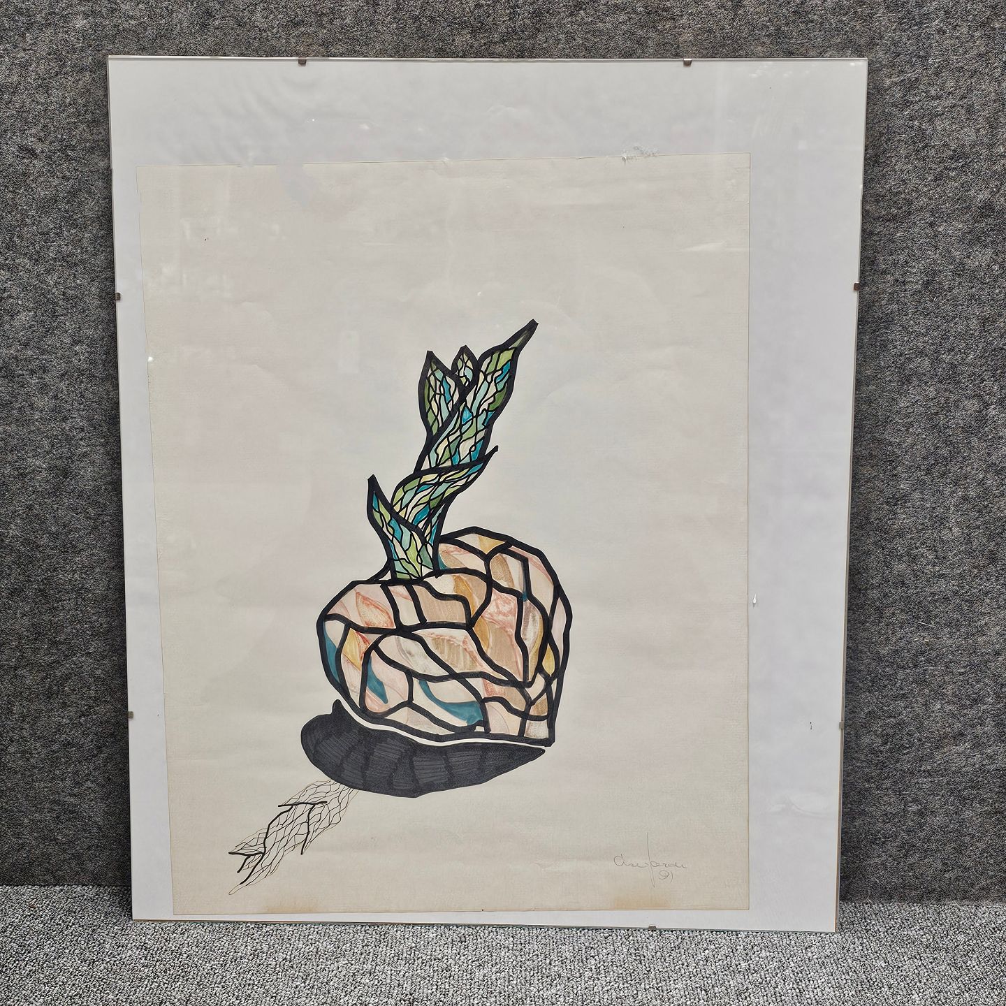 Tusch tegning, sat i ramme med glas, med motiv af et spirende frø.