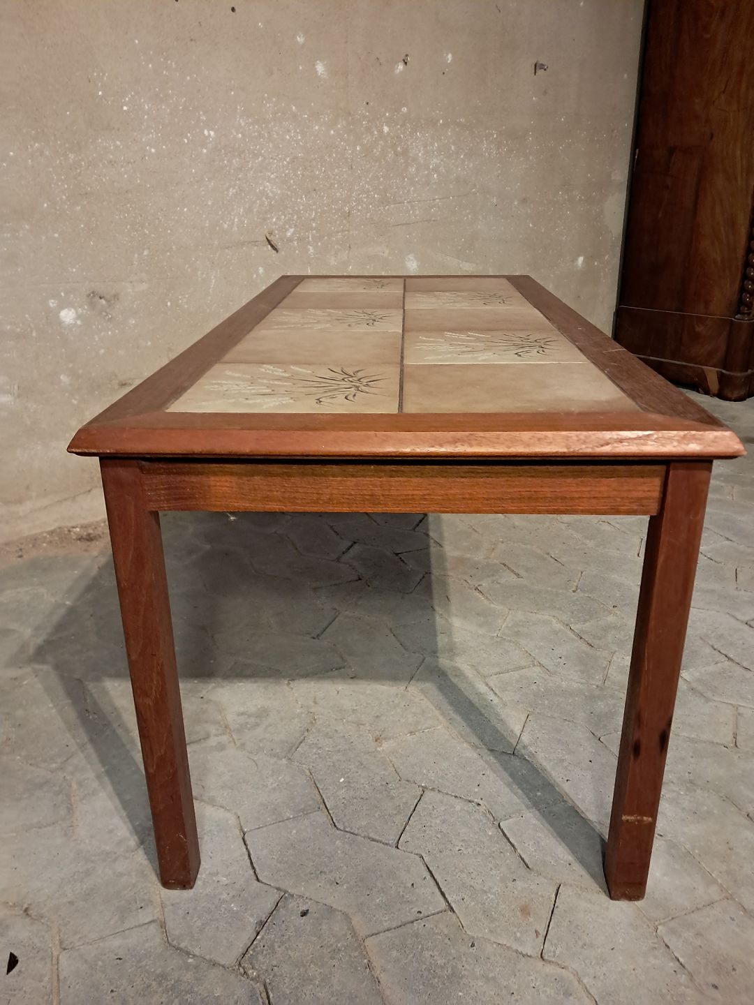 Sofabord i fineret teaktræ med kakler, fra 1960erne.