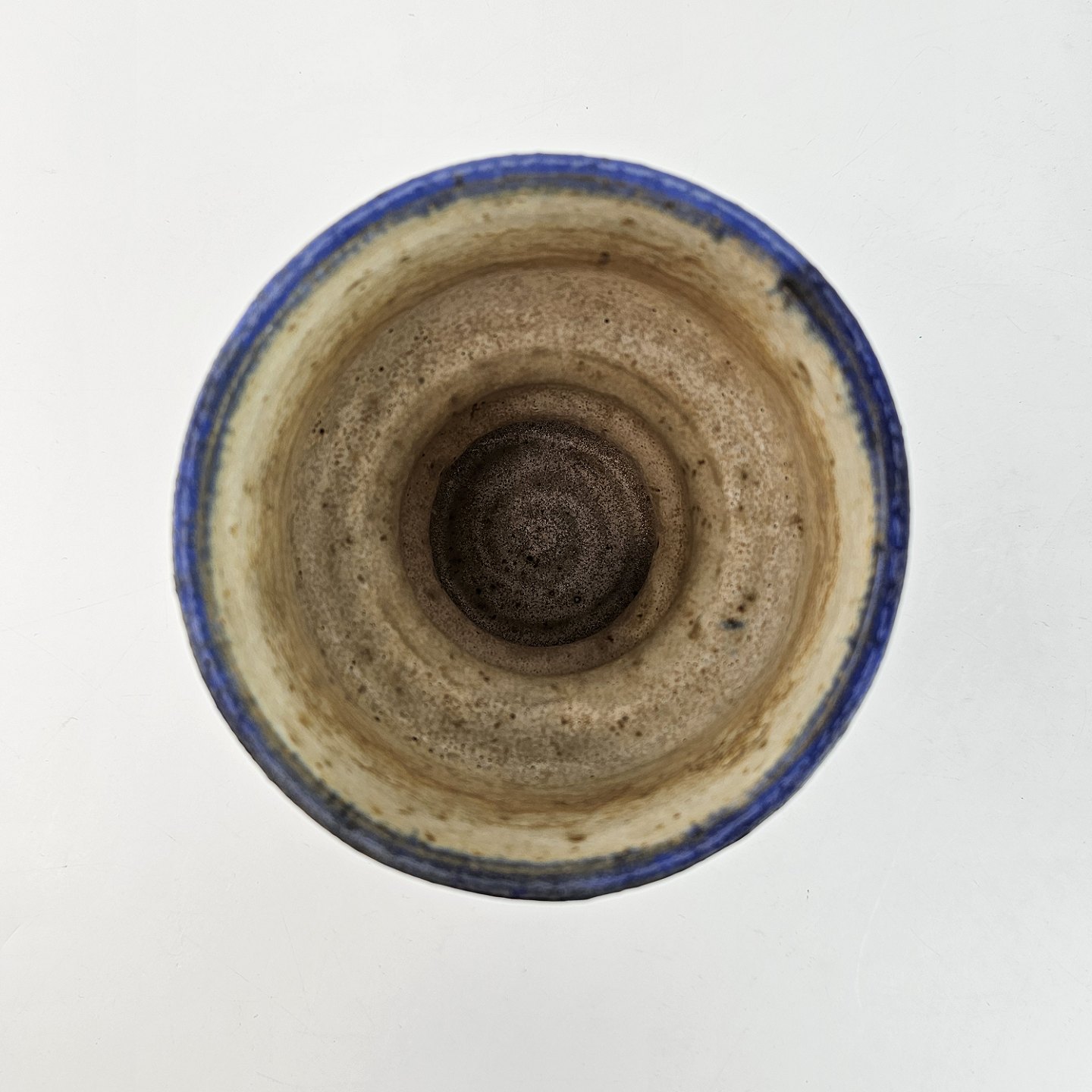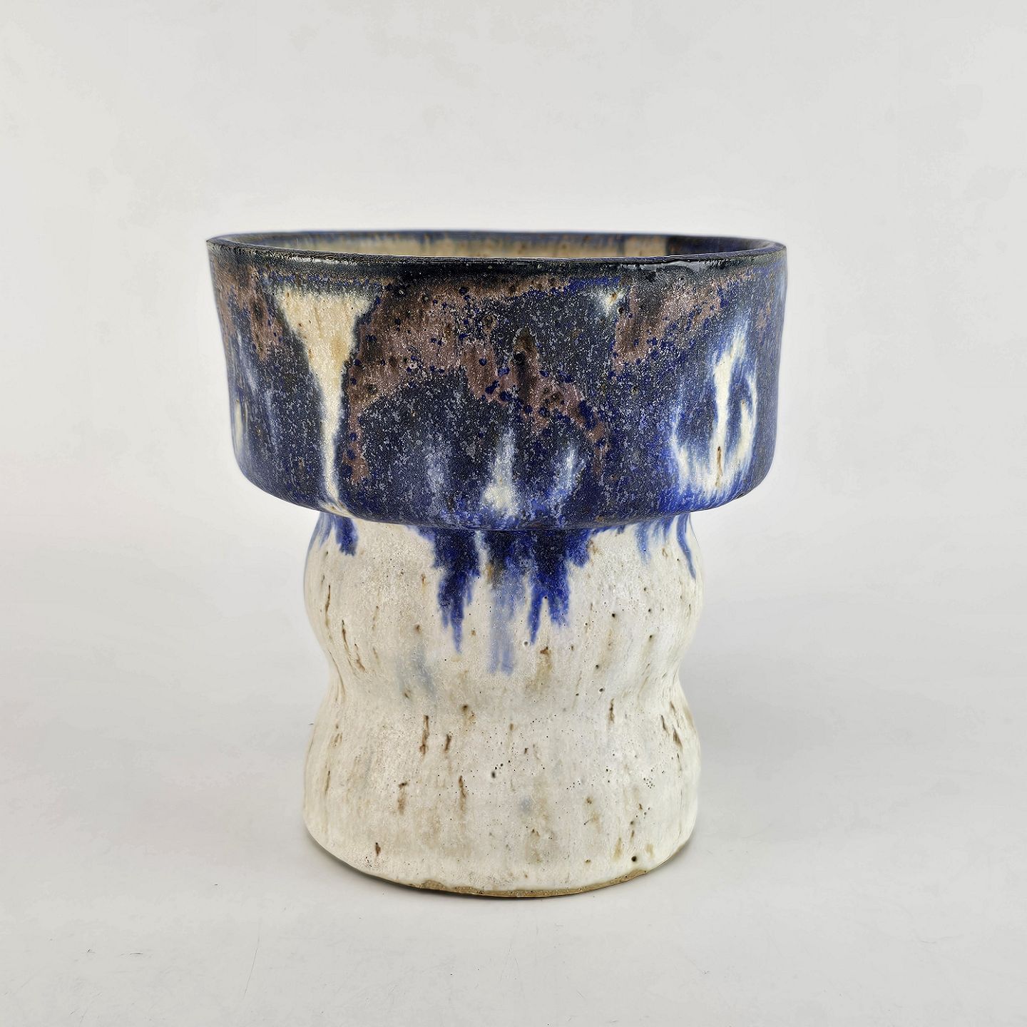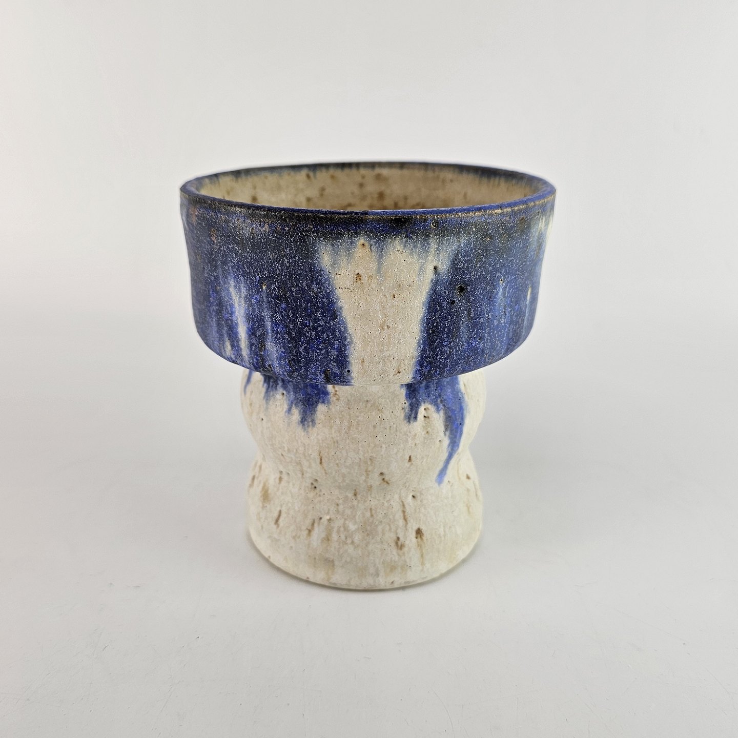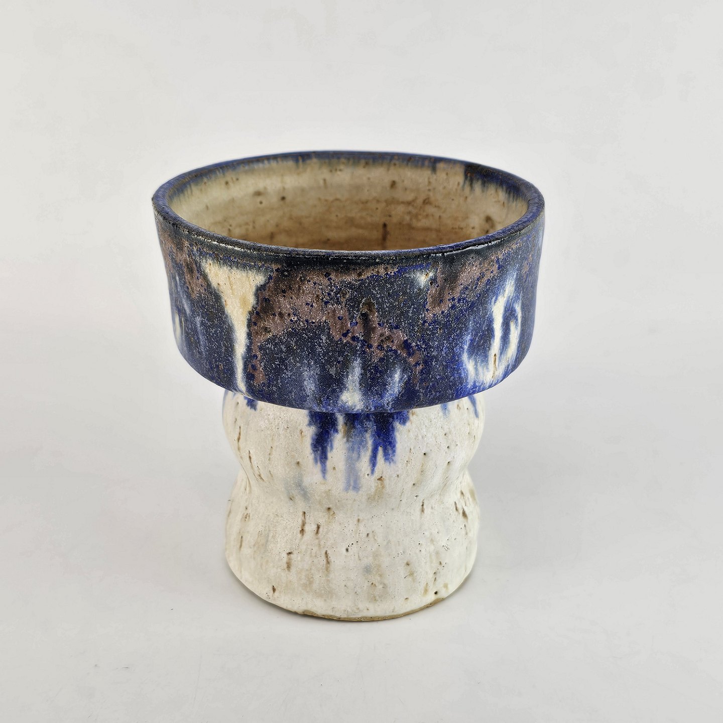 Krukke af stentøj, med to etager, i hvide og blå nuancer.