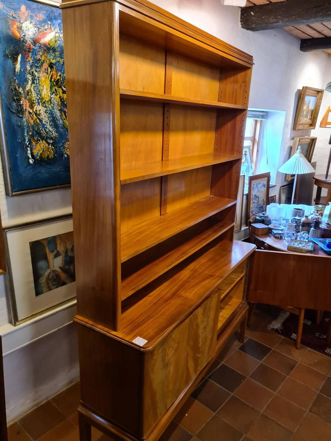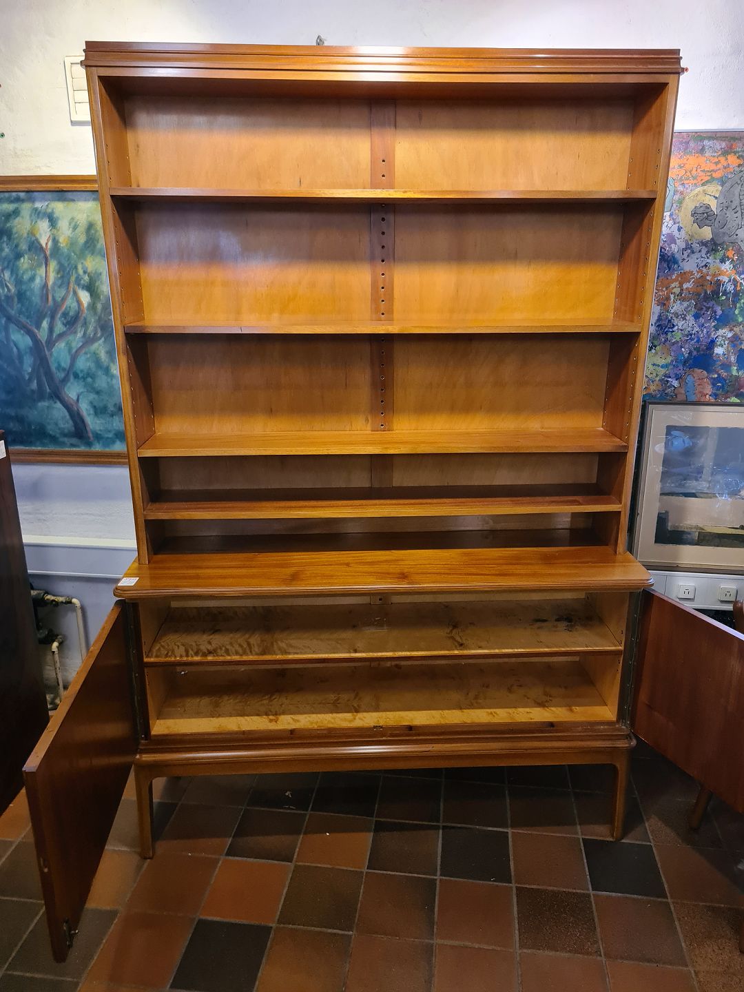 Dansk snedkermester reol med underskab udført i delvis massiv og fineret mahogni.