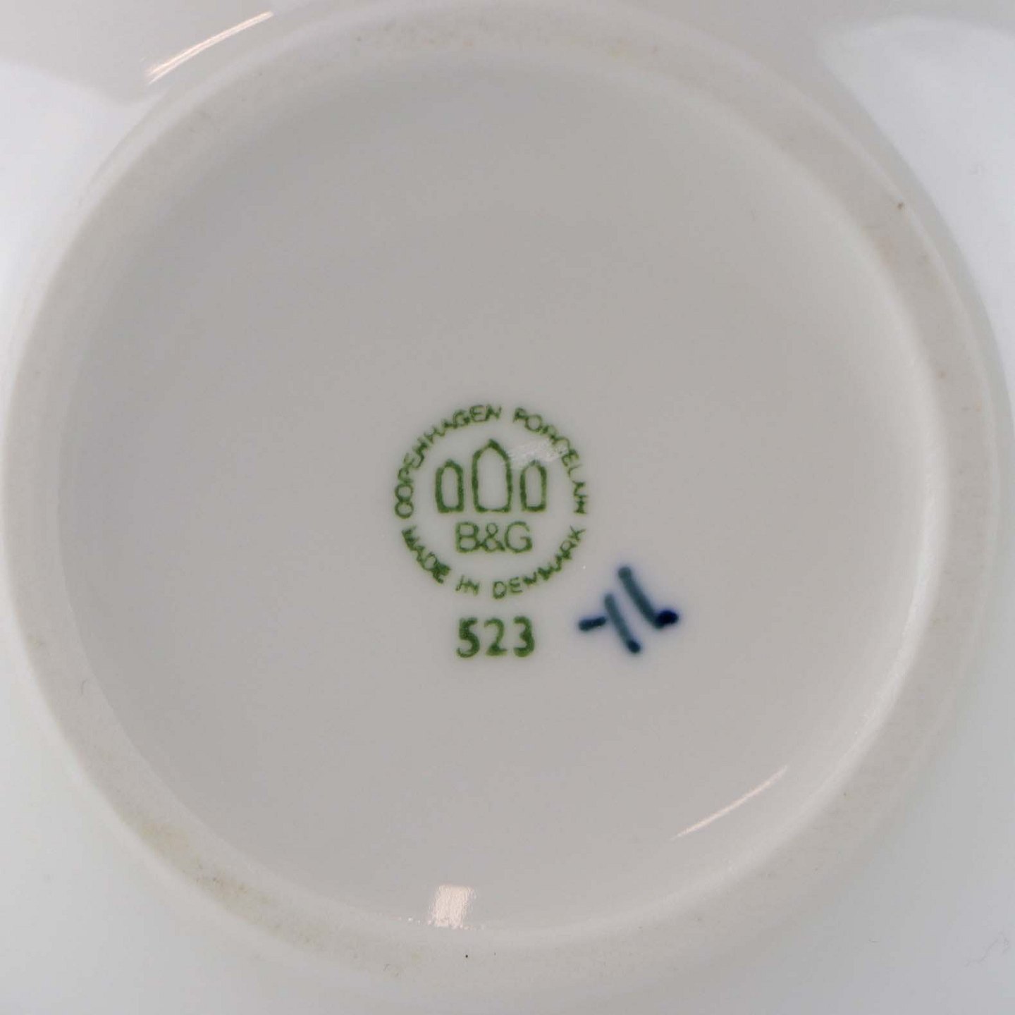 Service i glat hvidt porcelæn med dekoration i blå steg og motiv af vintergækker.