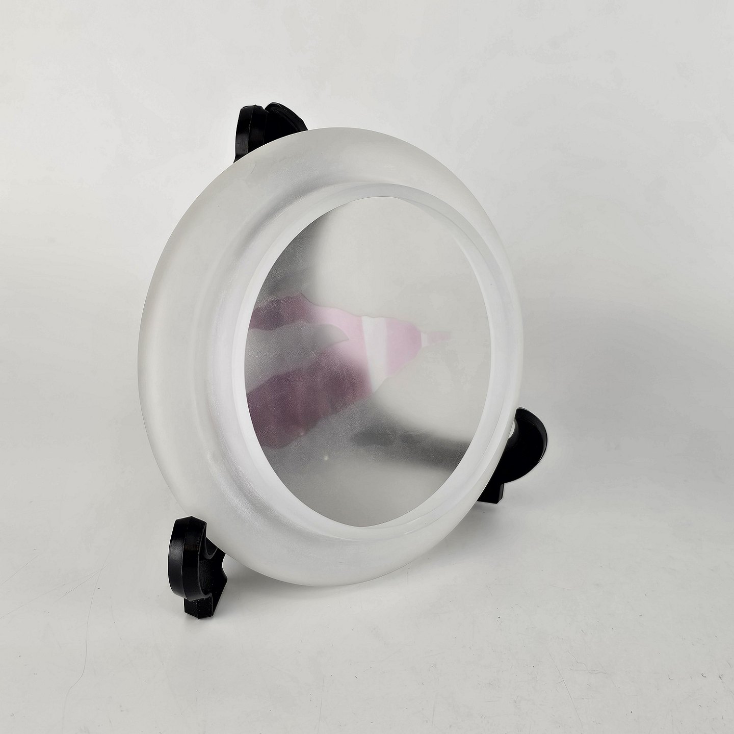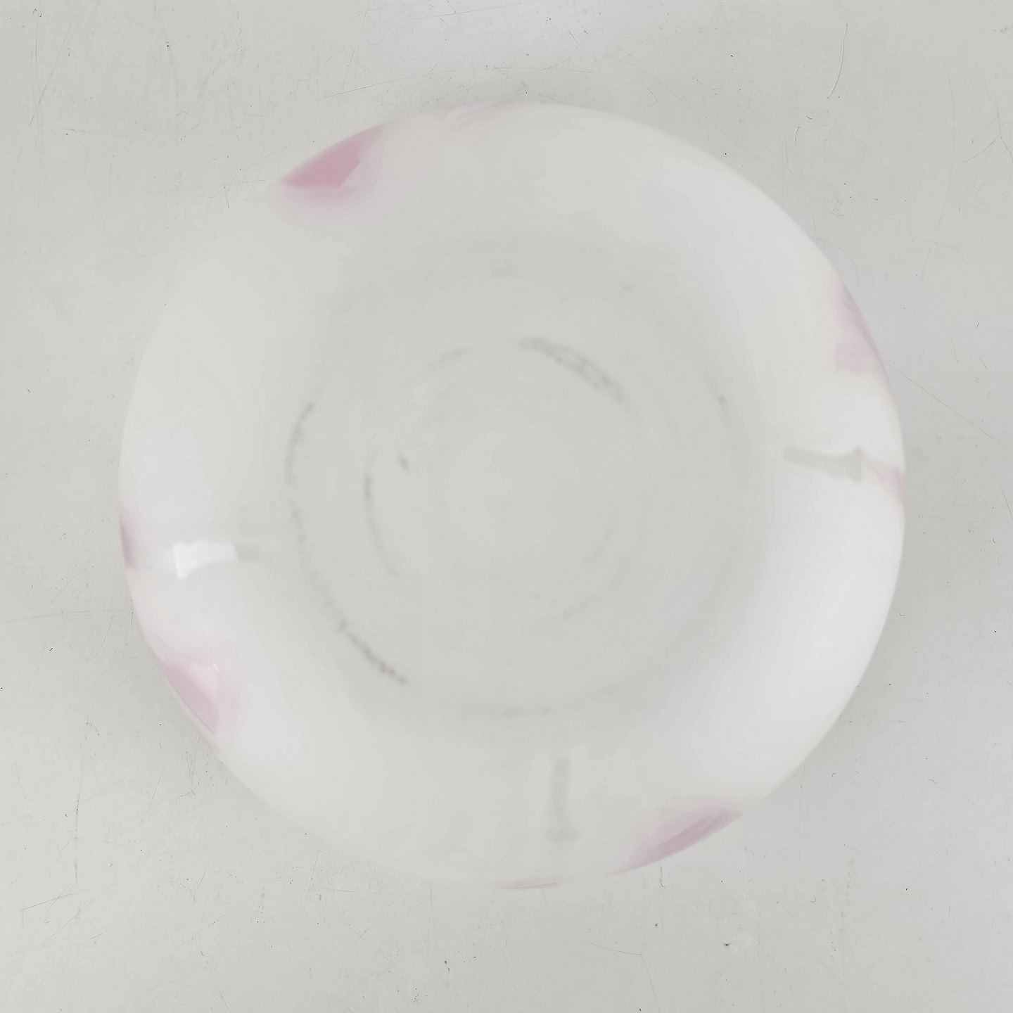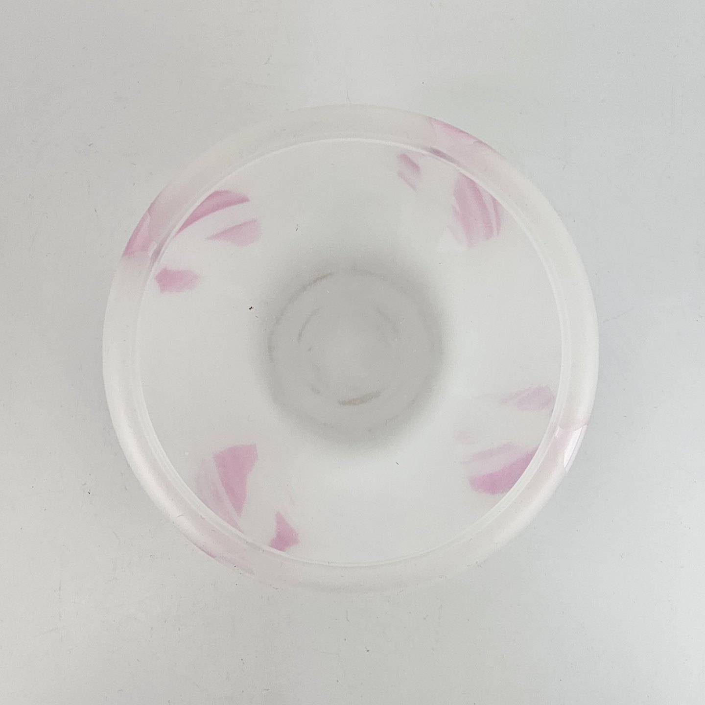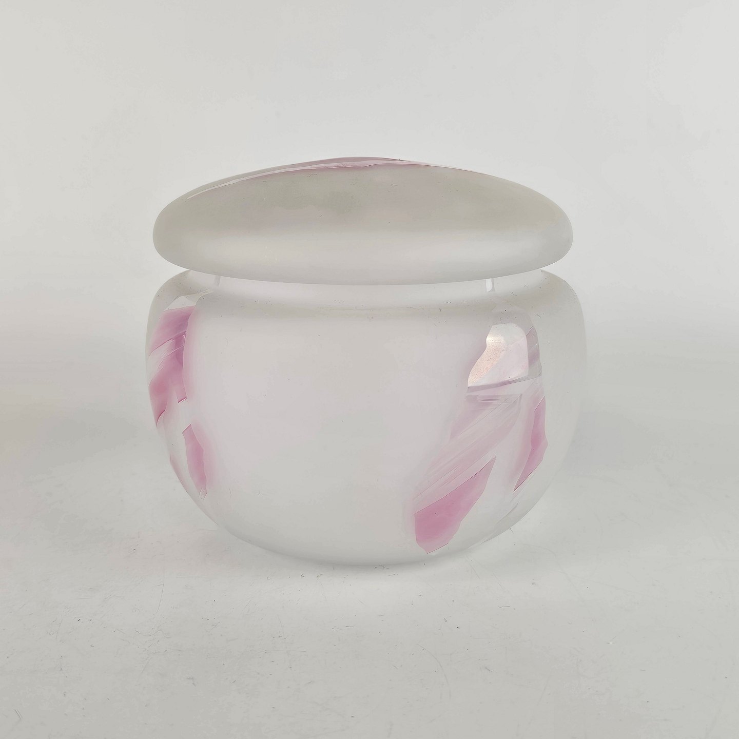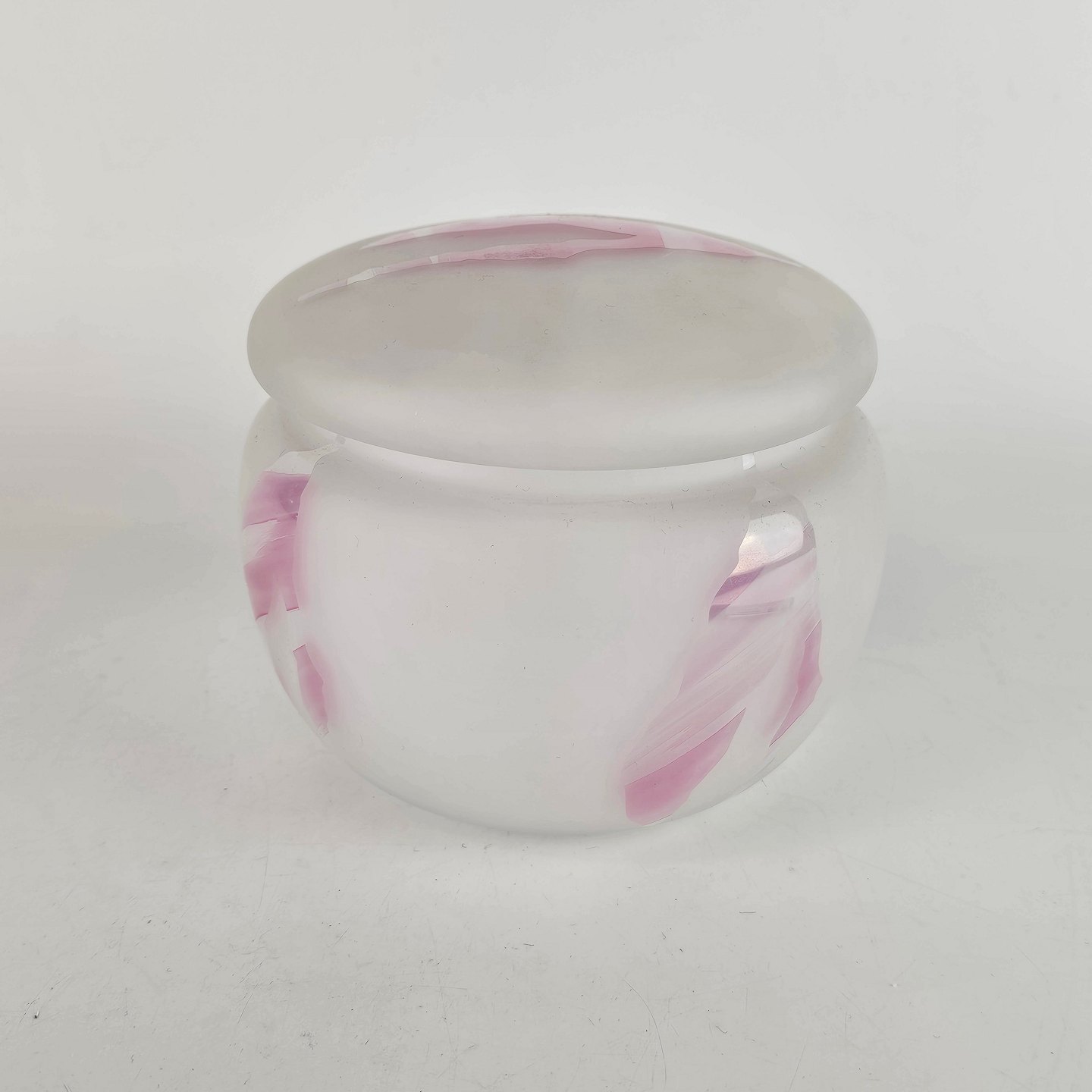 Krukke med låg, af matteret glas, med lyserøde detaljer.