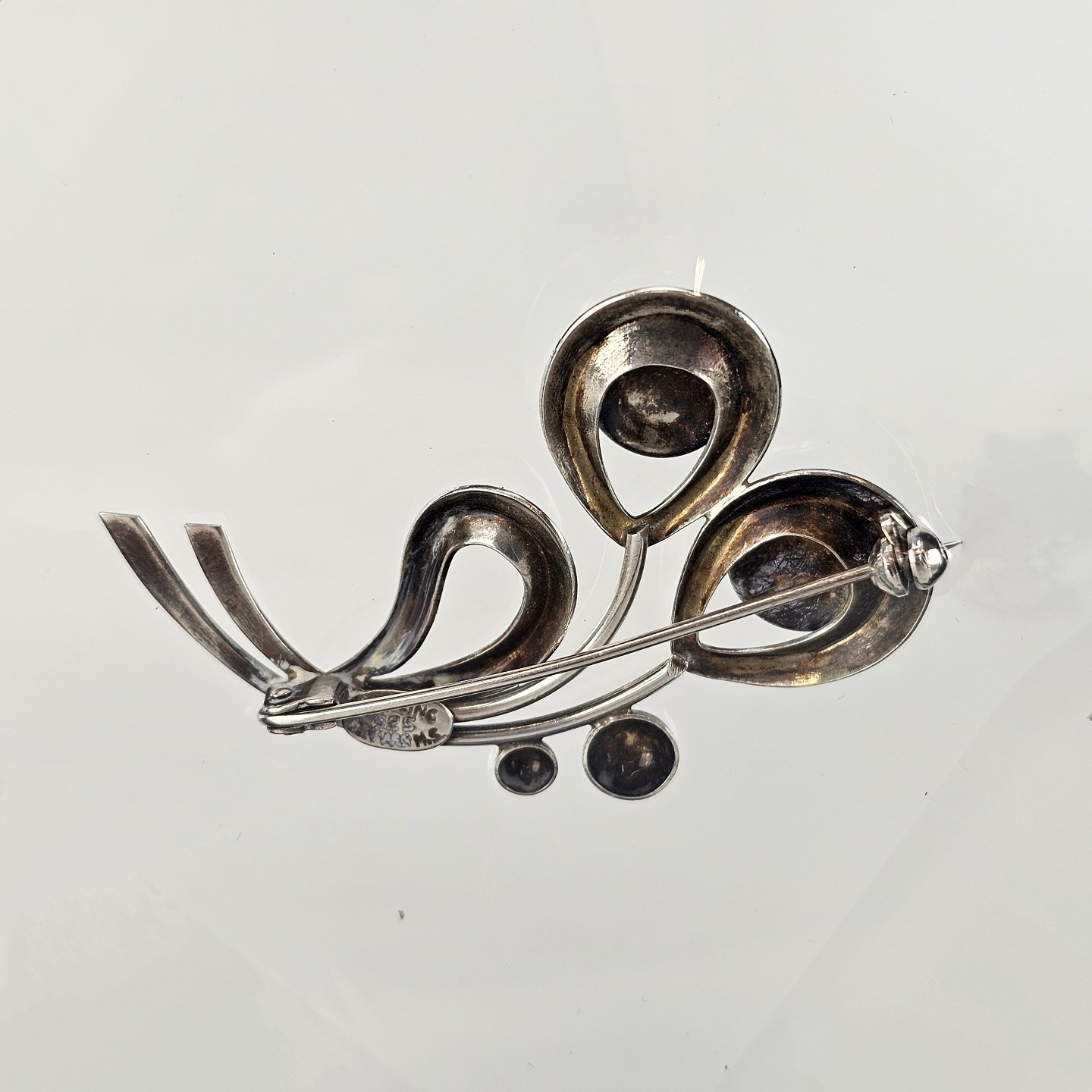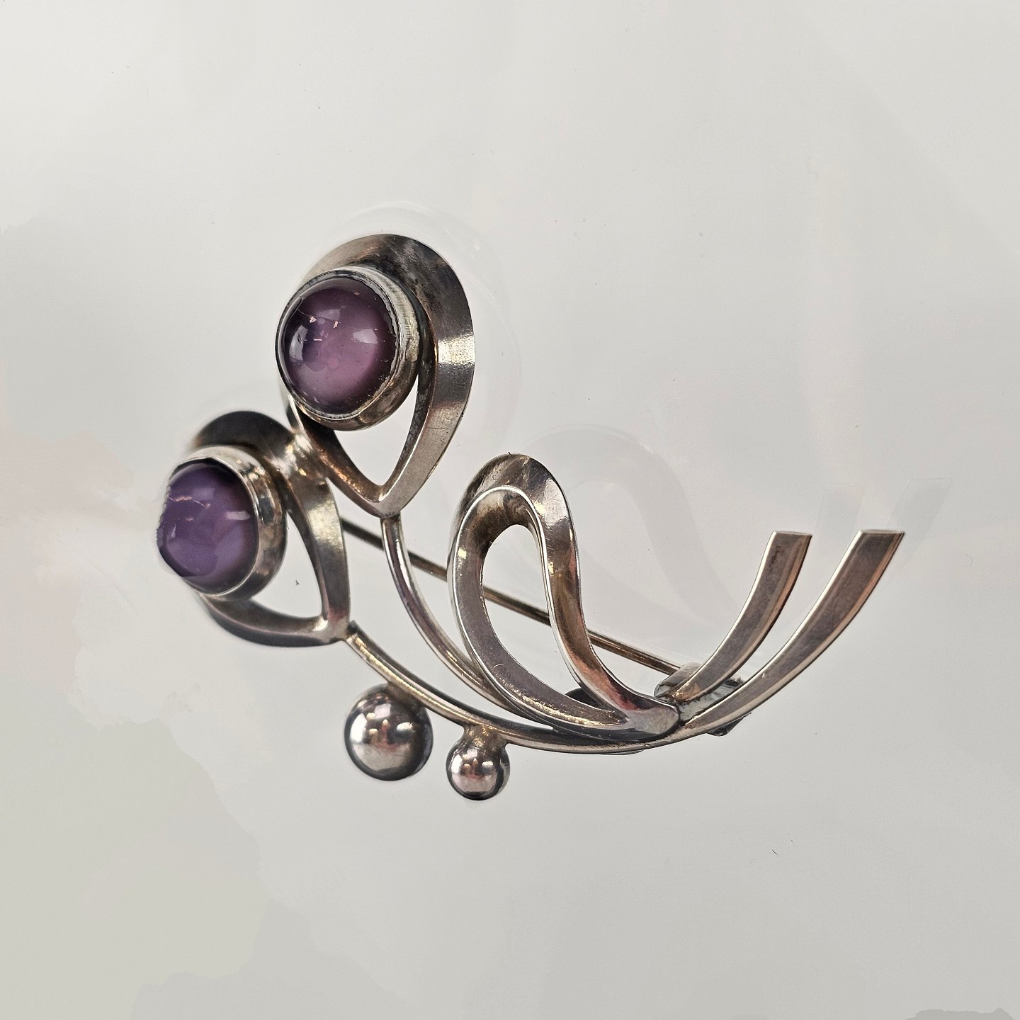 Broche af 925 sølv med to indsatte sten af lilla glas. Abstrakt blomstermotiv med blad og to kugler.